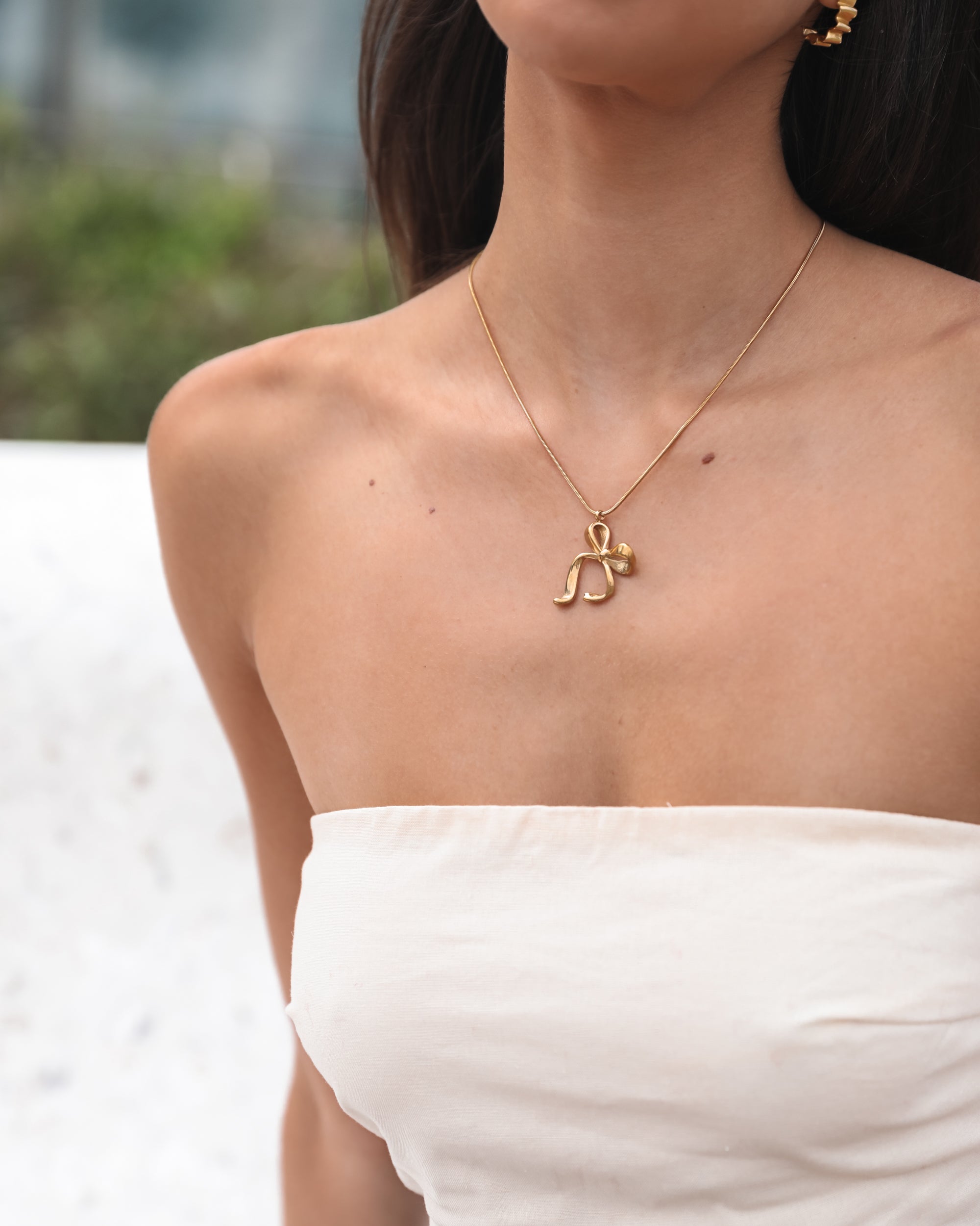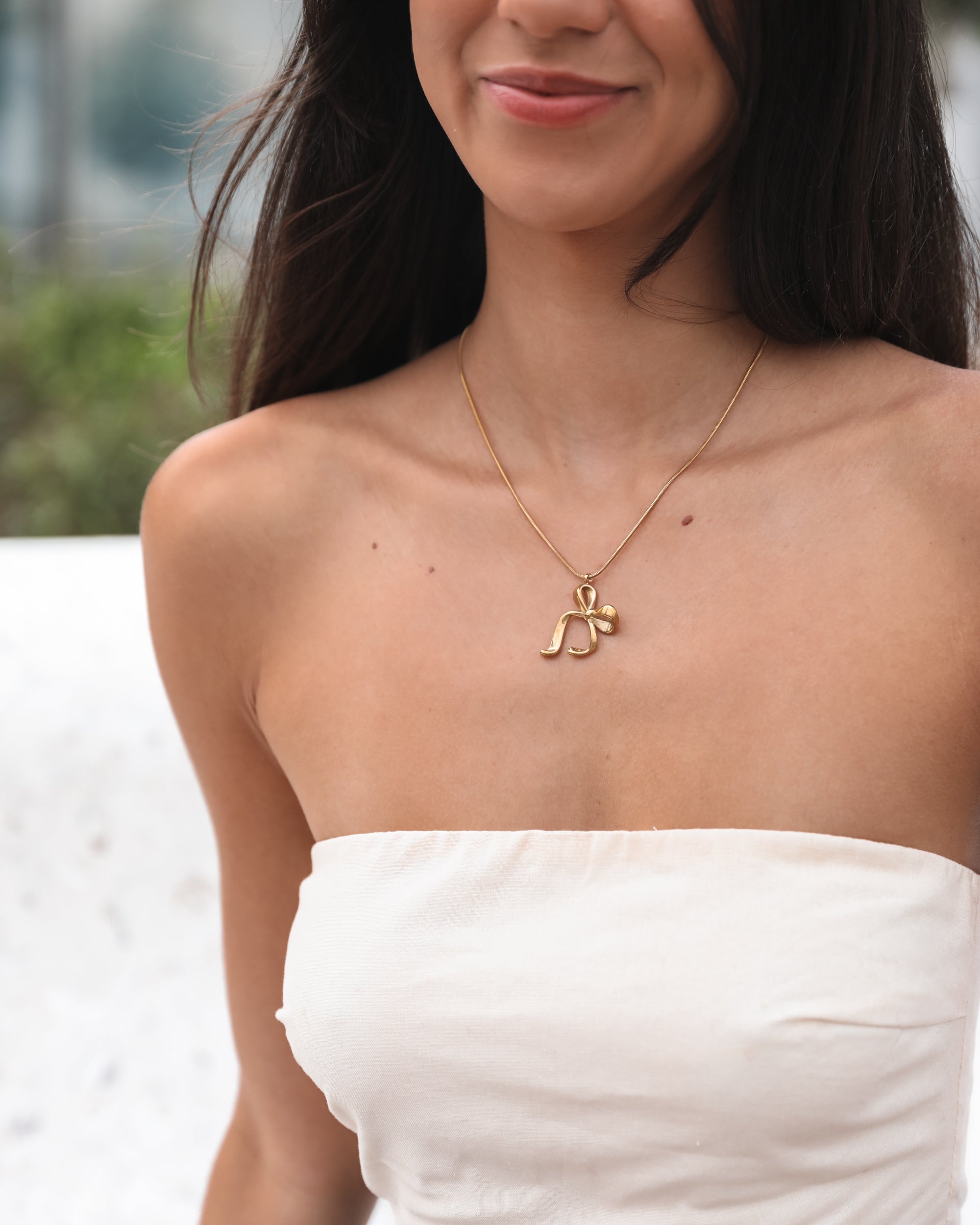 Our Maisha Necklace comes in a gold colour. Undeniably chic, this treasure sits beautifully at the collarbone and features a chain and bow-shaped pendant. Style with a silky slip dress for an ultra-feminine look!