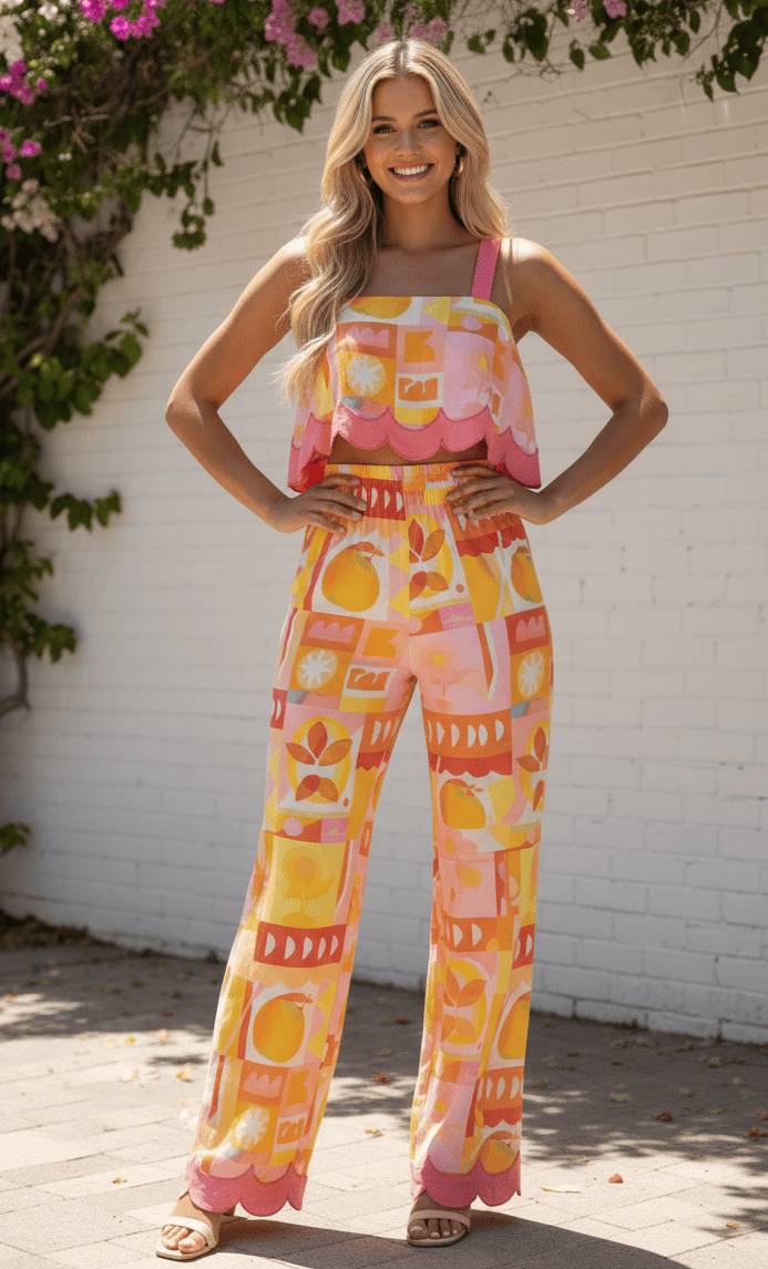 Crafted from a lightweight and breathable fabric, the Mireille Top - Multi features an exclusive, eye-catching multi-print with delightful citrus and abstract motifs in a cheerful palette of pinks, yellows, and oranges. The scalloped hem adds a whimsical touch, while the comfortable straps ensure a perfect fit for sun-drenched days and balmy evenings.