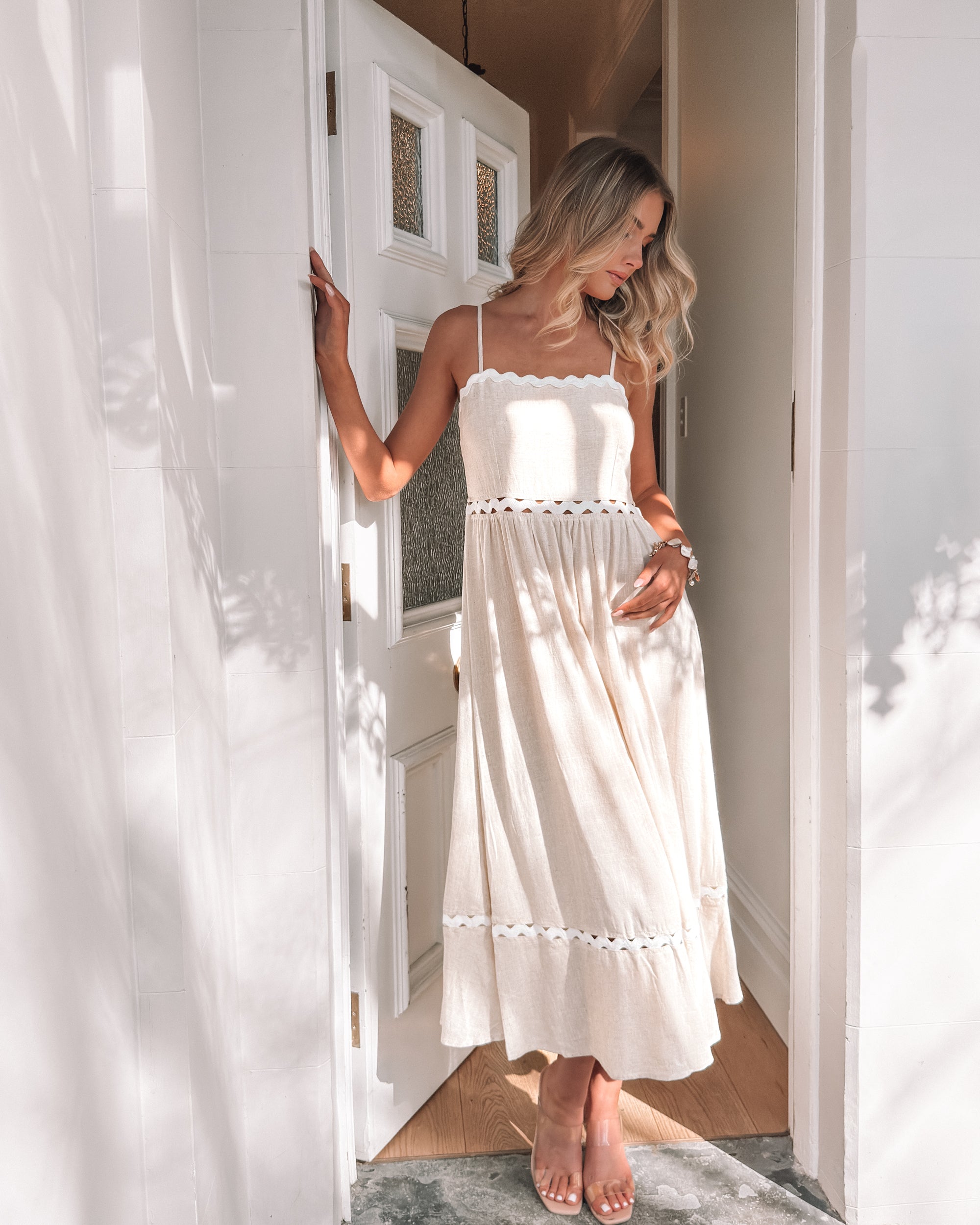 Our Shameeka Dress comes in cream and white tones. Your statement-maker for both brunch and golden hour strolls, this piece is designed with spaghetti straps, square neckline, curve lace inserts, flowy a-line skirt and midaxi length hem. Style it with soft waves on your hair, nude lace-up sandals and a spritz of your signature scent!