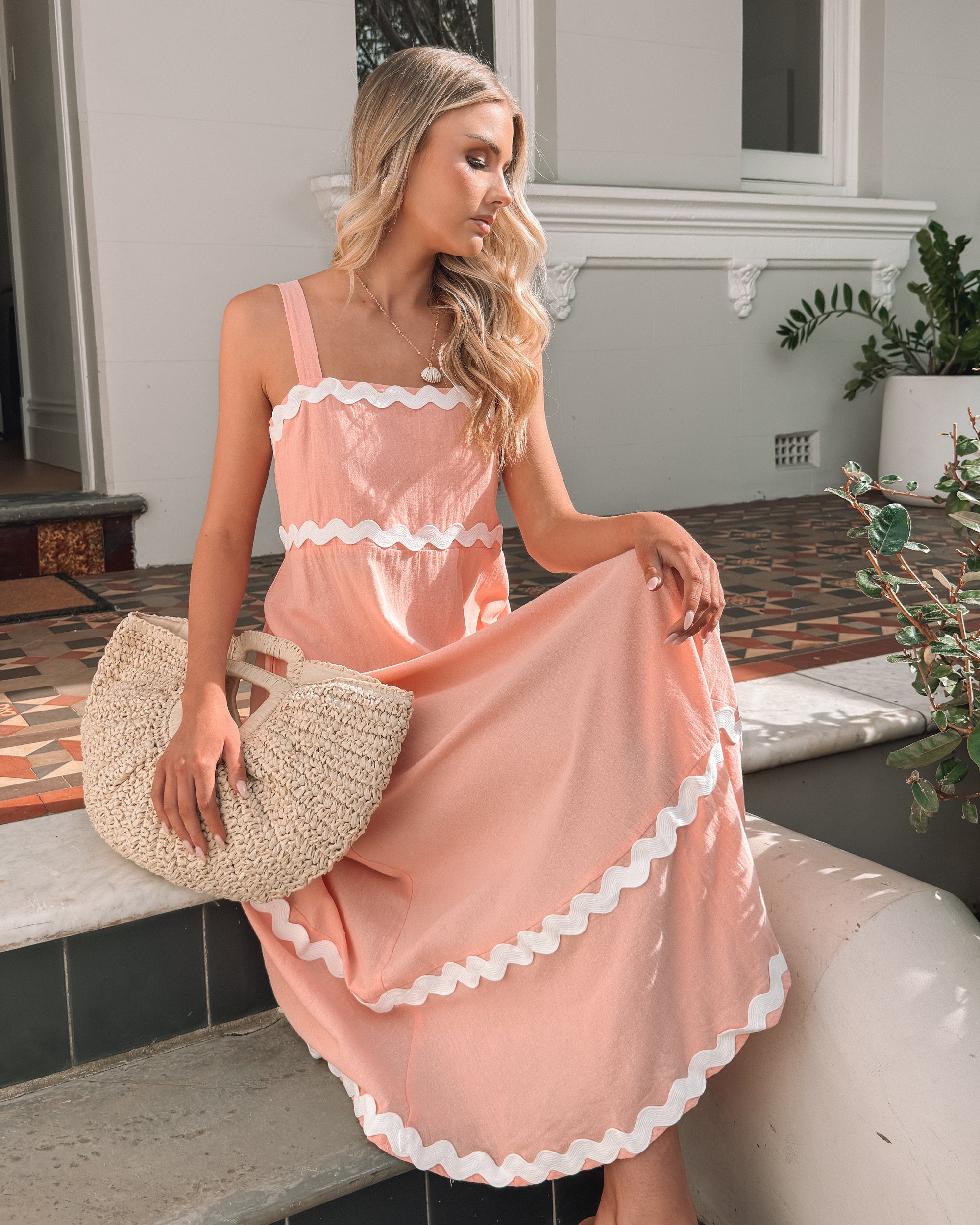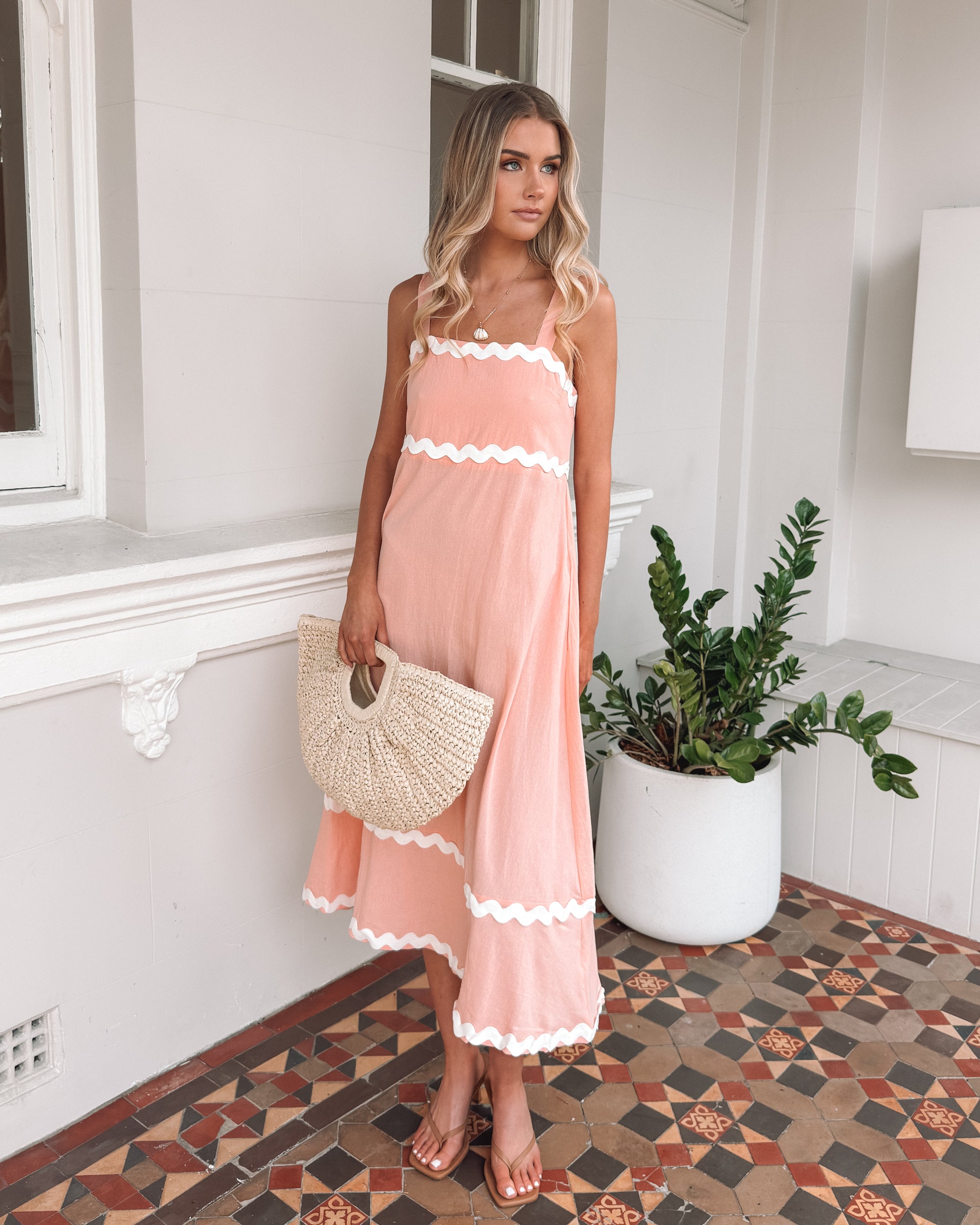 Our Zarienne Dress comes in pink and white tones. A stunning visual that seamlessly blends subtle sophistication with a touch of playful complexity, this piece is designed with straps, square neckline, flowy a-line skirt and midaxi length hem. Style it with a gold pendant necklace!