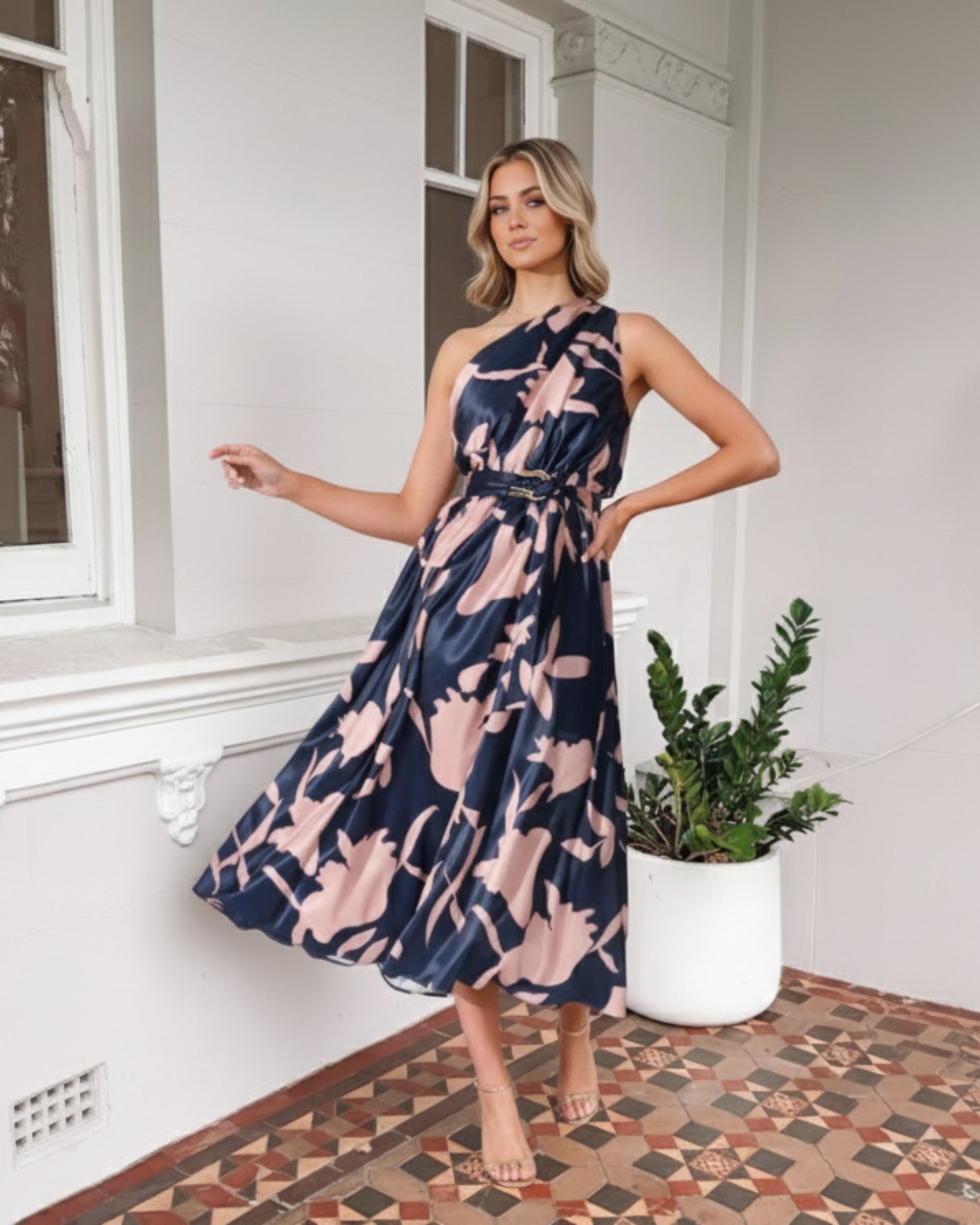 - Key Features: Chic one-shoulder neckline with subtle draping detail. Flattering, defined waist with a self-tie belt (or subtle buckle closure detail). Flowing A-line midi skirt. Sophisticated pink and red floral print set against a dark navy/black background. Fully lined for comfort and a smooth drape.