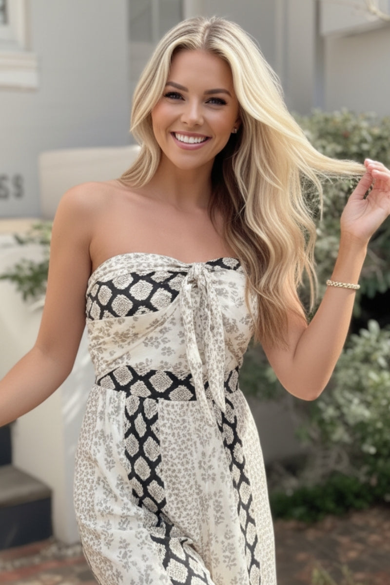 The Deshana Jumpsuit -Black Print is a stylish and comfortable choice for a chic, relaxed look. This strapless jumpsuit features a playful tie-front detail at the bust, a smocked back for a flexible fit, and a flattering wide-leg silhouette. Adorned with a sophisticated black, white, and neutral-toned bohemian-inspired print, it's perfect for effortless warm-weather fashion.