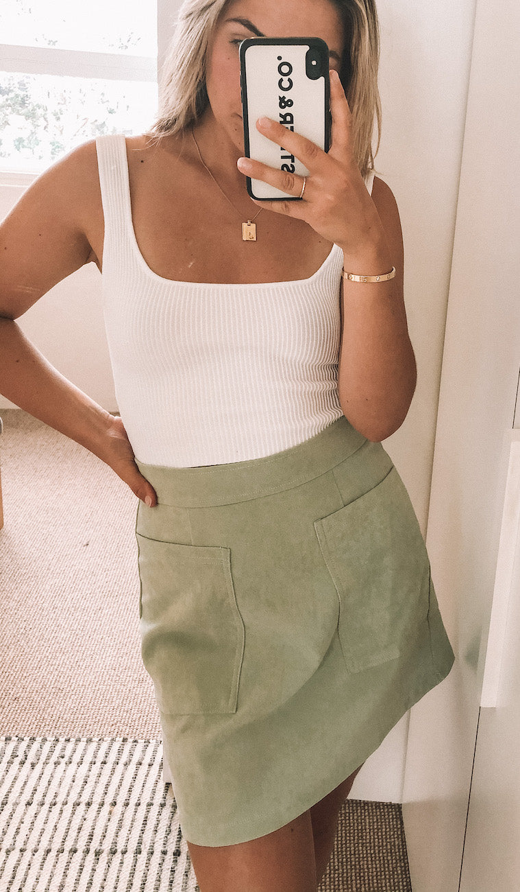 Our Amba Skirt comes in a gorgeous sage tone in a lightweight material. This fitted mini is great to pair with any crop for cute coffee dates with the girls. The Amba skirt will be perfect for the warmer days ahead!