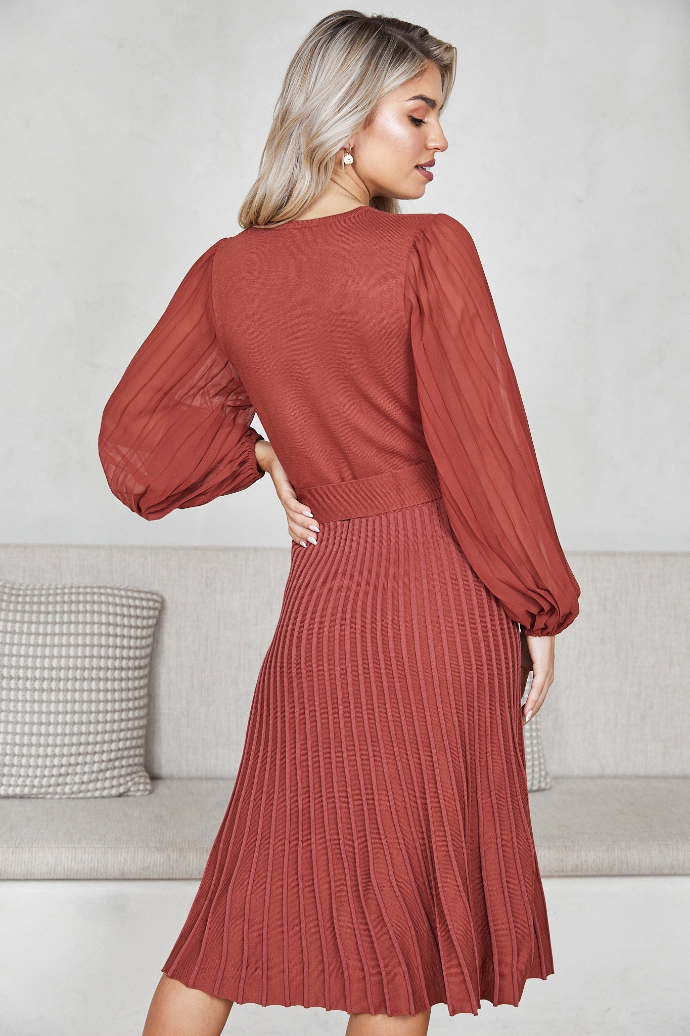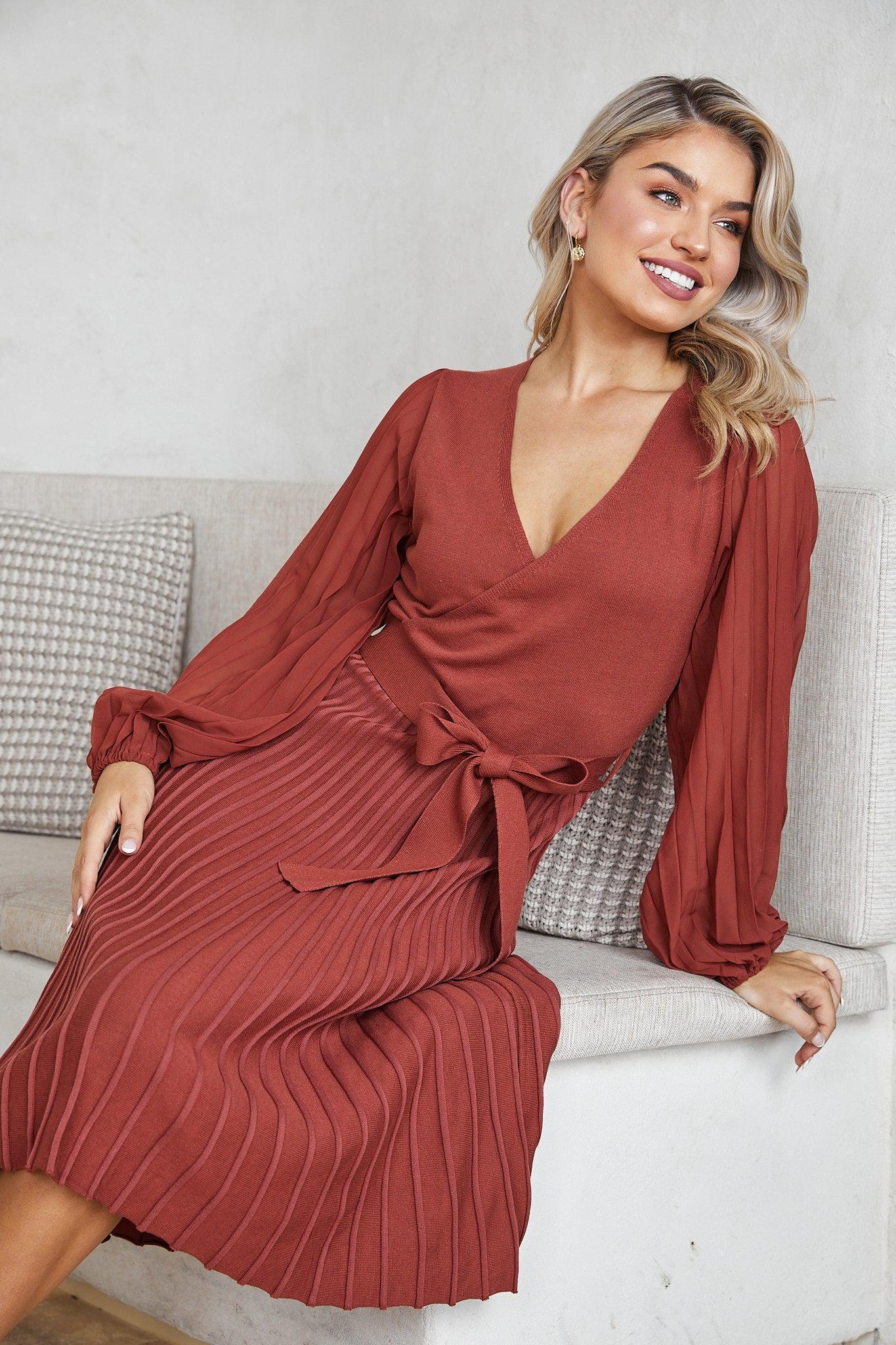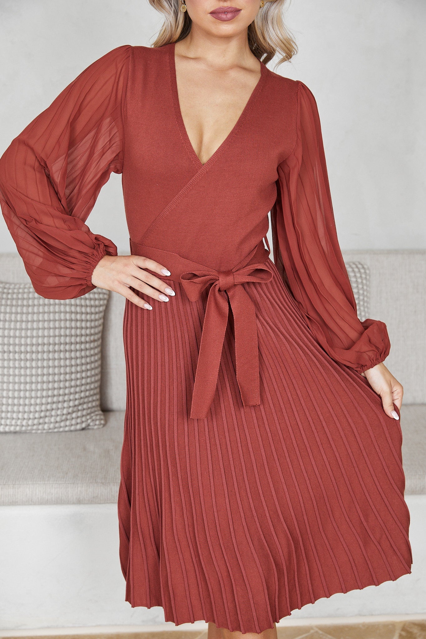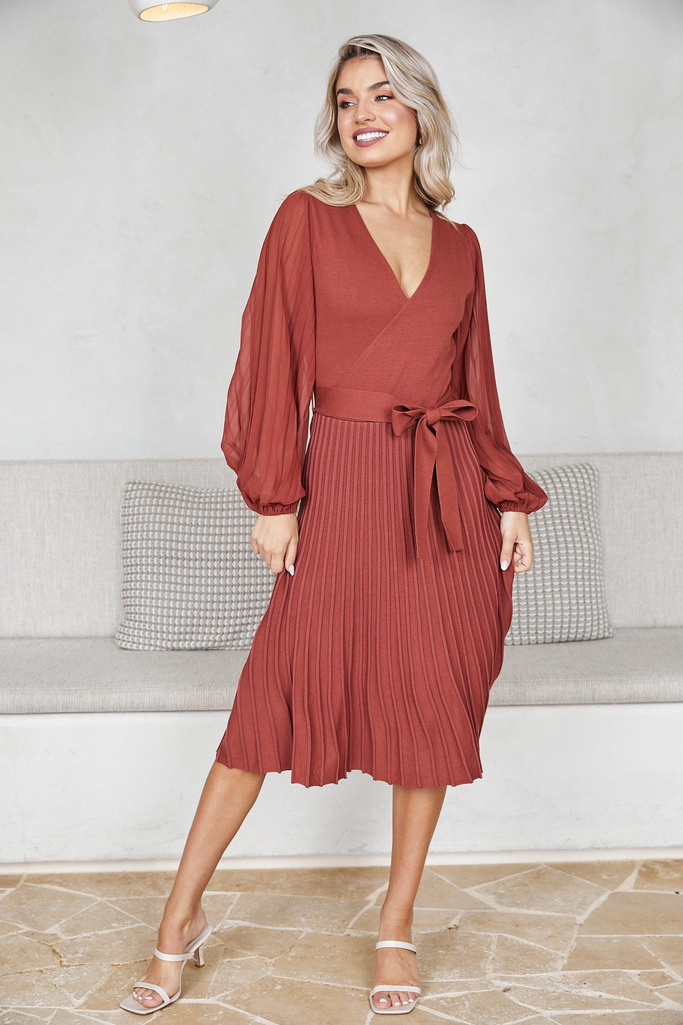 Our Abby Mae dress comes in a rust tone. This midi will add polish to your new-season wardrobe - and it will work whatever occasion you're dressing for. This style comes in a v -neckline, Long sleeves and an irresistible skirt that has been softly pleated. Wear with heels for a more relaxed feel on weekends.