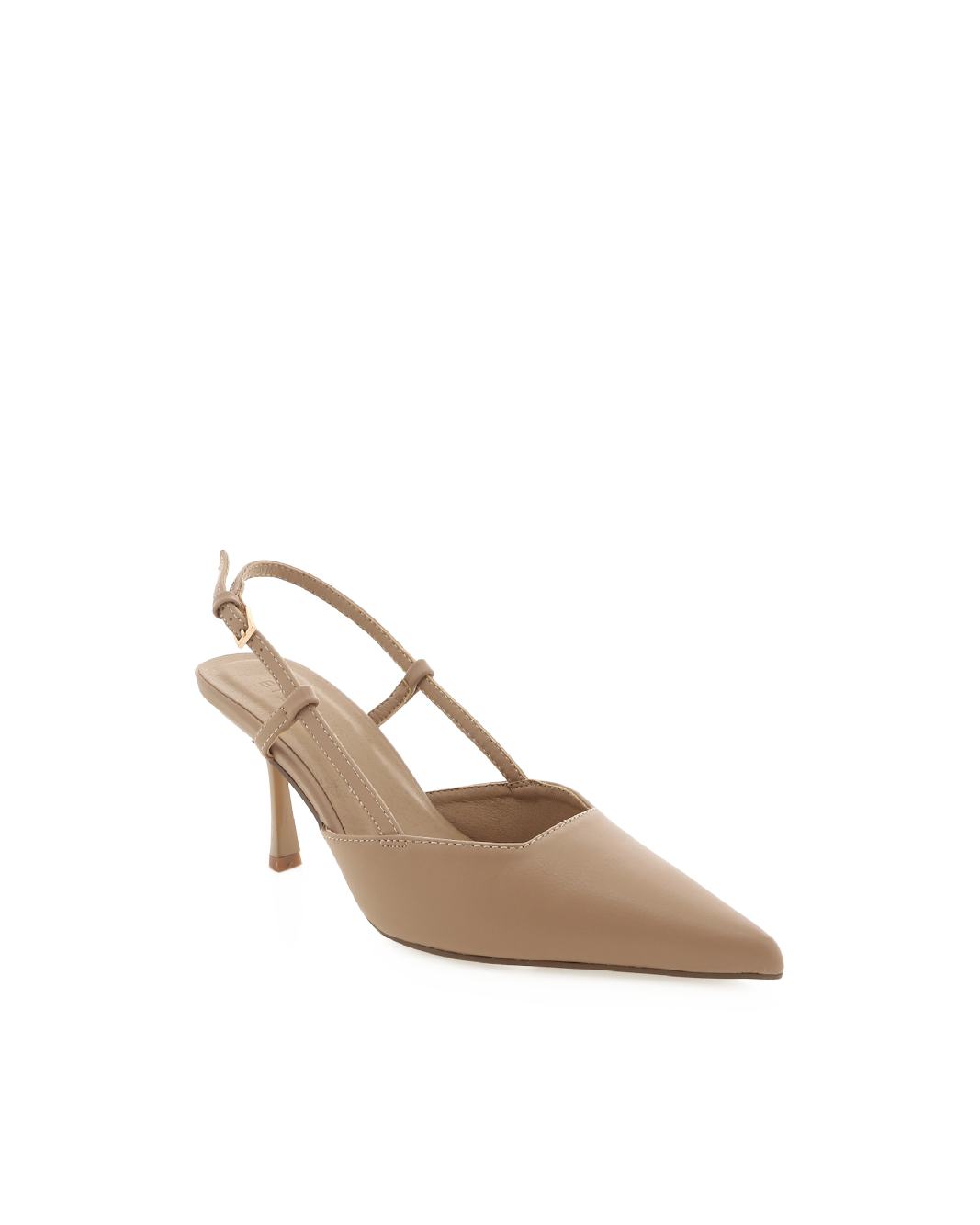 - Key Features: Mid, kicked in stiletto heel. Closed pointed toe. Court style upper. Sling back ankle strap with adjustable buckle fastening. Exposed heel counter.