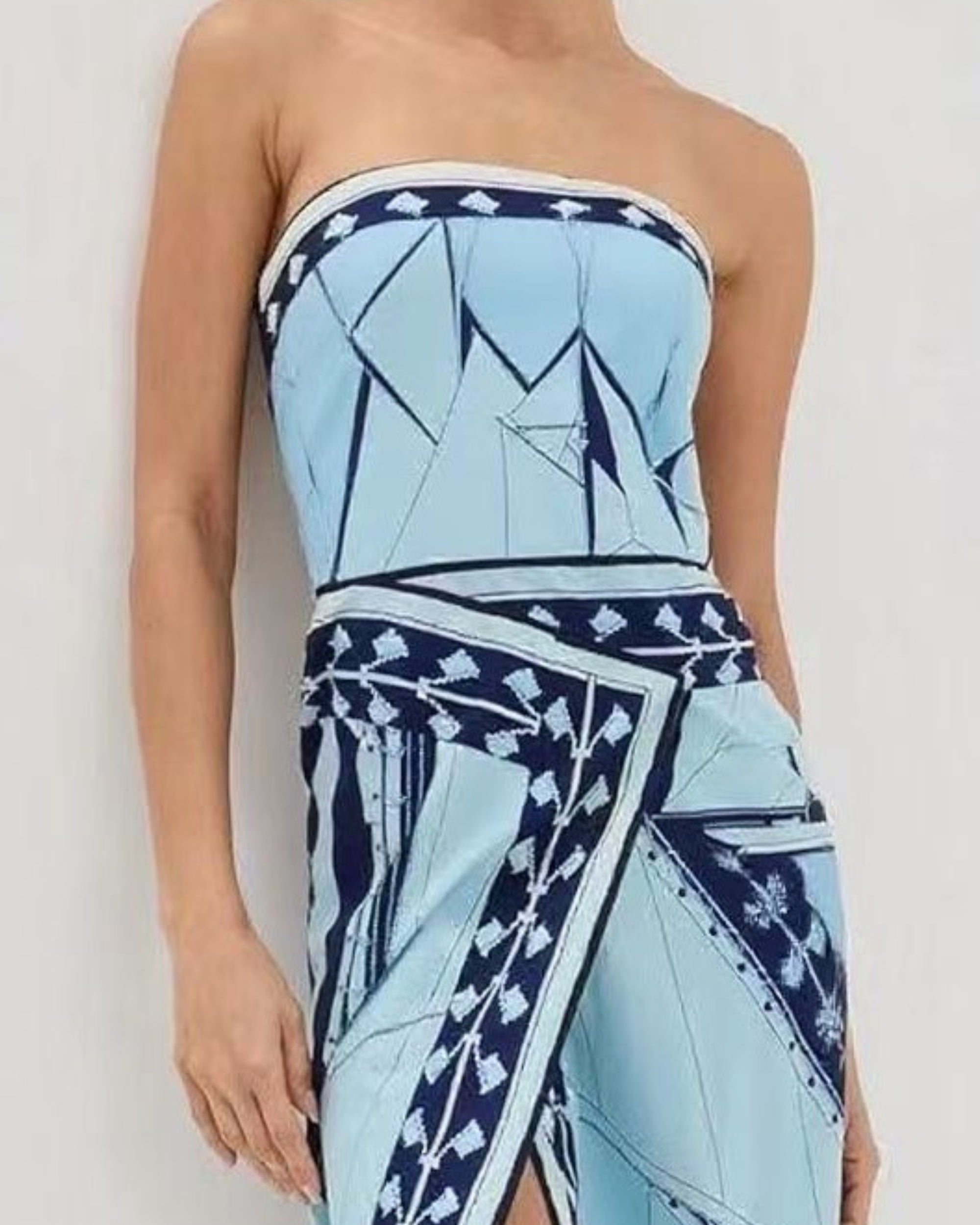 Our Ceriane Dress comes in shades of blue and black. As unique as your holiday adventures, this piece features a tube neckline, front slit, beautiful prints all over and maxi length hem. Style it with simple sandals to keep the focus on your standout dress!