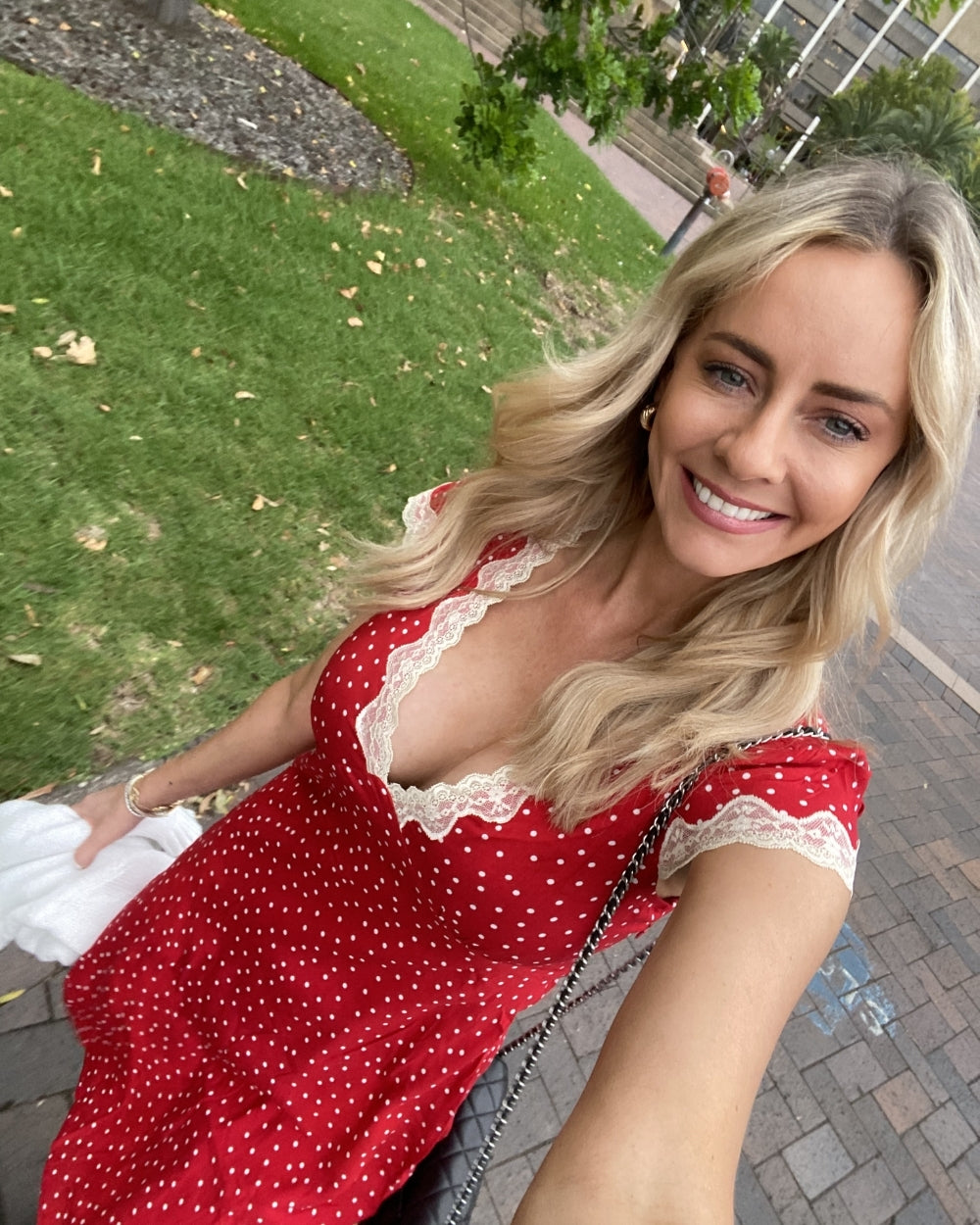- Key Features: Rendered in a vibrant red hue with a classic white polka dot motif, the Firenze features a flattering V-neckline framed by exquisite scalloped lace trim. Its cinched waist and soft A-line skirt create a timeless silhouette that moves beautifully with you.