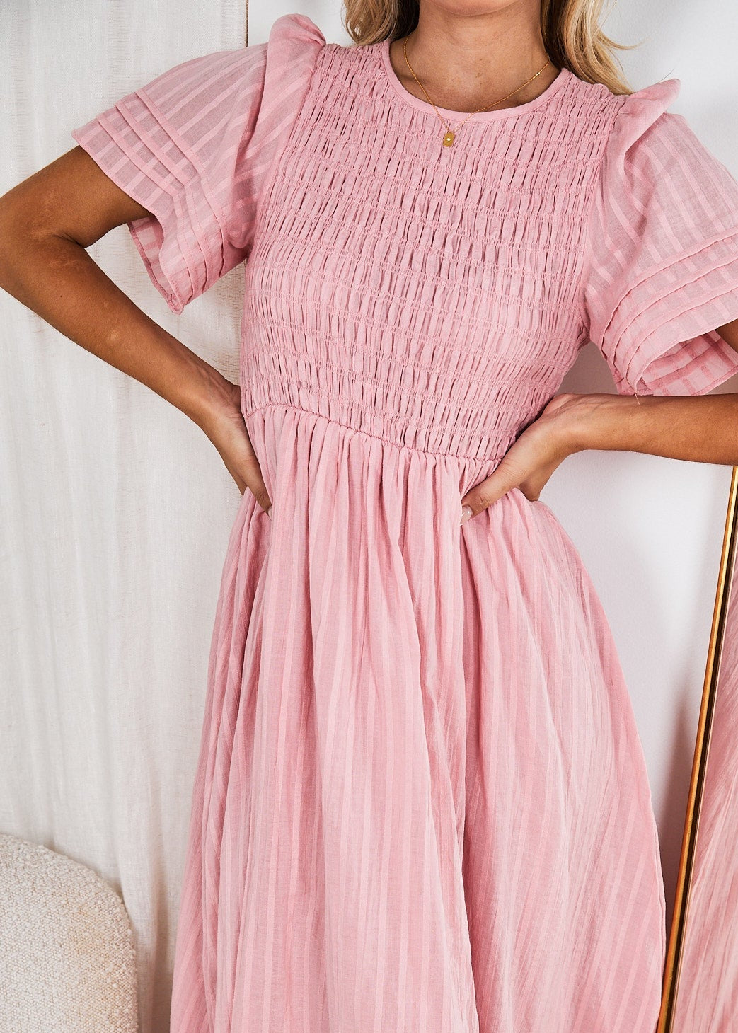 Our Iolana Dress comes in a soft pink tone. It features a round neckline, short sleeves and a textured pattern across the chest. This stunning midi pairs wonderfully with boots or heels for a stunning formal look!
