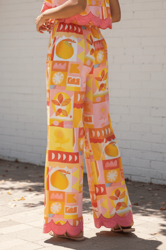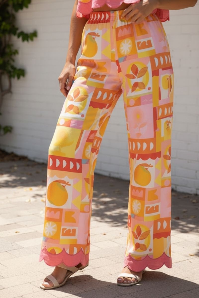These playful pants feature a delightful all-over print of lemons and oranges in a fun, geometric, patchwork-inspired design. The color palette is a joyful mix of sunny yellows, cheerful oranges, warm reds, and sweet pinks.