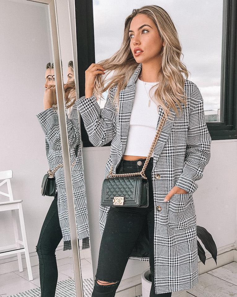 This stunning coat is a must-have for the season. Featuring a classic black, white, and grey plaid print, it adds a timeless touch to any wardrobe. Style it with black jeans or leggings and a basic tee for an effortlessly chic look.