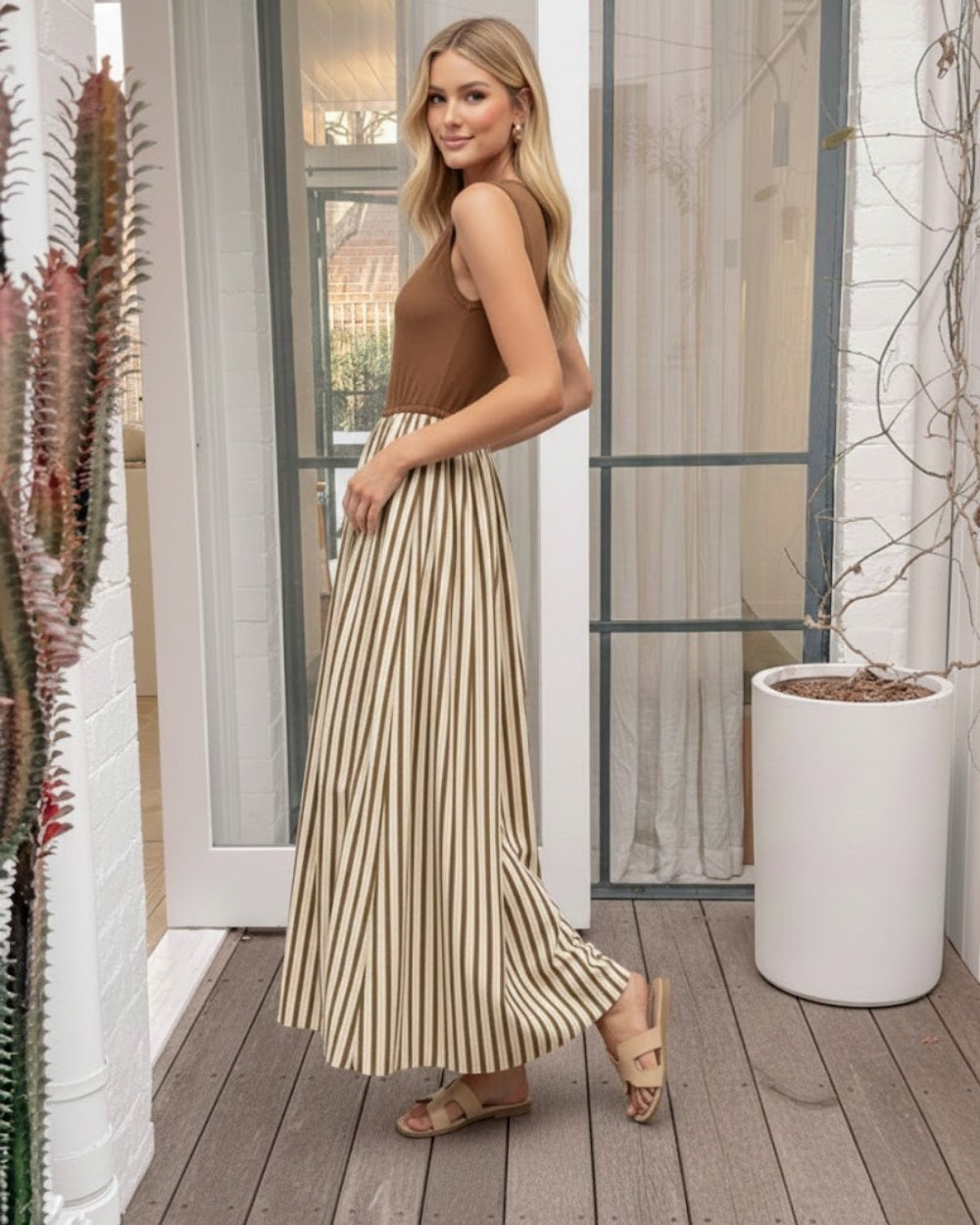 Exude effortless elegance with the Ariala Dress in Toffee Stripe. This stunning maxi combines the comfort of a casual tank with the elevated drama of a full, structured skirt, making it a quintessential piece for the modern woman's wardrobe.