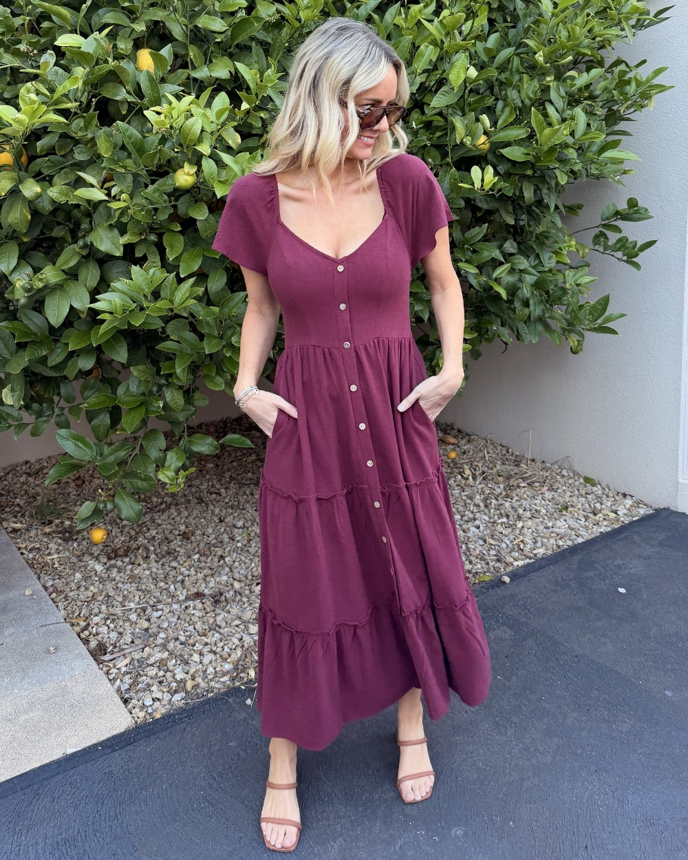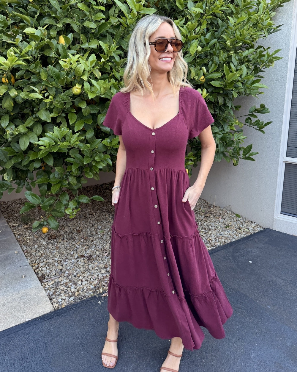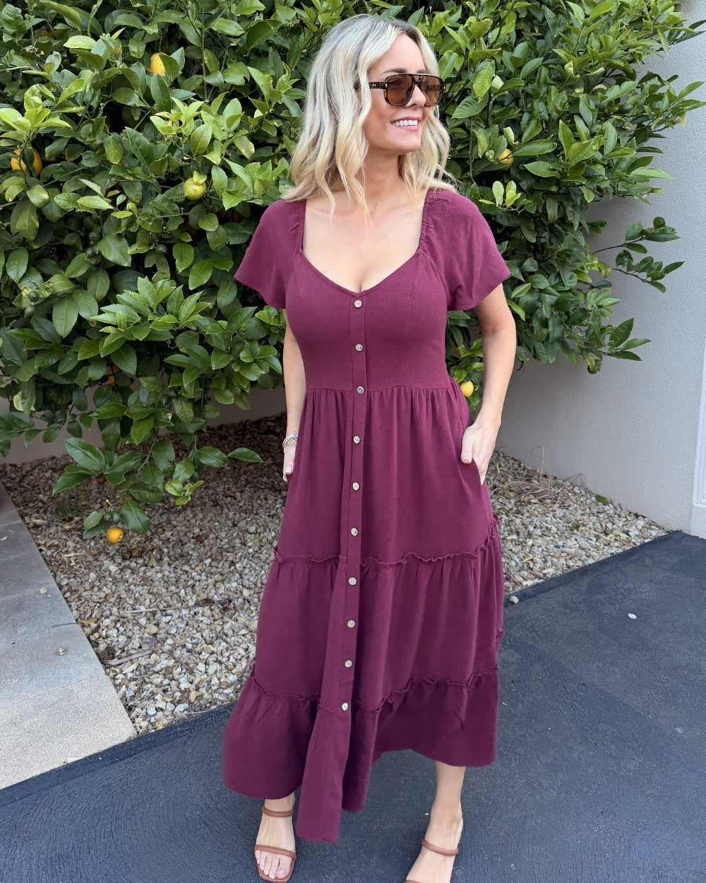- Key Features: A gently fitted bodice transitions into a beautiful, tiered midi skirt, creating a figure-flattering and breezy shape. The elegant sweetheart neckline frames the décolletage beautifully. The dress features a stylish full-length button-down front with complementary natural-toned buttons. We know you love them! This dress includes two functional side pockets for your essentials. Soft cap sleeves (or flutter sleeves) offer comfortable coverage and a feminine touch. The deep, rich Bordeaux color is versatile, easily dressed up or down, and perfect for any season.