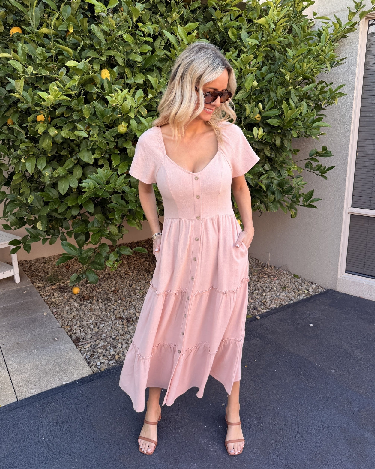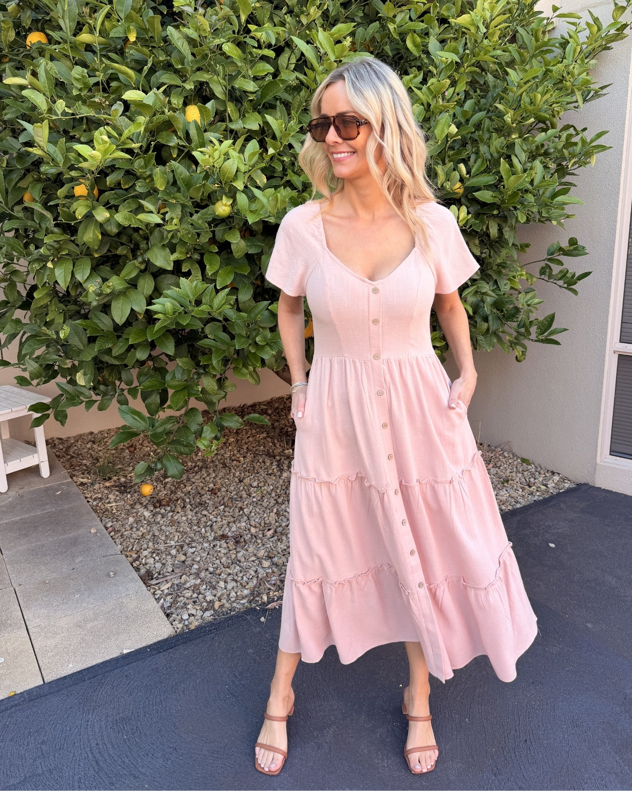 • Key Features: Features a fitted bodice that flows into a comfortable, tiered midi skirt, creating a universally flattering shape. The tiered hemline adds movement and a playful, bohemian touch that is right on trend. A full row of decorative buttons runs down the front, enhancing the vintage-inspired aesthetic. The beautiful pink hue is soft, romantic, and versatile, making it easy to style for various occasions. Yes, it has pockets! Because convenience should always be in fashion. Short, subtle puff sleeves with a gentle gathering add a delicate, feminine finish.