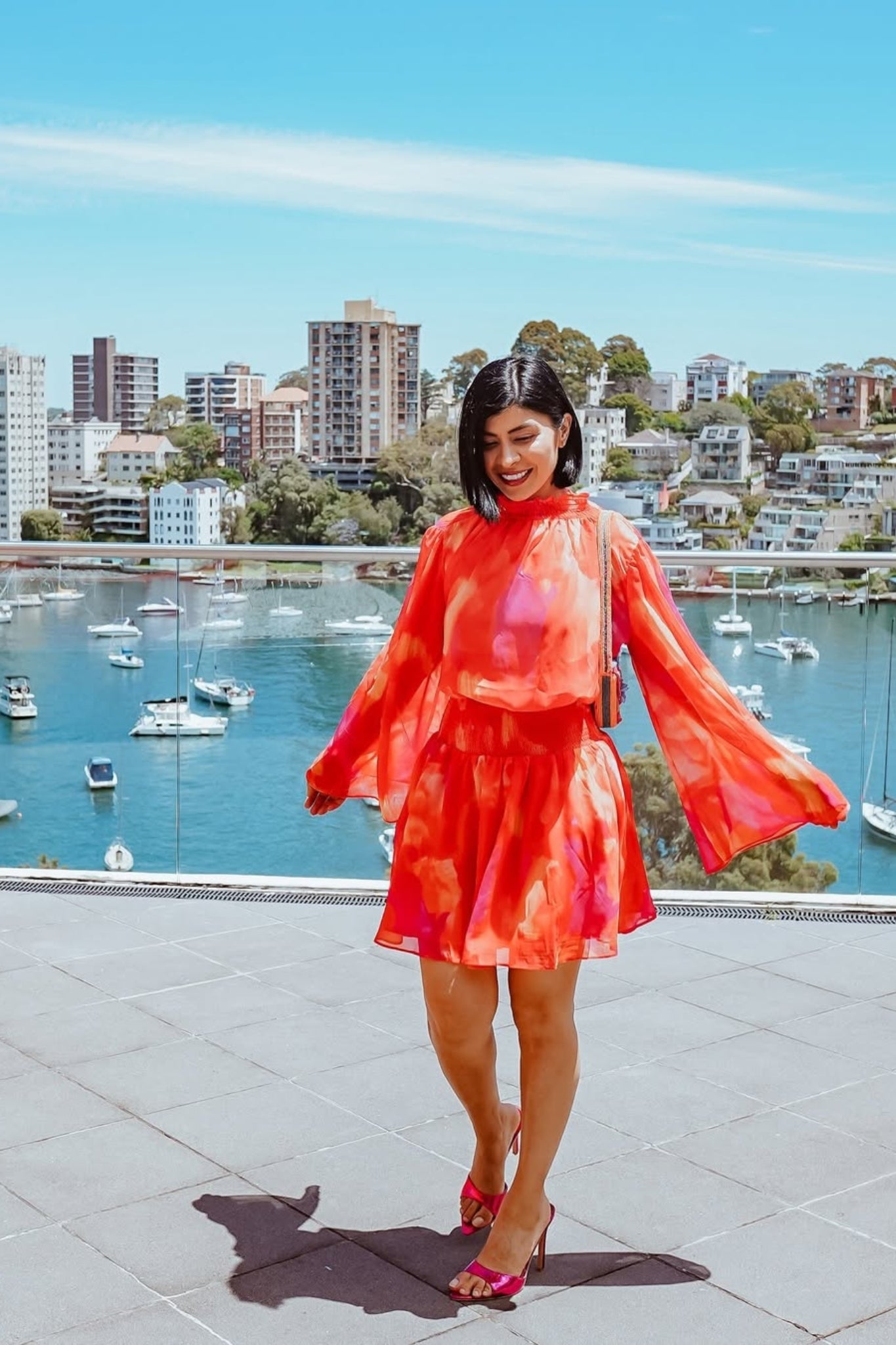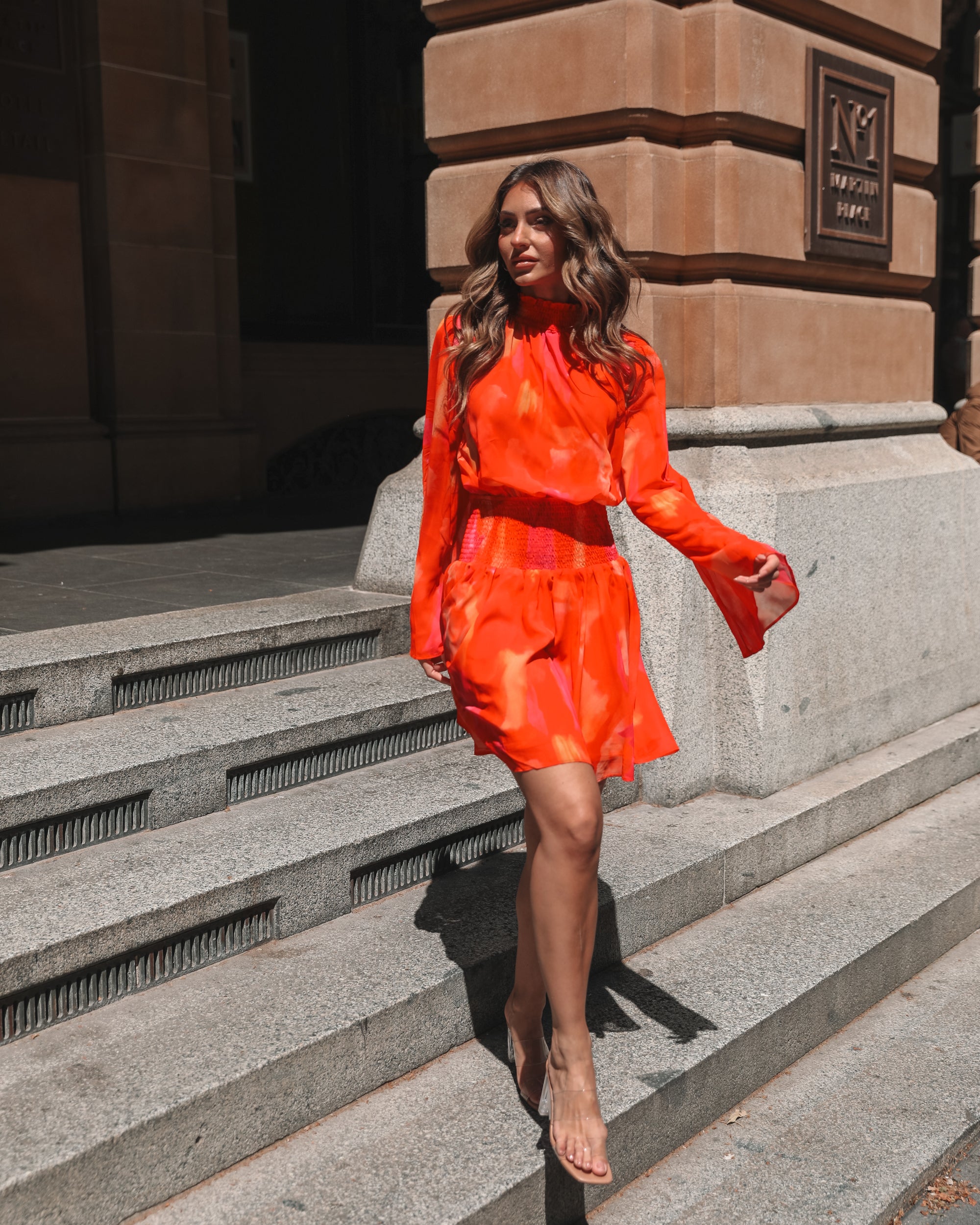 Our Daenerys Dress comes in a bold orange base with red and purple print. Bringing a splash of colour and sexiness to your party wardrobe, this mini features a high neckline, long trumpet sleeves, gathered and smock detailing on the bodice, collar and waist. Channel your fun and expressive self by pairing this with a neon shade open heels and antique earrings!