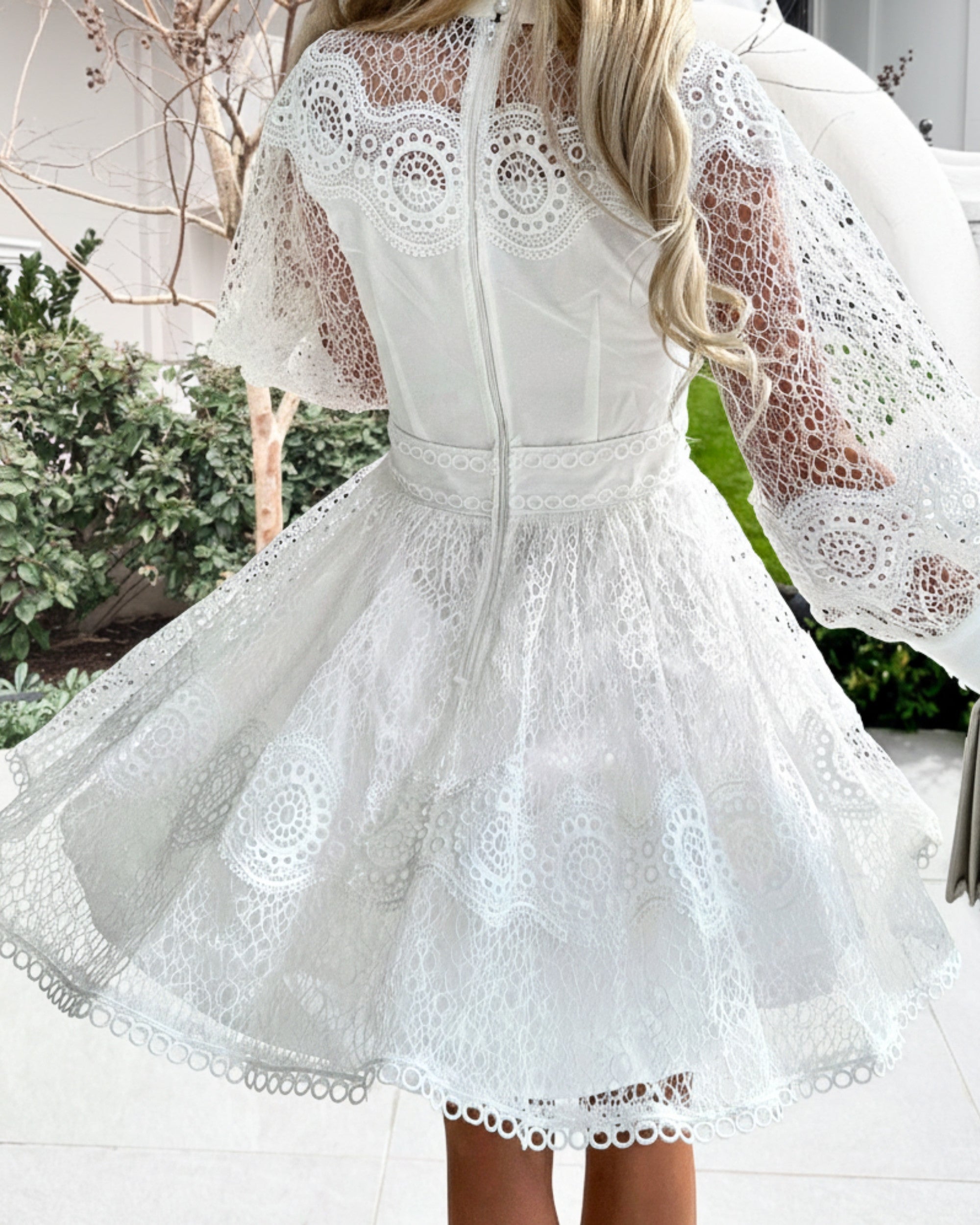 The Eryndis features an intricate, delicate cut-out lace fabrication that adorns the entire bodice and skirt. A high mock neck with dainty pearl-look buttons adds a touch of regal sophistication. We're obsessed with the statement full balloon sleeves, finishing in neat, contrasting cuffs for a dramatic yet polished look. The fitted bodice cinches at the waist, leading to a beautifully flared A-line mini skirt that promises to flatter every figure.