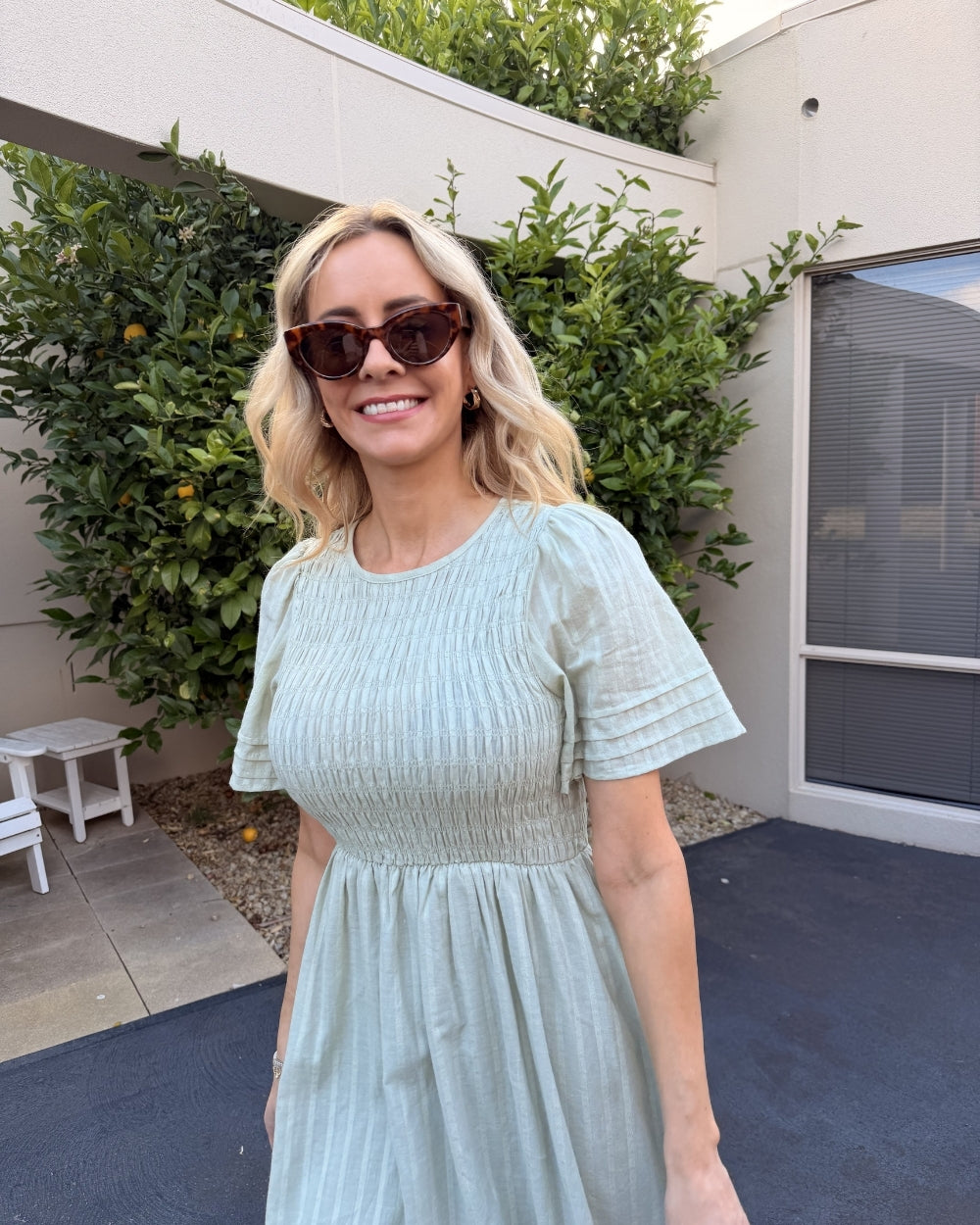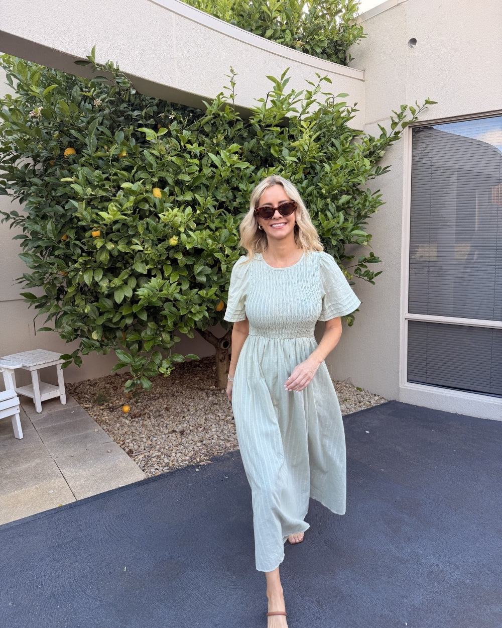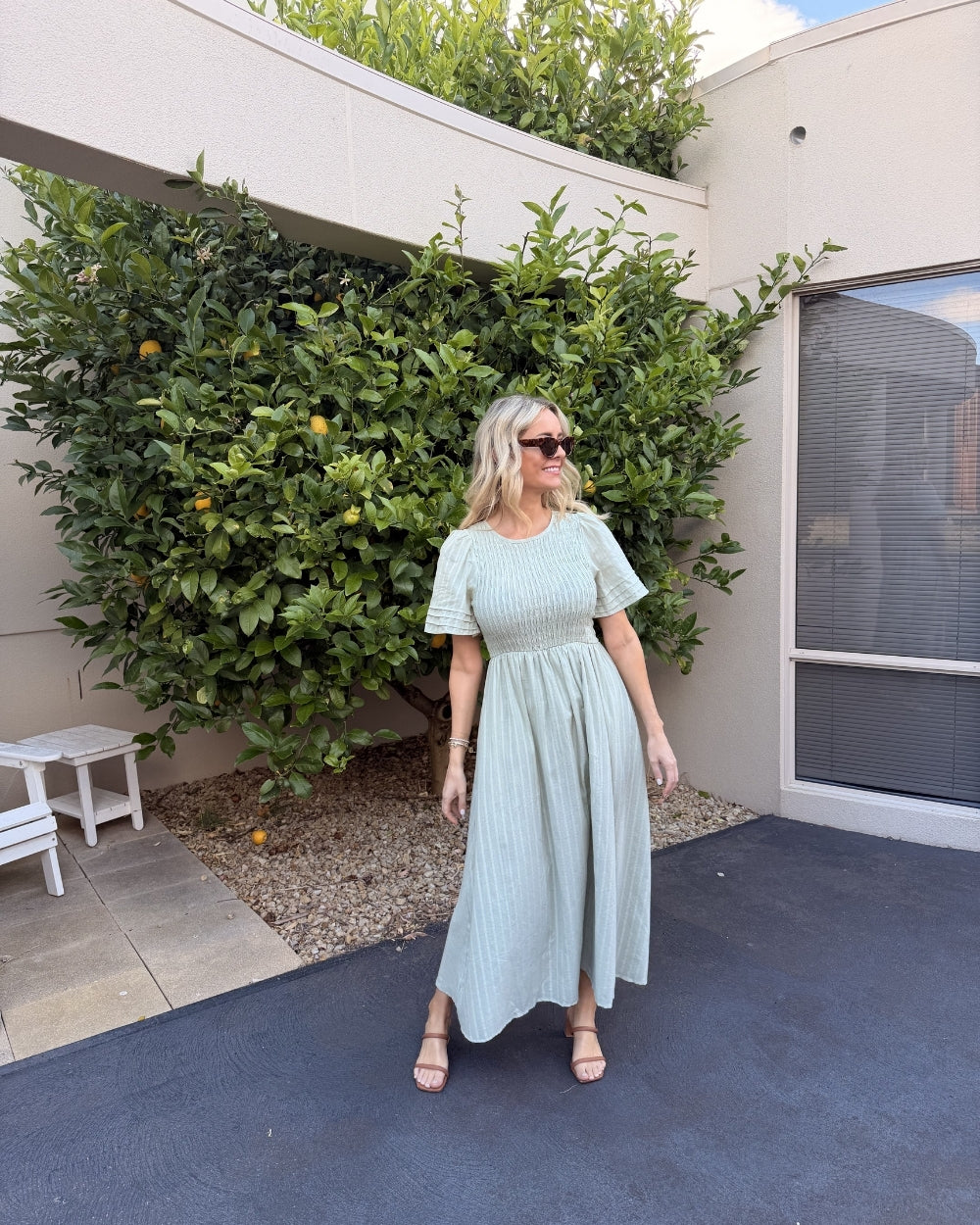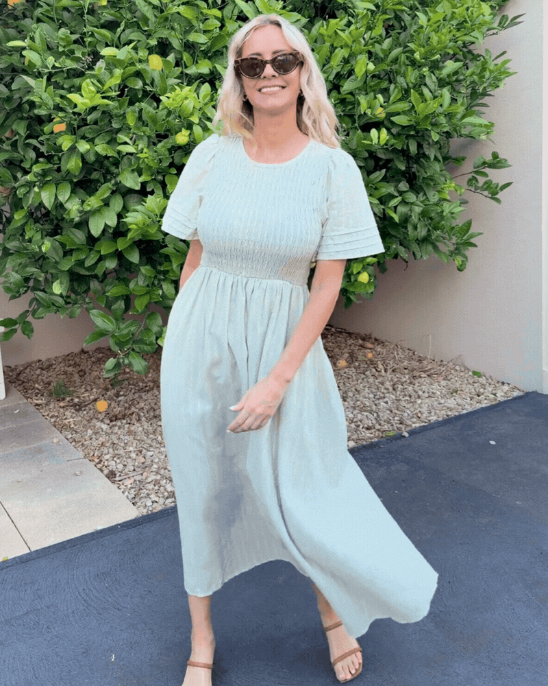 Textured shirred bodice for a comfortable and flexible fit. Short sleeves with subtle tiered detailing. Flowy midi-length skirt that moves beautifully. Round neckline for a classic, modest finish. Soft Khaki colour, neutral, versatile, and easy to style. Lightweight fabric ideal for warm weather. Elasticated bodice for all-day comfort. Pull-on design for effortless dressing.