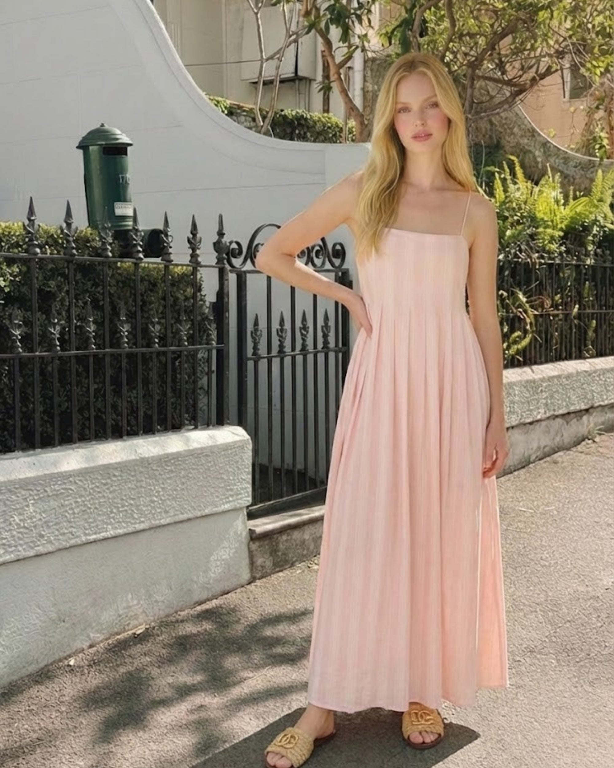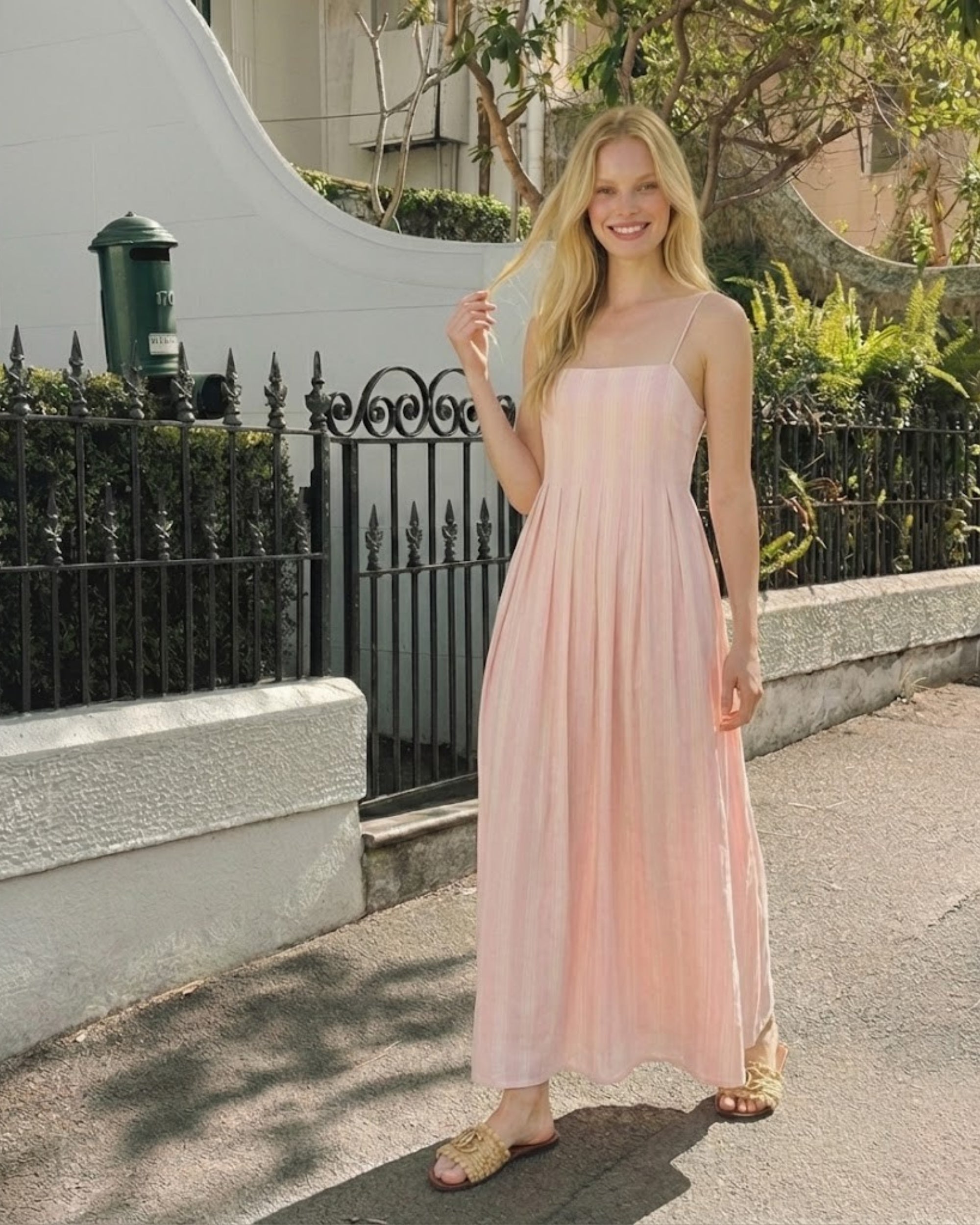- Key Features: Adorned with a gorgeous subtle pink stripe pattern against a light, airy background, this dress offers a beautifully gentle aesthetic that's both chic and feminine. The delicate vertical stripes create an elongating effect. A contemporary square neckline provides a modern, sophisticated touch, elegantly framing your décolletage and shoulders. Fine, adjustable spaghetti straps add to the dress's ethereal charm, offering a light and airy feel perfect for warmer days. The dress boasts a stunning full-length maxi skirt that flows beautifully with every step, creating an ethereal and romantic silhouette. Designed for both style and comfort, this dress features a relaxed yet flattering fit that allows for graceful movement and all-day wear. Crafted from a soft, breathable fabric, it ensures you stay cool and comfortable while looking effortlessly stylish.