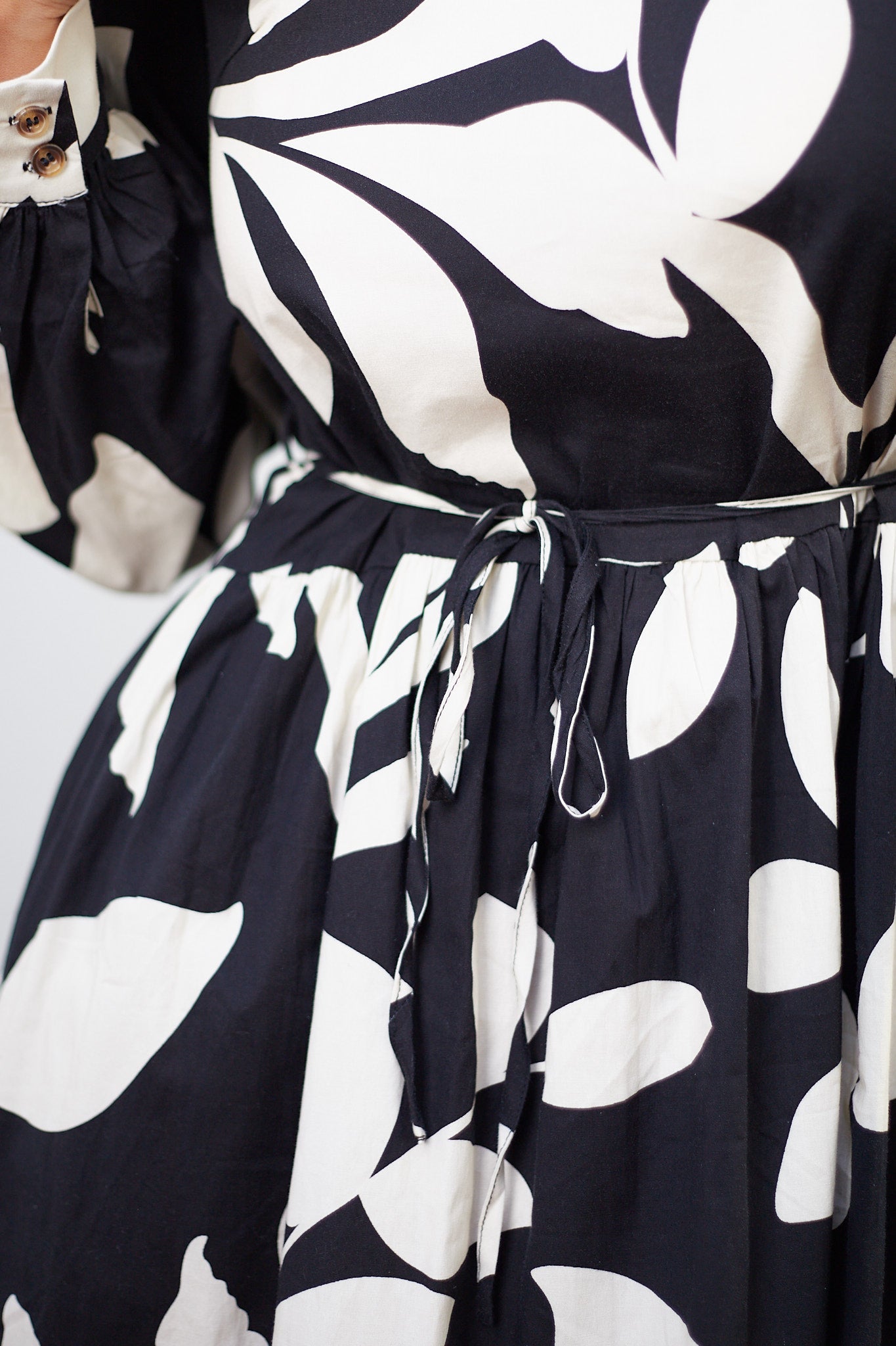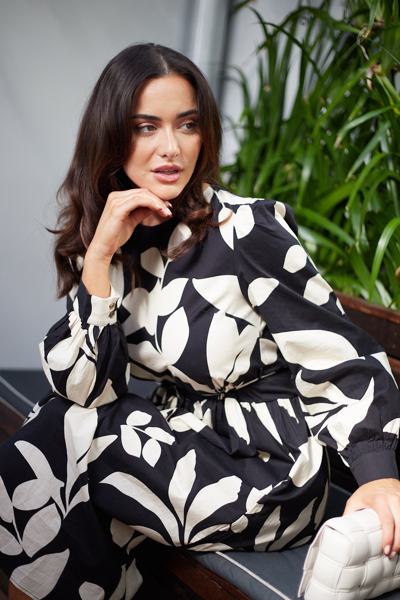 Our Karleen Dress comes in a black base with beige leaf prints. You're sure to be the envy of everyone around you with this midi that features a round neckline, long sleeves with micro cuffs, fabric waist belt and flowy a-line skirt. Look extra gorgeous with dangling earrings and block heels!