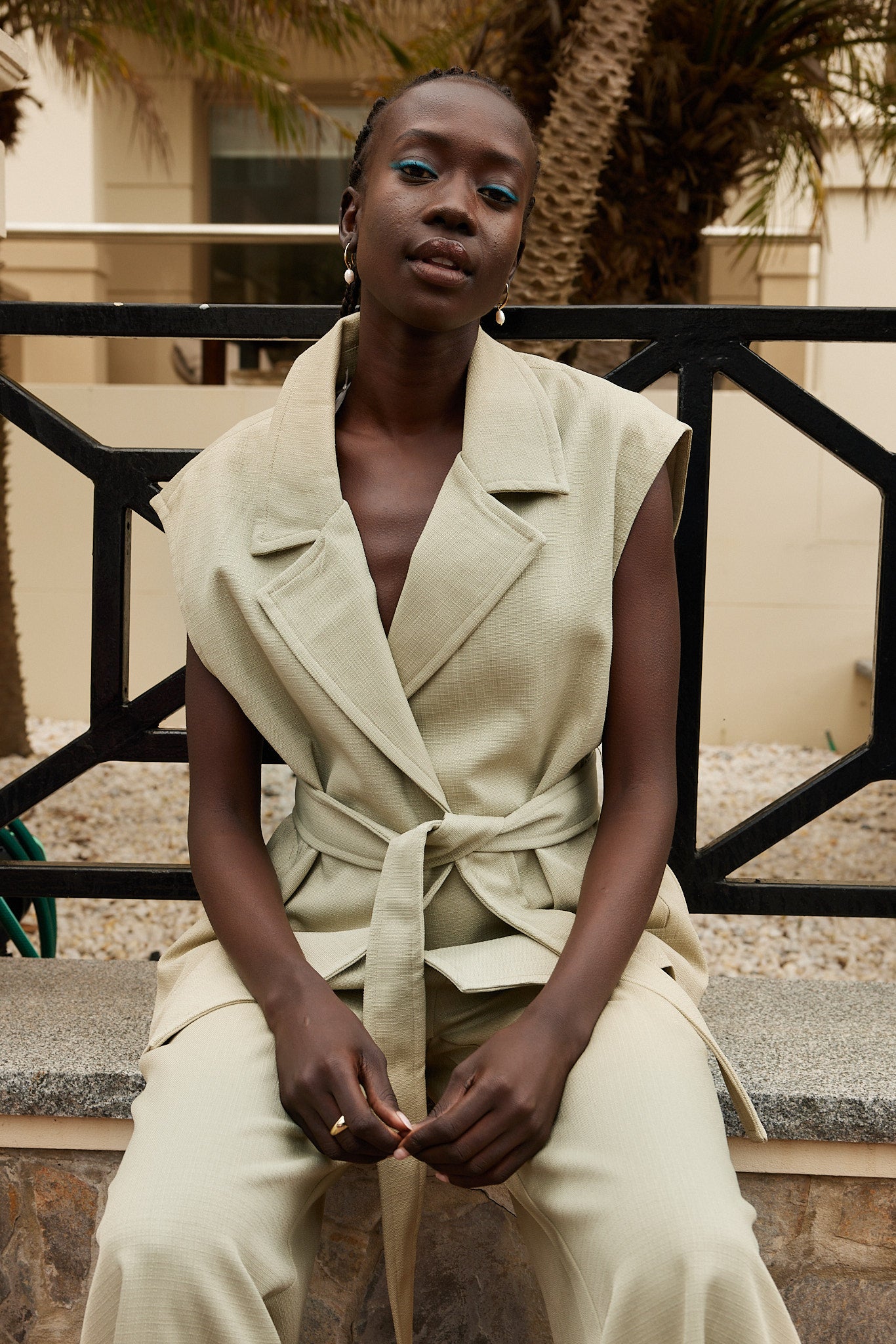 Our Sabrinna Vest Top comes in a sage colour. Max up your wardrobe essentials with this piece that features a notched collar, side pockets and fabric belt. Complete the look with our Sabrinna Pants and classic block heels!
