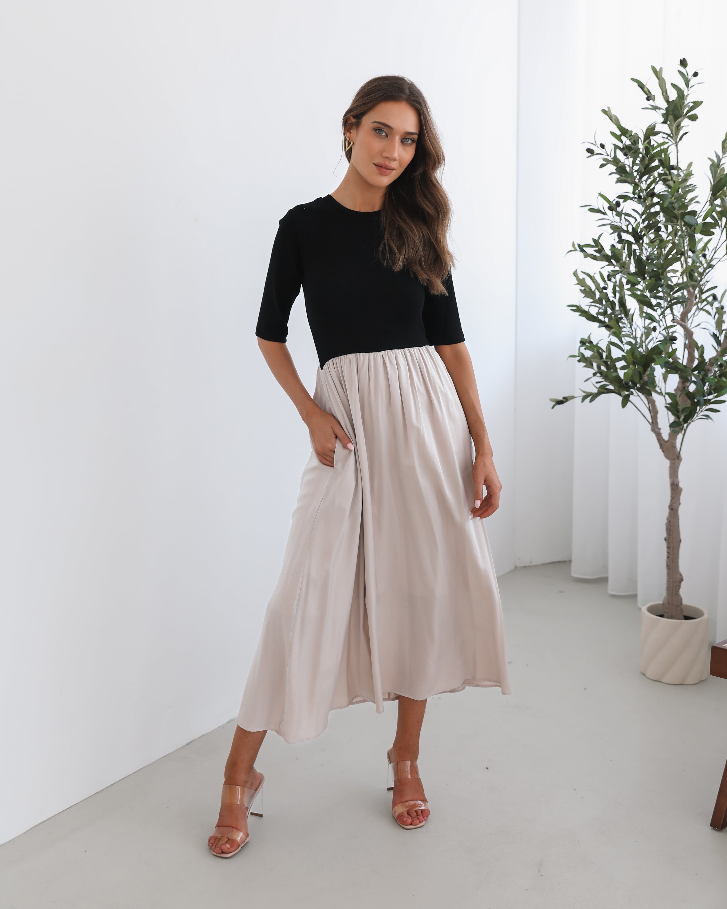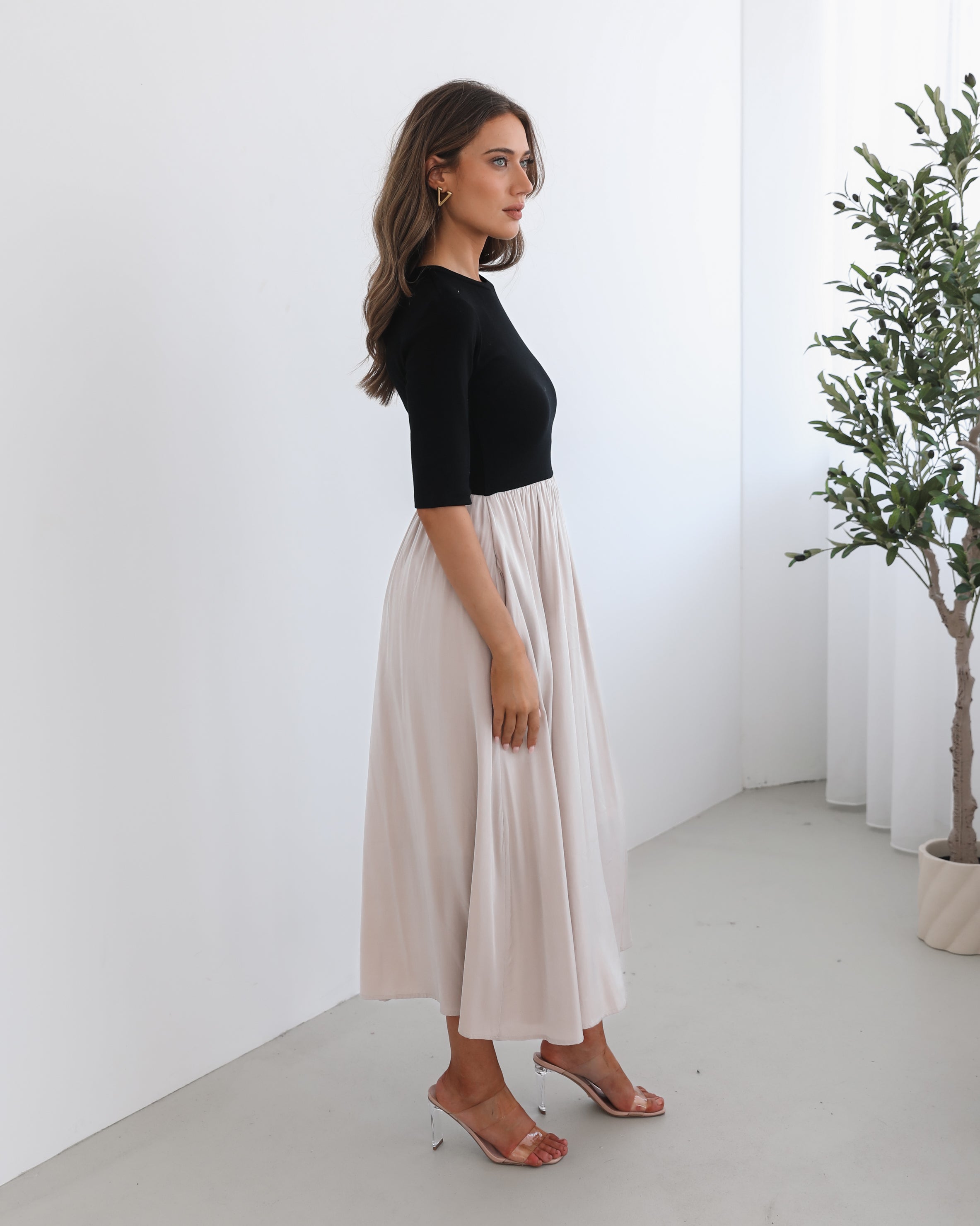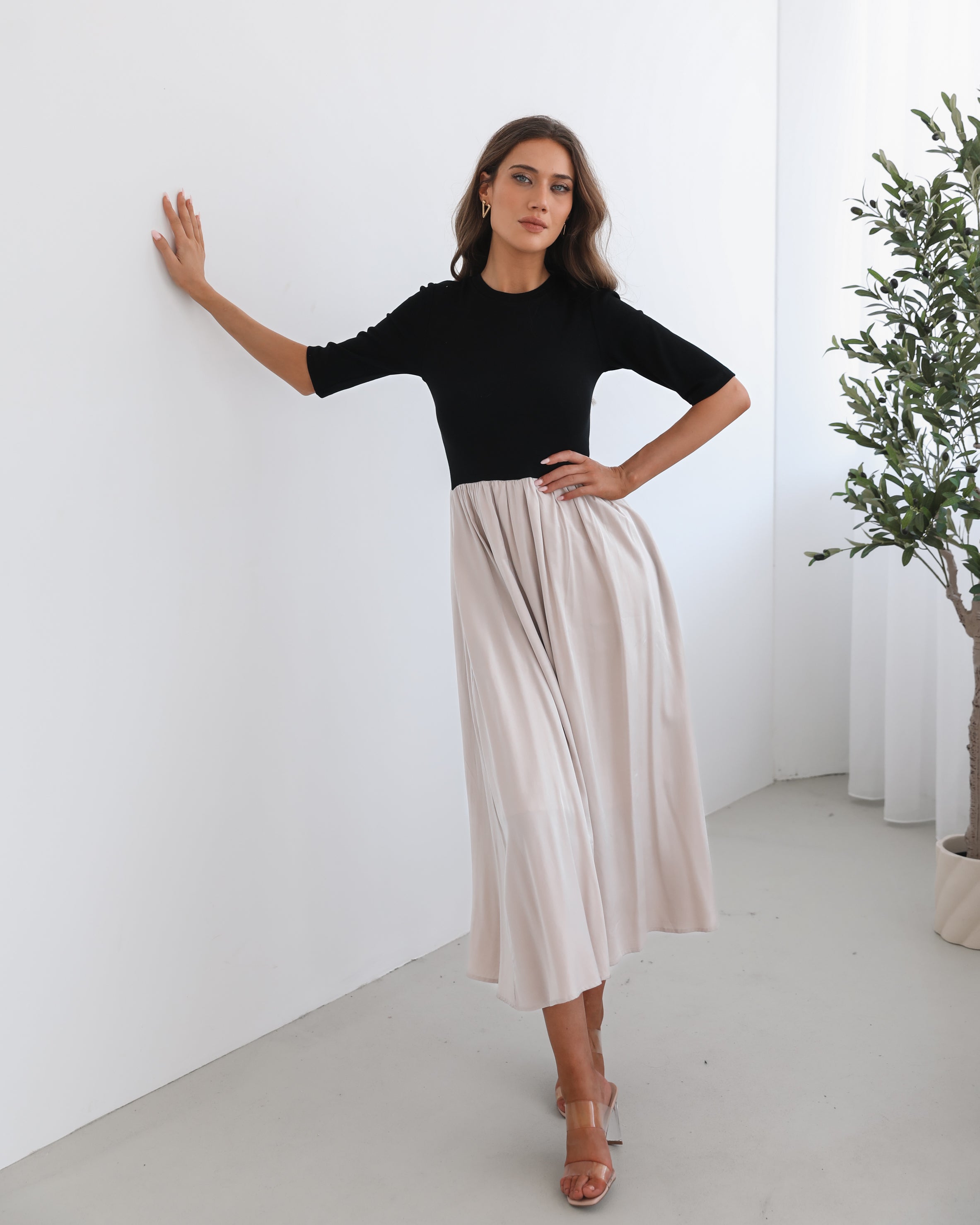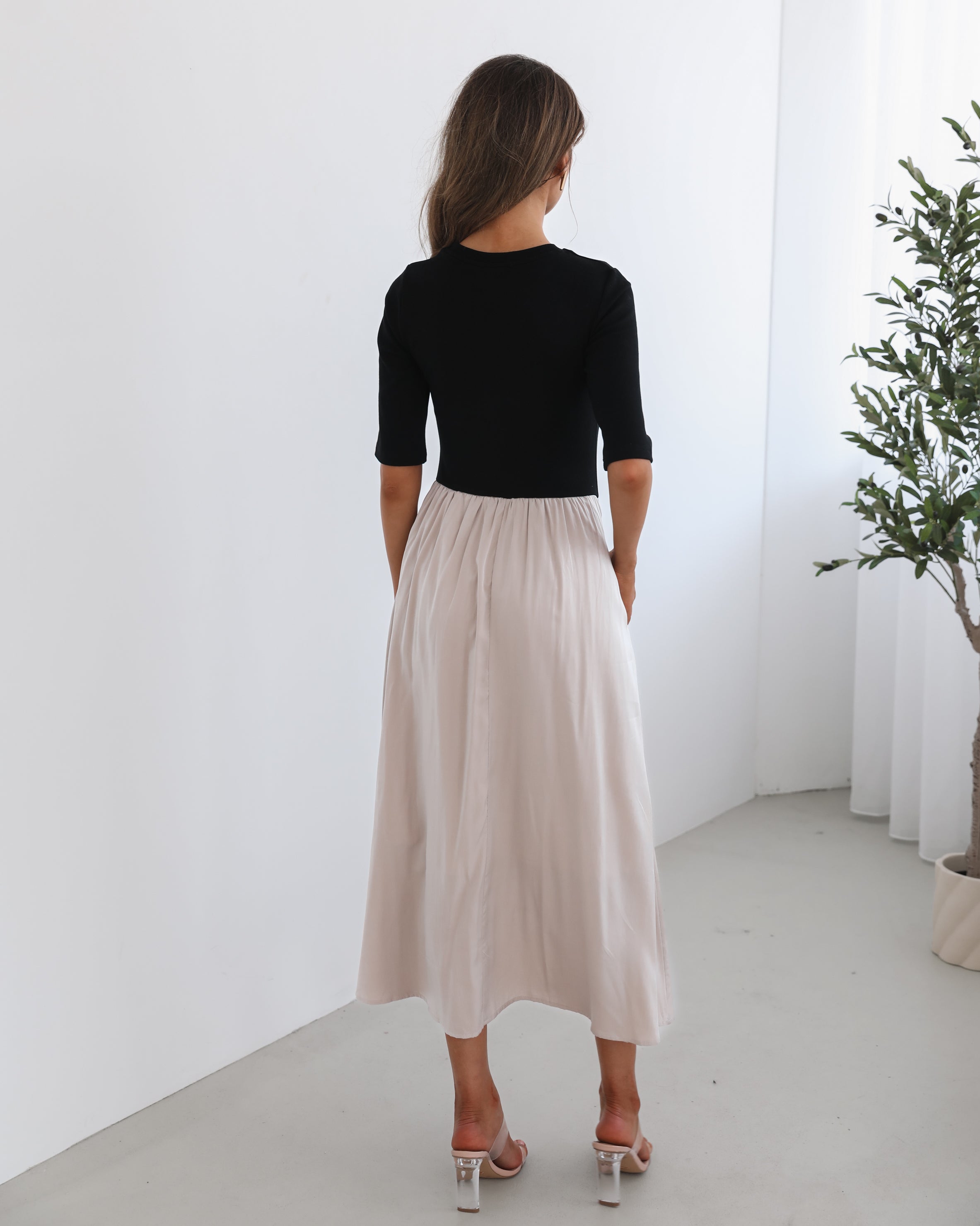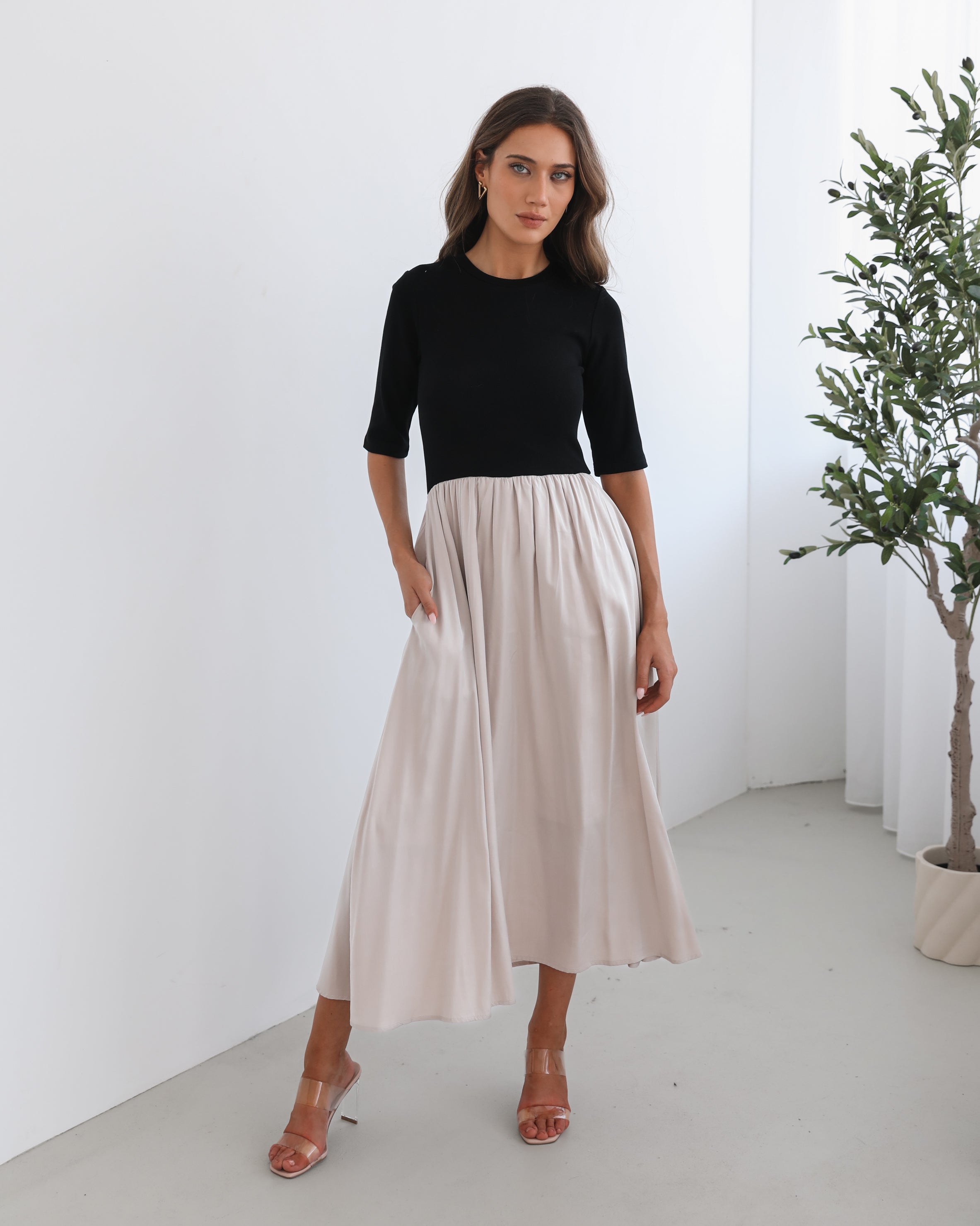 Our Jaliyah Dress comes in black and creamy-white tones. A true conversation-starter, this piece is designed with a round neckline, elbow length sleeves, flowy skirt and tea length hem. Pair it with black ankle boots for an edgier look, or slip into white heels for a chic, elevated outfit!
