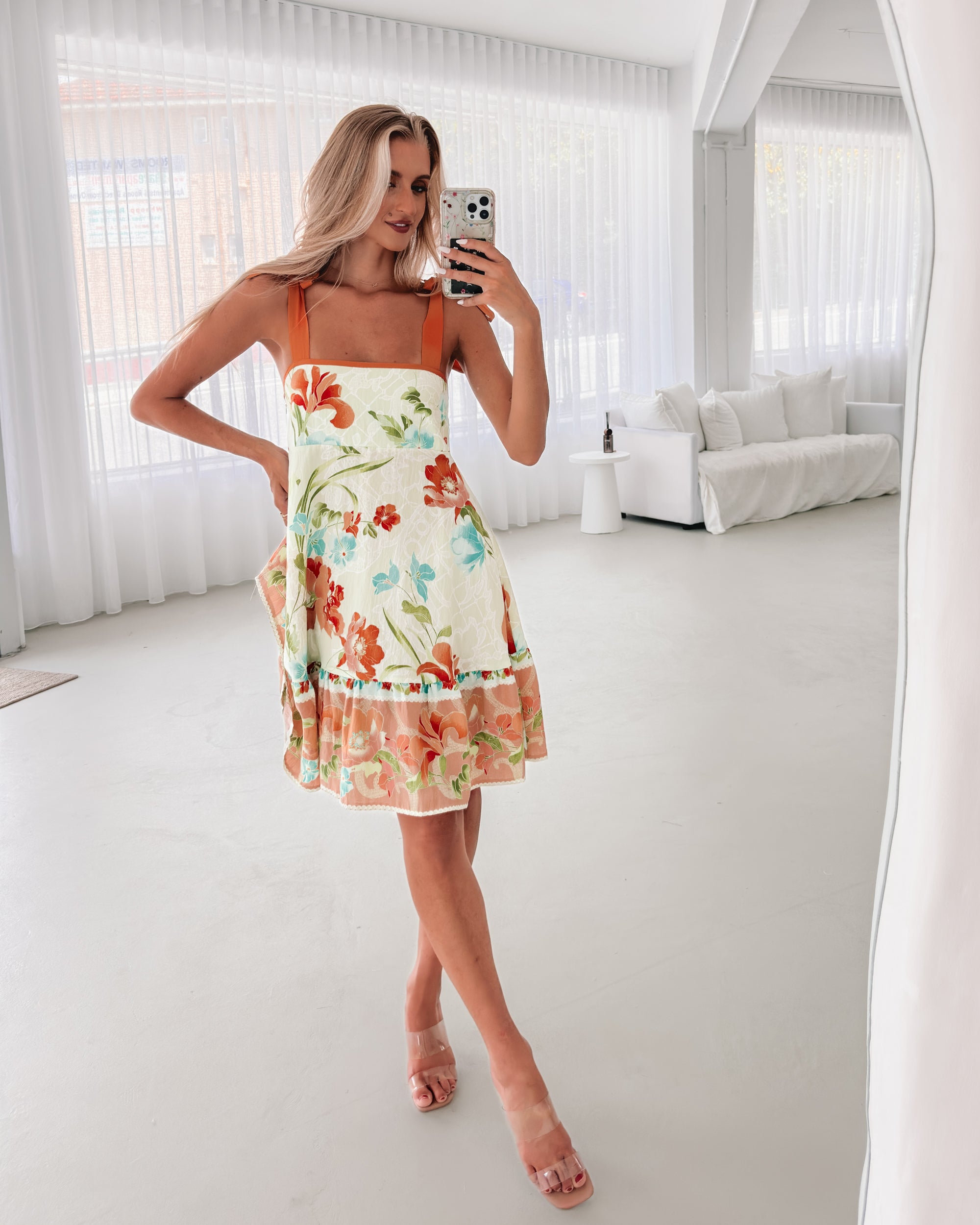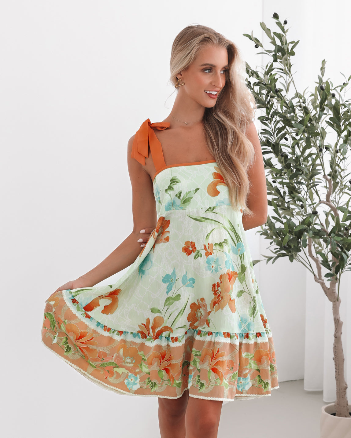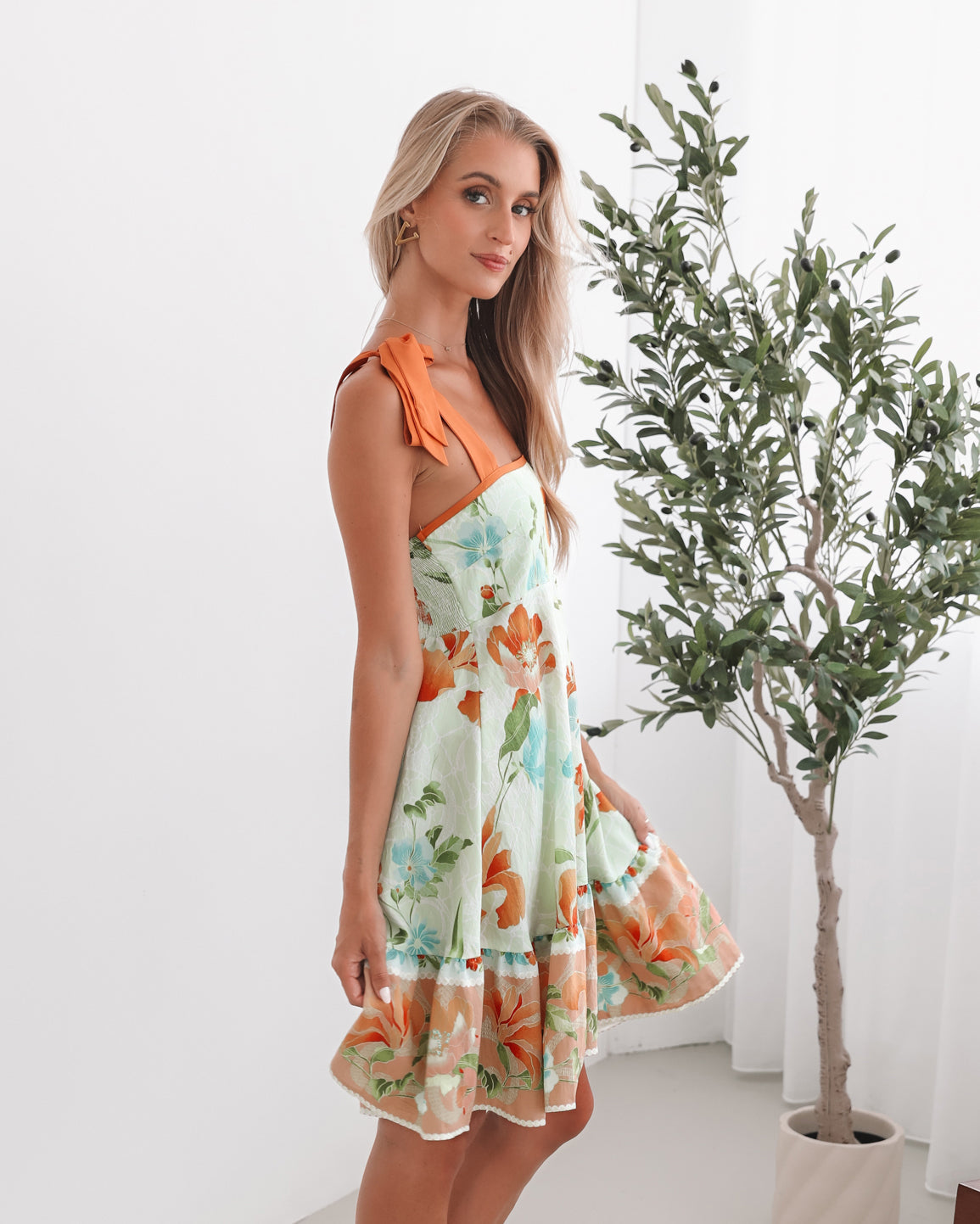 Our Matilde Dress comes in shades of green, blue and orange. Lending you an air of otherworldly gracefulness, this piece is designed with self tie straps, square neckline, drop waist style skirt and mini length hem. A pair of delicate pearl earrings or a simple bracelet will highlight the dress's gentle elegance!