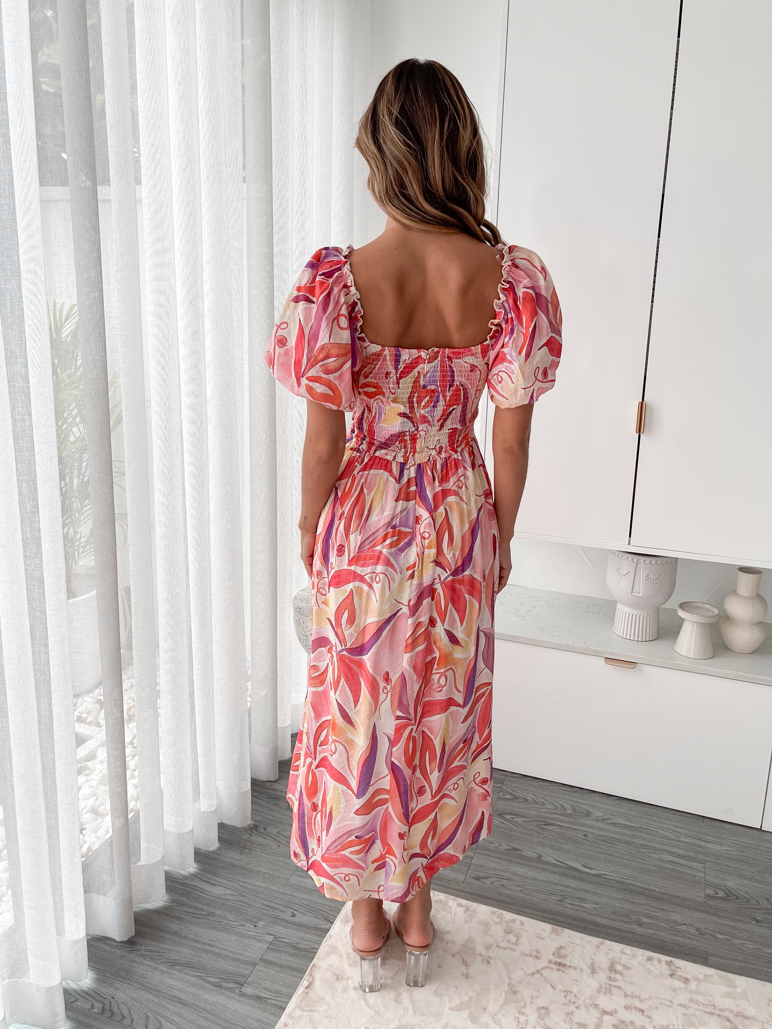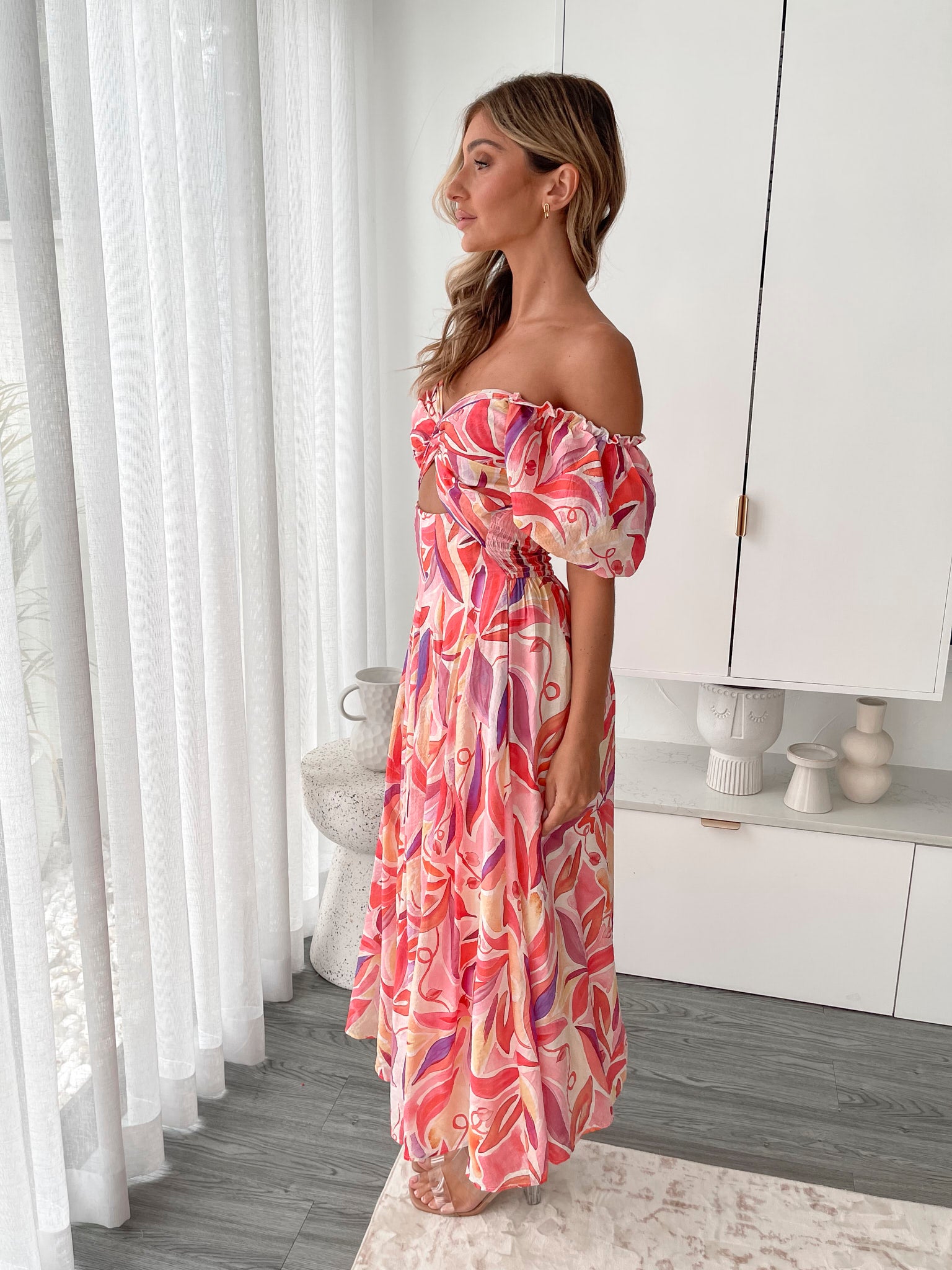 Our Orynn Dress comes in a pink base with multicoloured prints. Feel as graceful as you look in this number that features a sweetheart neckline, frilled short off shoulder sleeves, cut out and pleats on waist, flowy skirt and maxi length hem. Head out to your afternoon tea with friends in a bun and block heels!