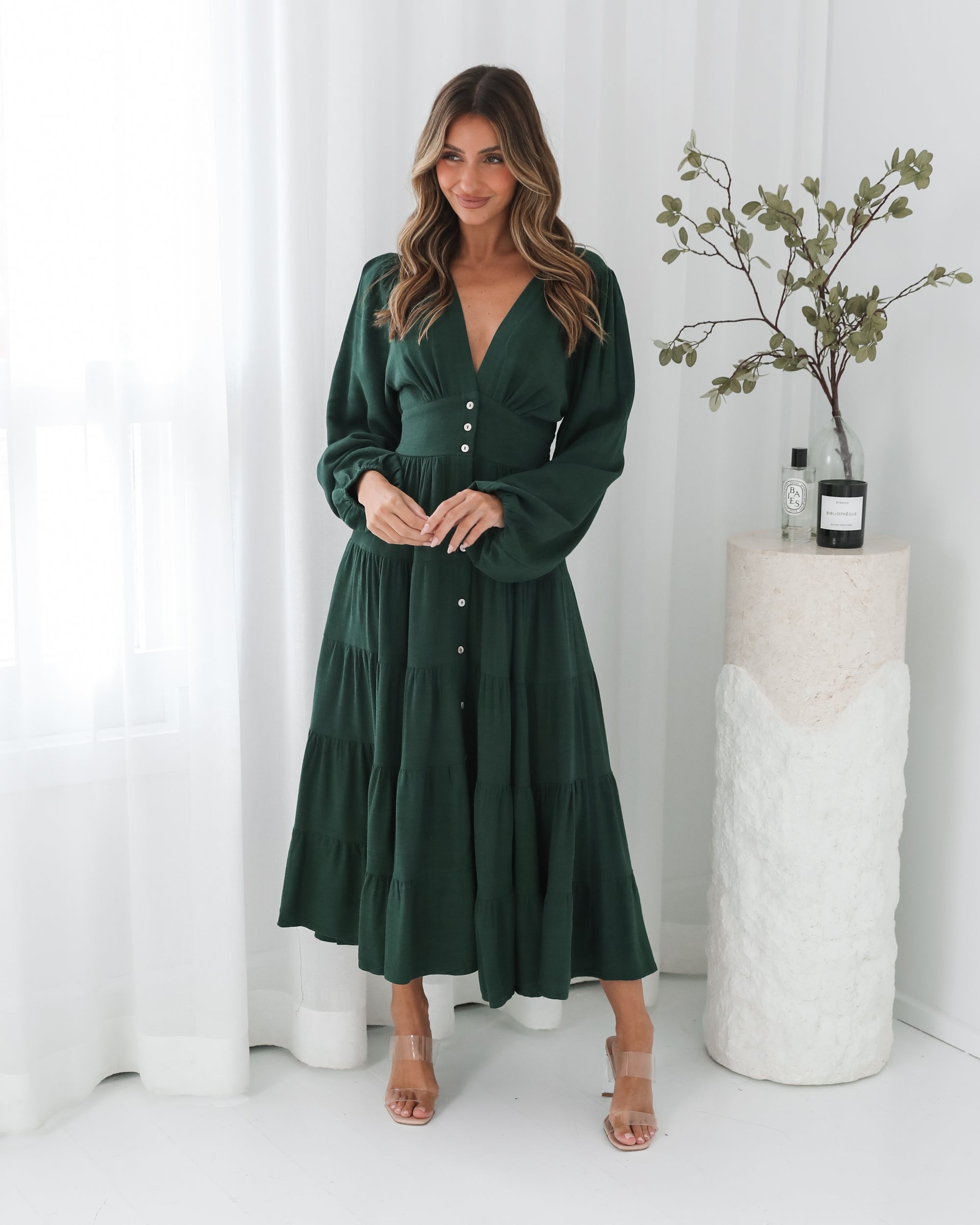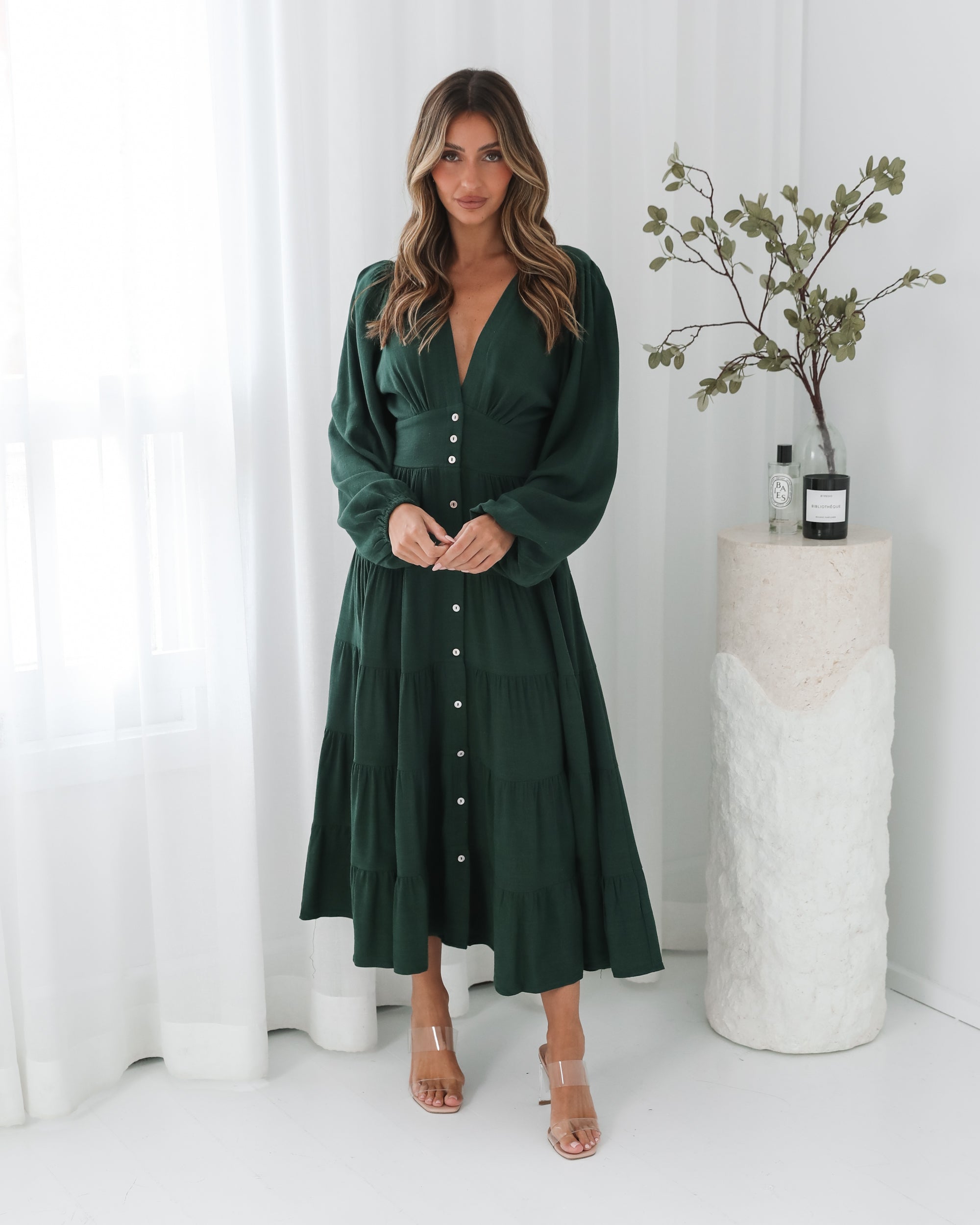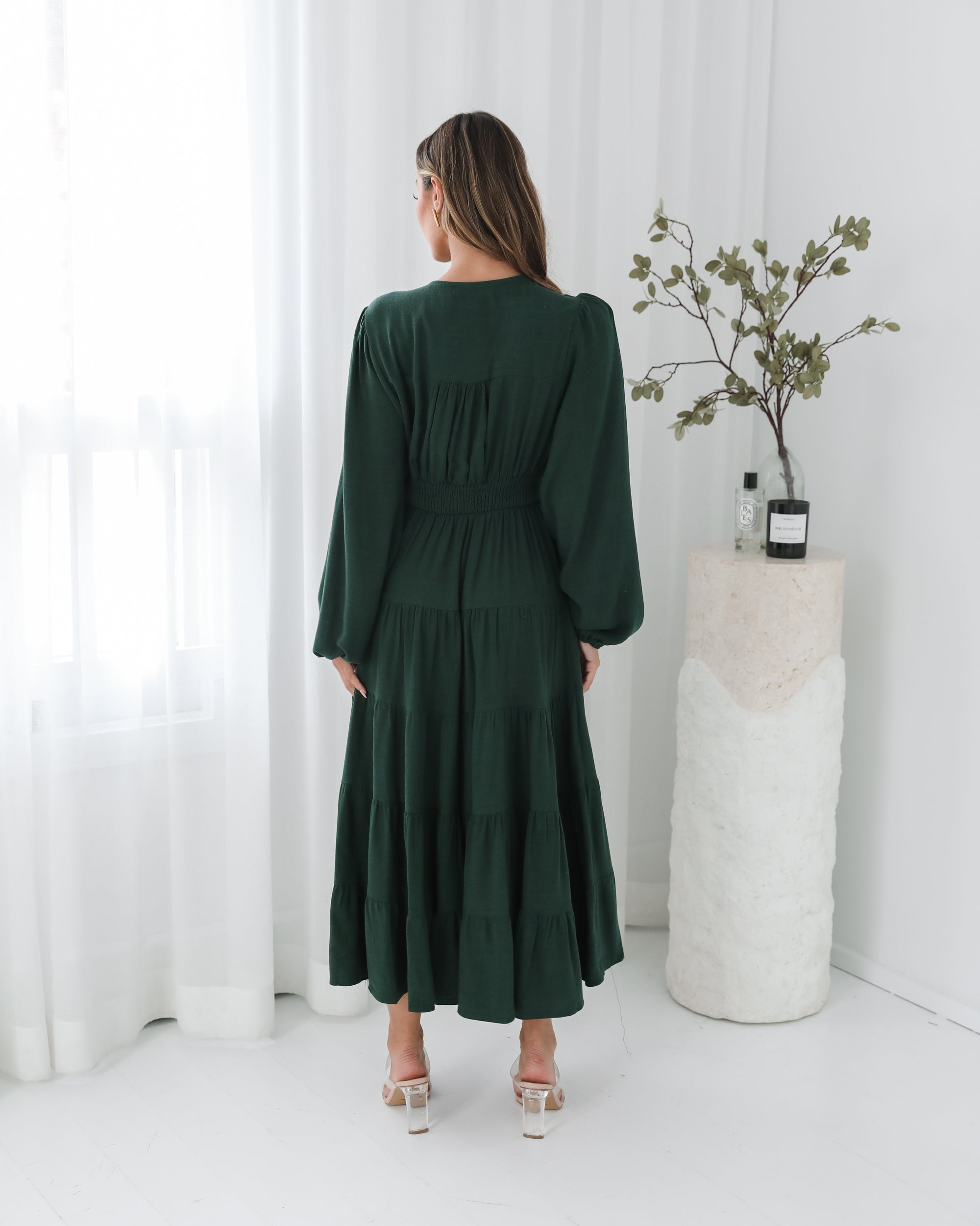Our Sharina Dress comes in an emerald green colour. The piece for moments that deserve to be remembered, this stunner features a v-neckline, long bishop sleeves, centre-front buttons, flowy tiered skirt and midaxi length hem. Style it with strappy lace-up heels & a bold red lip!
