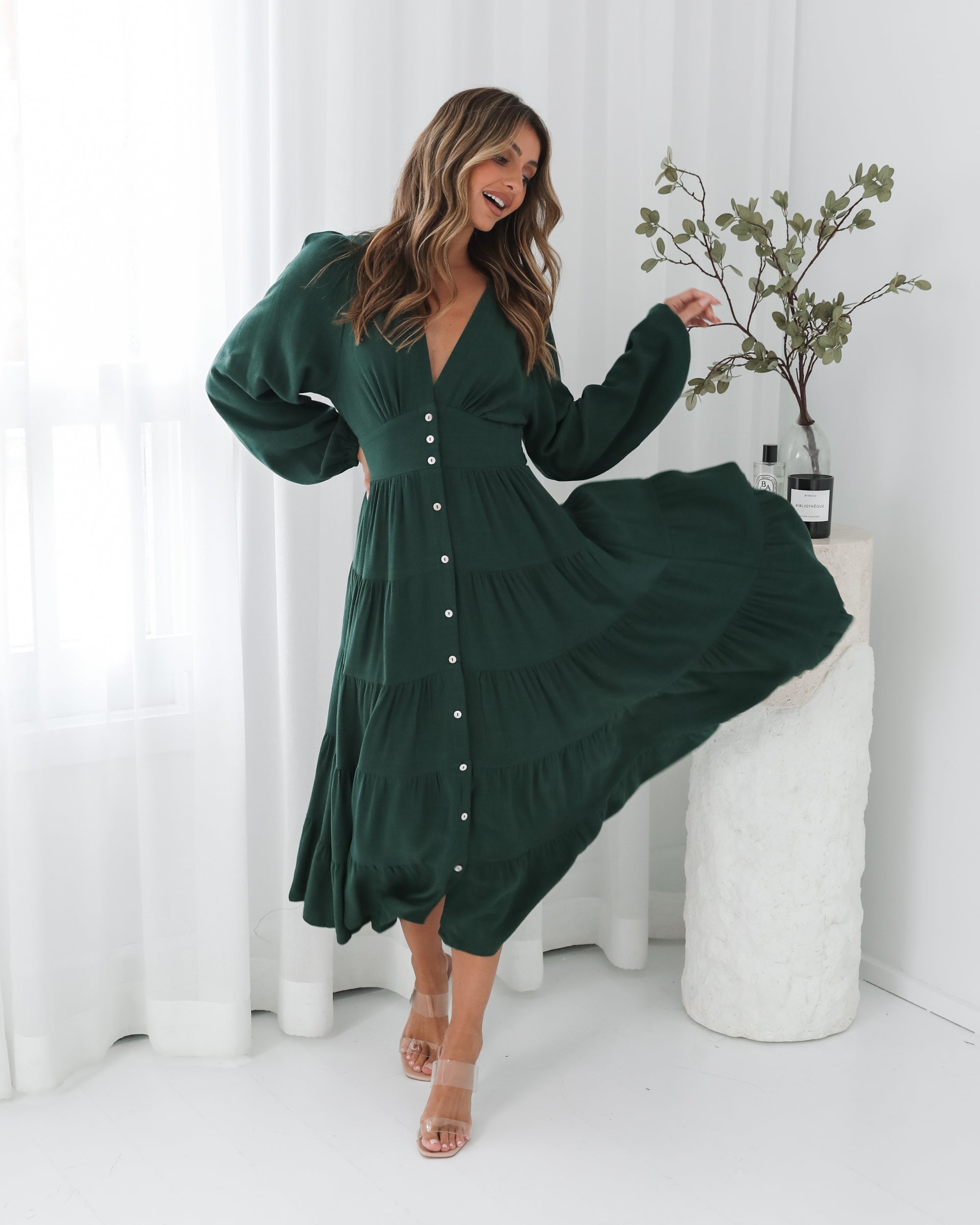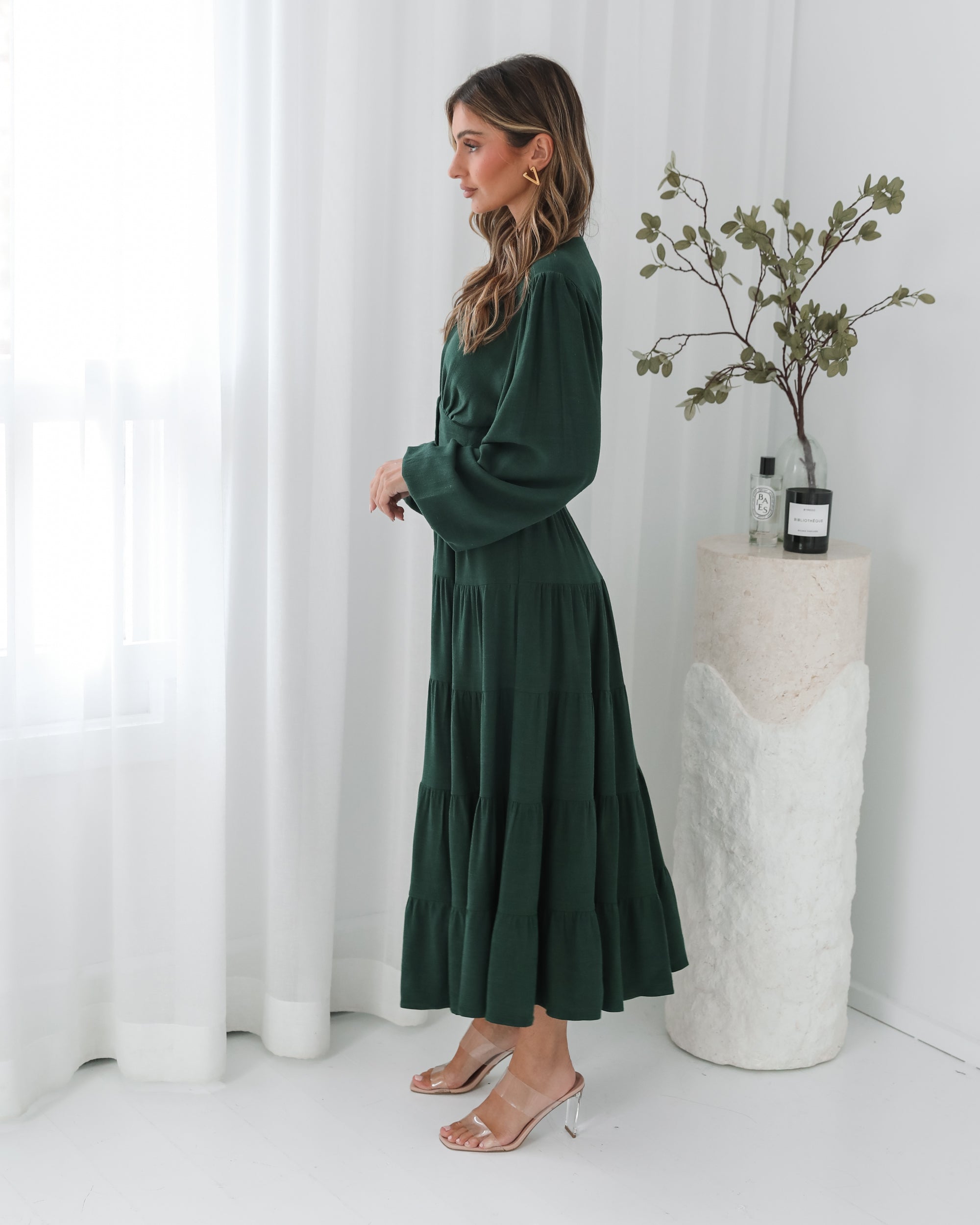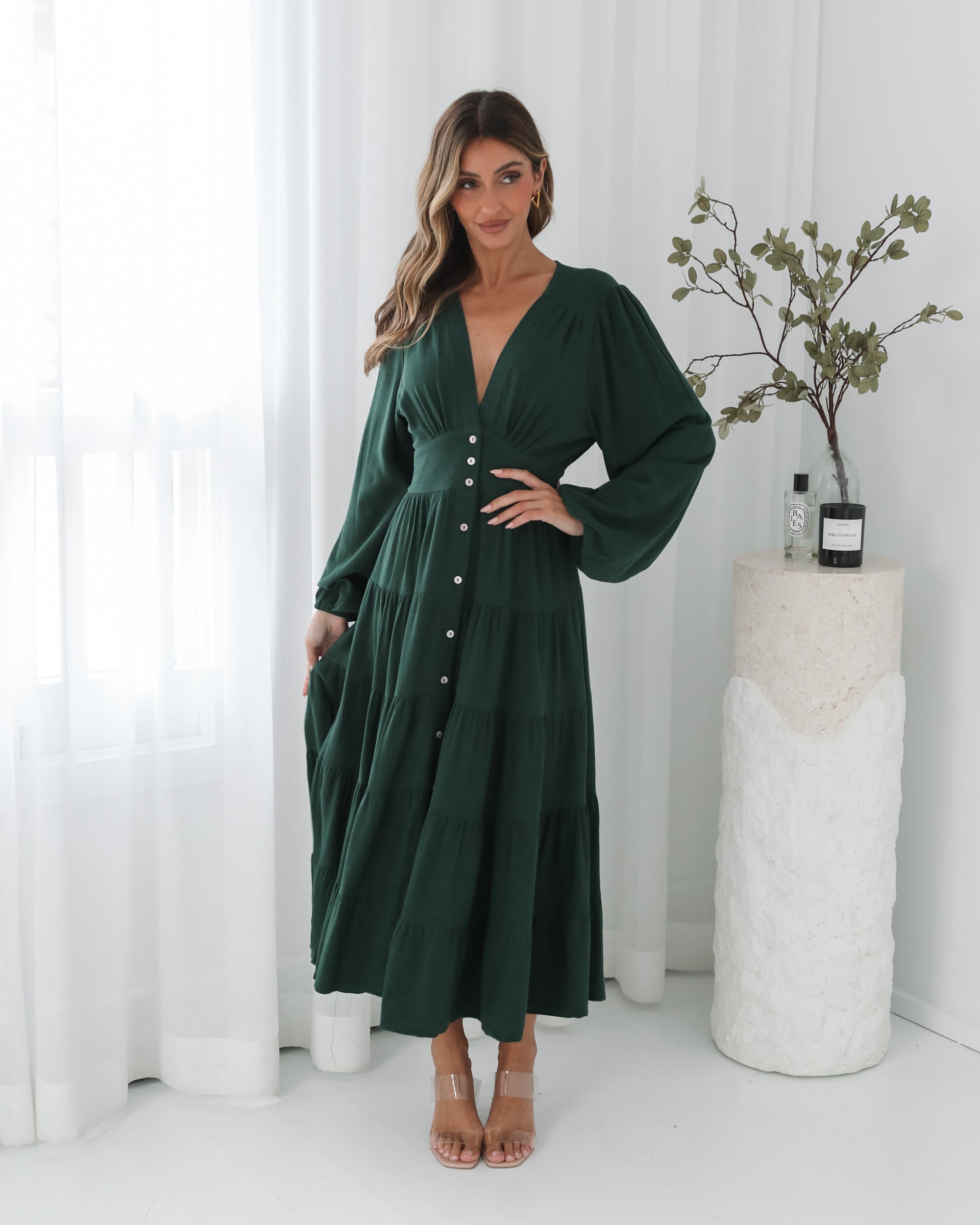 Our Sharina Dress comes in an emerald green colour. The piece for moments that deserve to be remembered, this stunner features a v-neckline, long bishop sleeves, centre-front buttons, flowy tiered skirt and midaxi length hem. Style it with strappy lace-up heels & a bold red lip!