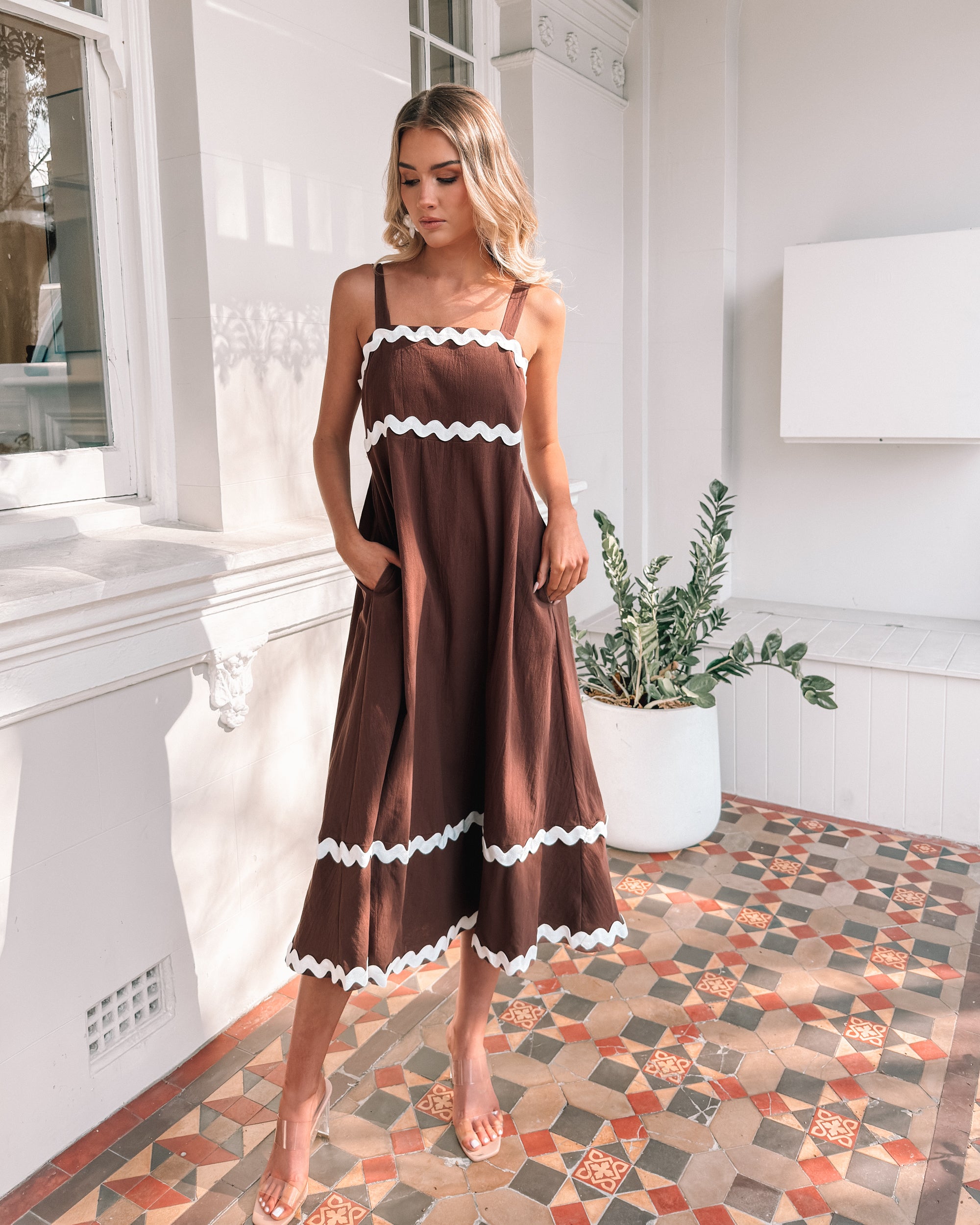 Our Zarienne Dress comes in chocolate brown and white tones. A stunning visual that seamlessly blends subtle sophistication with a touch of playful complexity, this piece is designed with straps, square neckline, flowy a-line skirt and midaxi length hem. Style it with a gold pendant necklace!