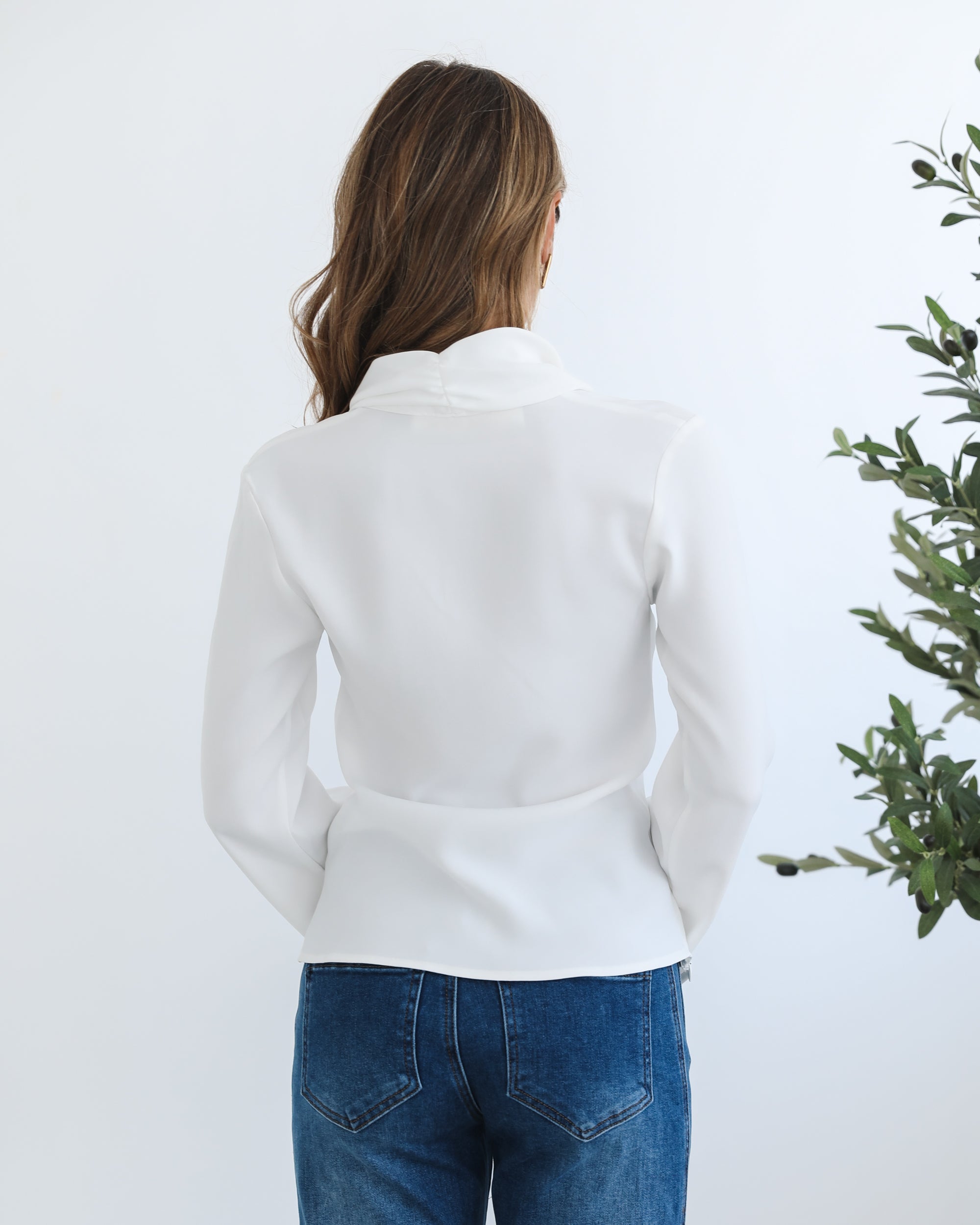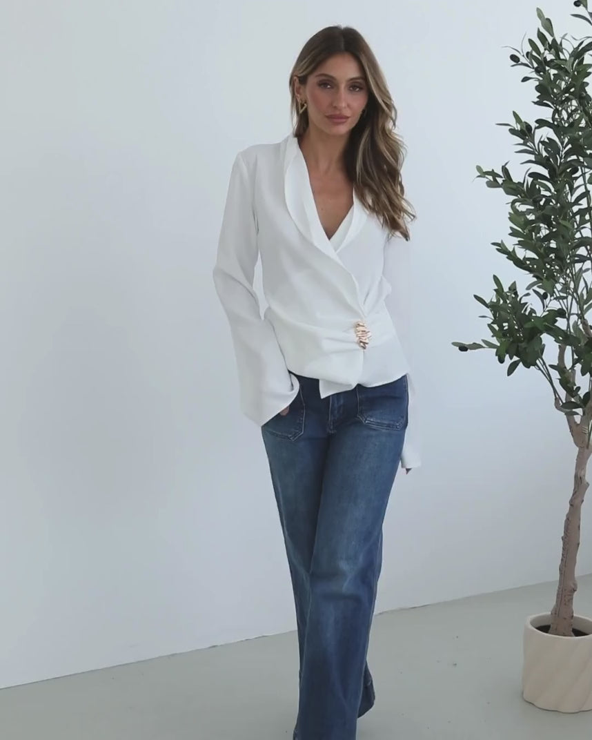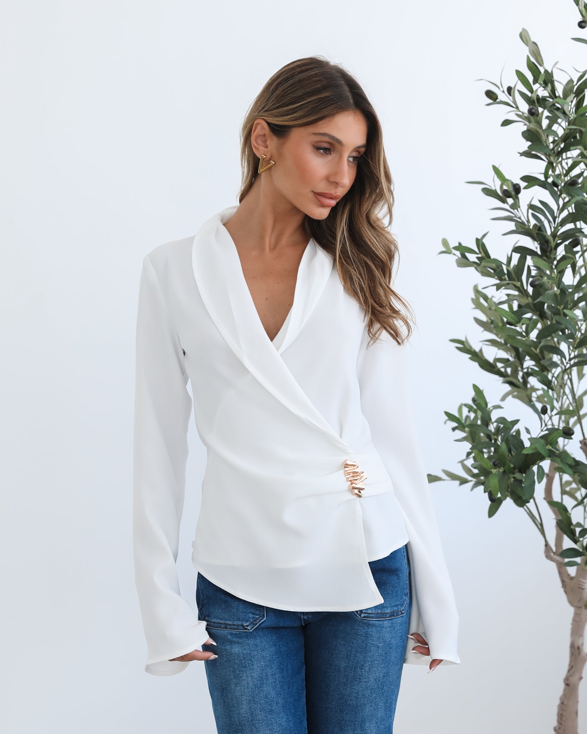 Our Odissa Top comes in white and gold tones. The epitome of effortless refinement, this number is designed with a v-neckline, long sleeves and gold detailing. Pair it with ailored trousers and pointed-toe heels for a sleek, power-dressing moment!