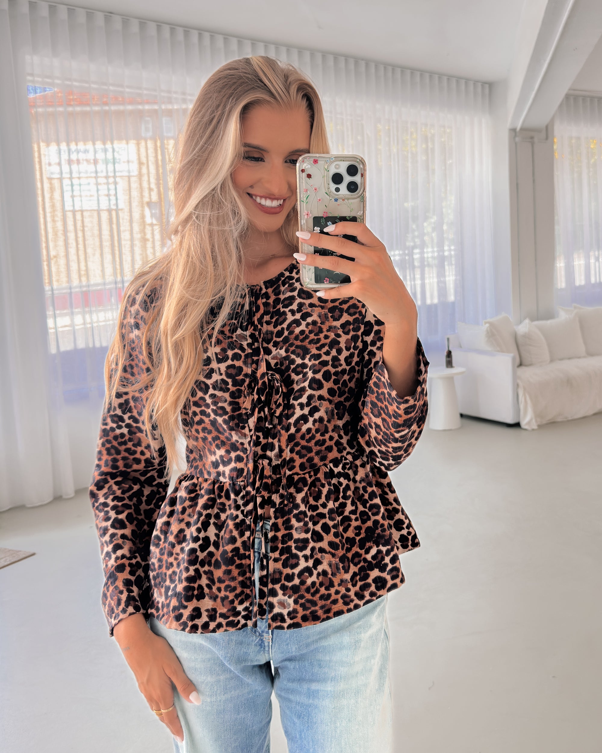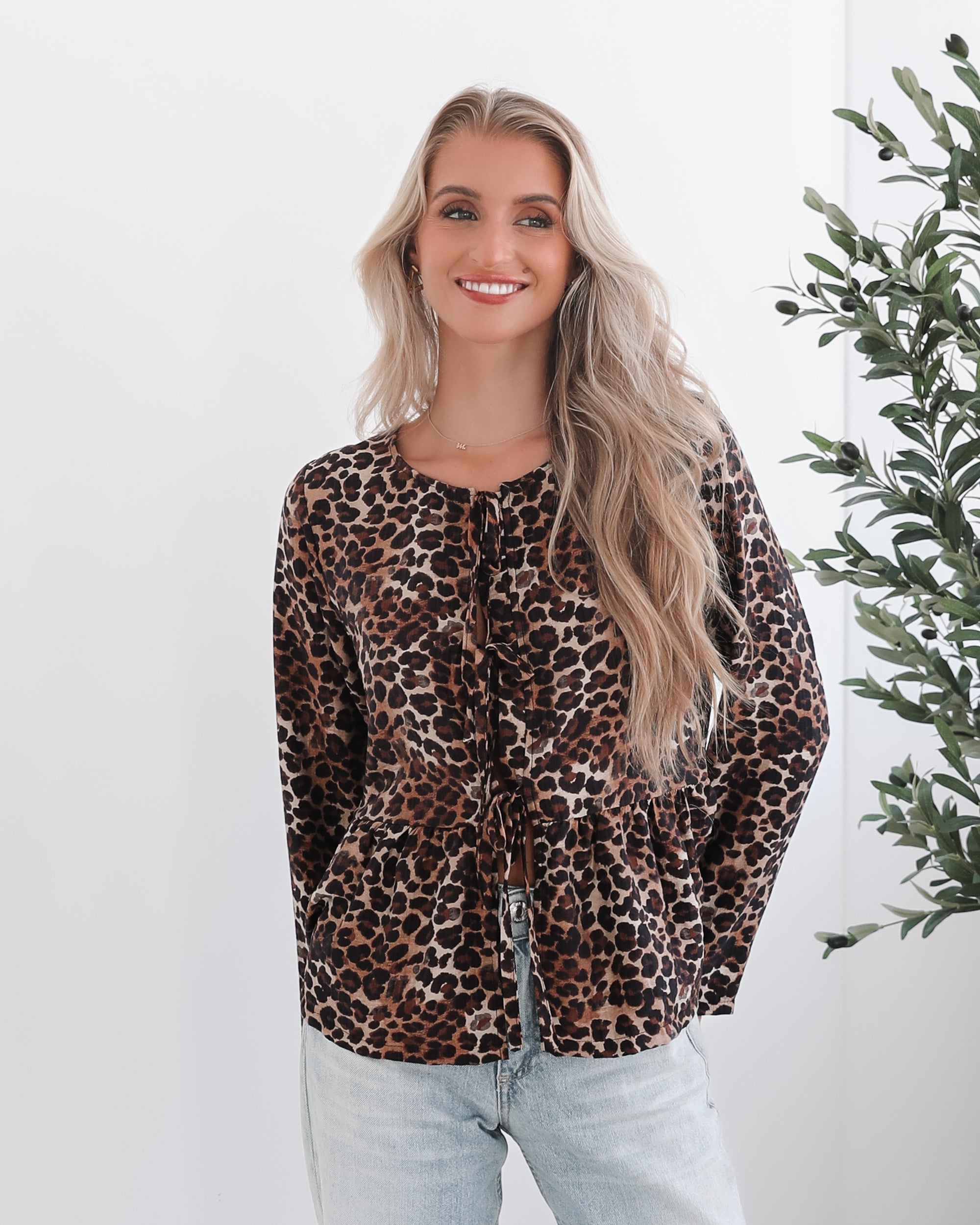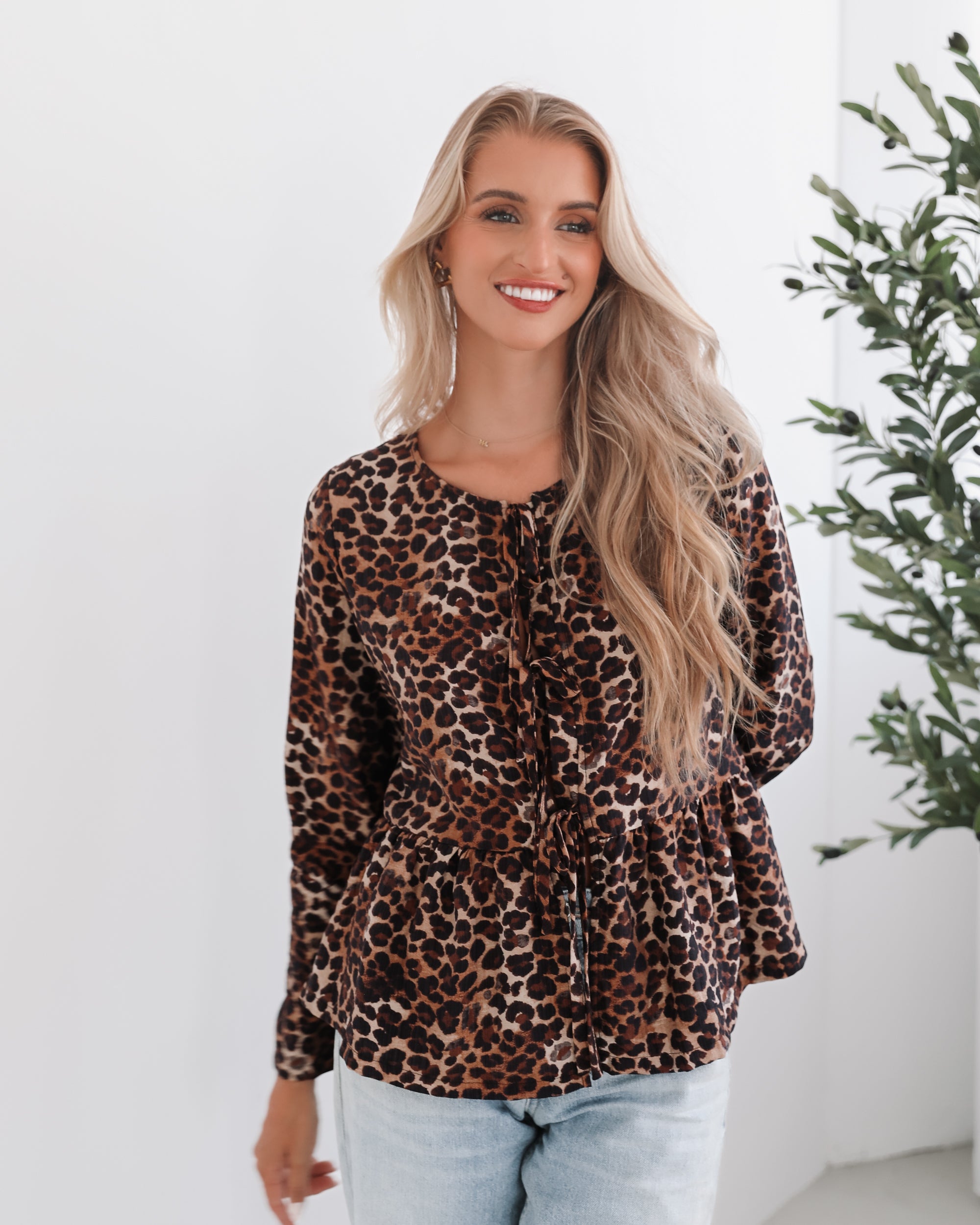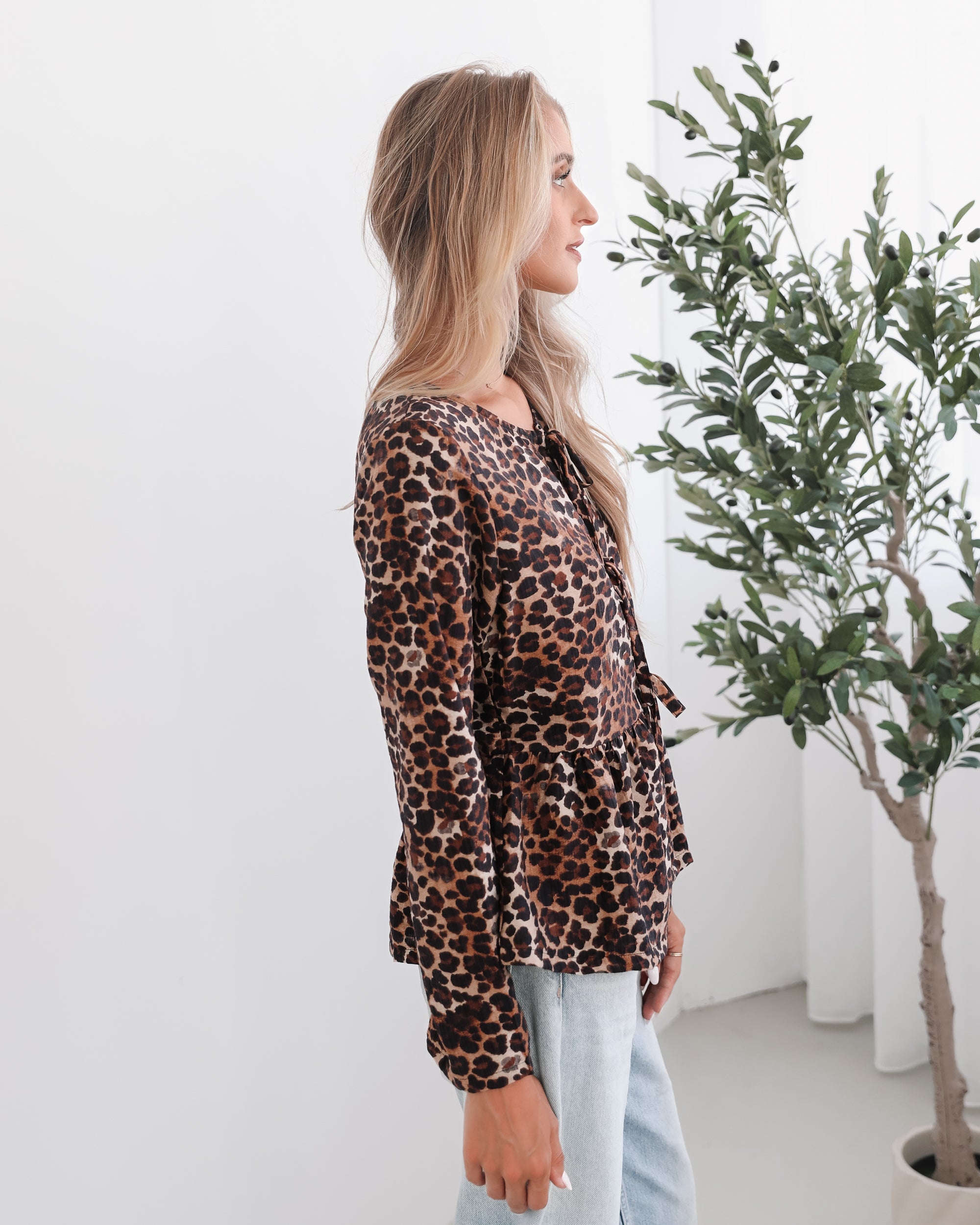 Our Saveria Top comes in shades of brown, black and white. Channel off-duty model energy in this number that features a round neckline, centre-front bow closure, long sleeves and peplum style bodice. For a sleek city vibe, tuck it into high-waisted black trousers and add strappy stilettos!