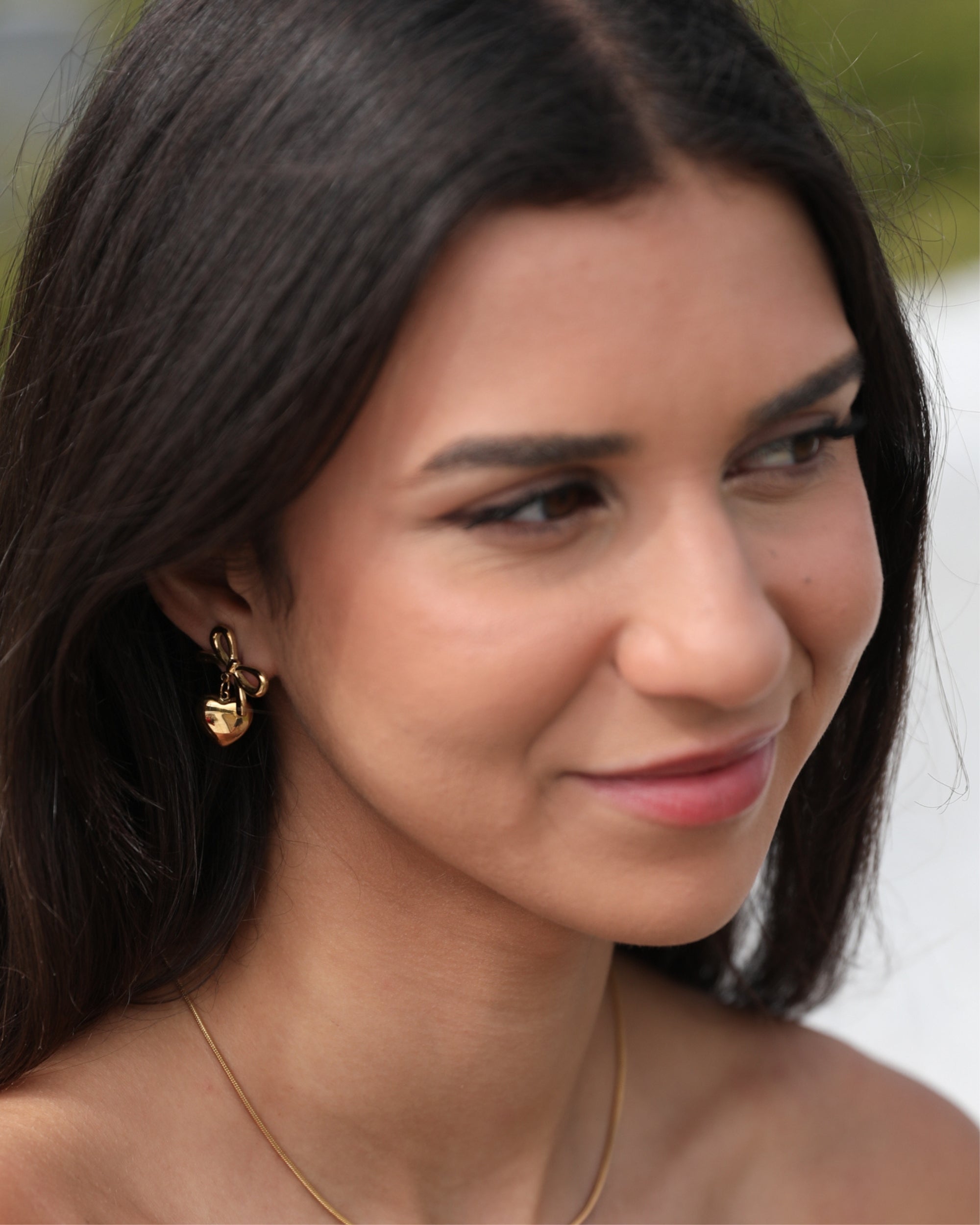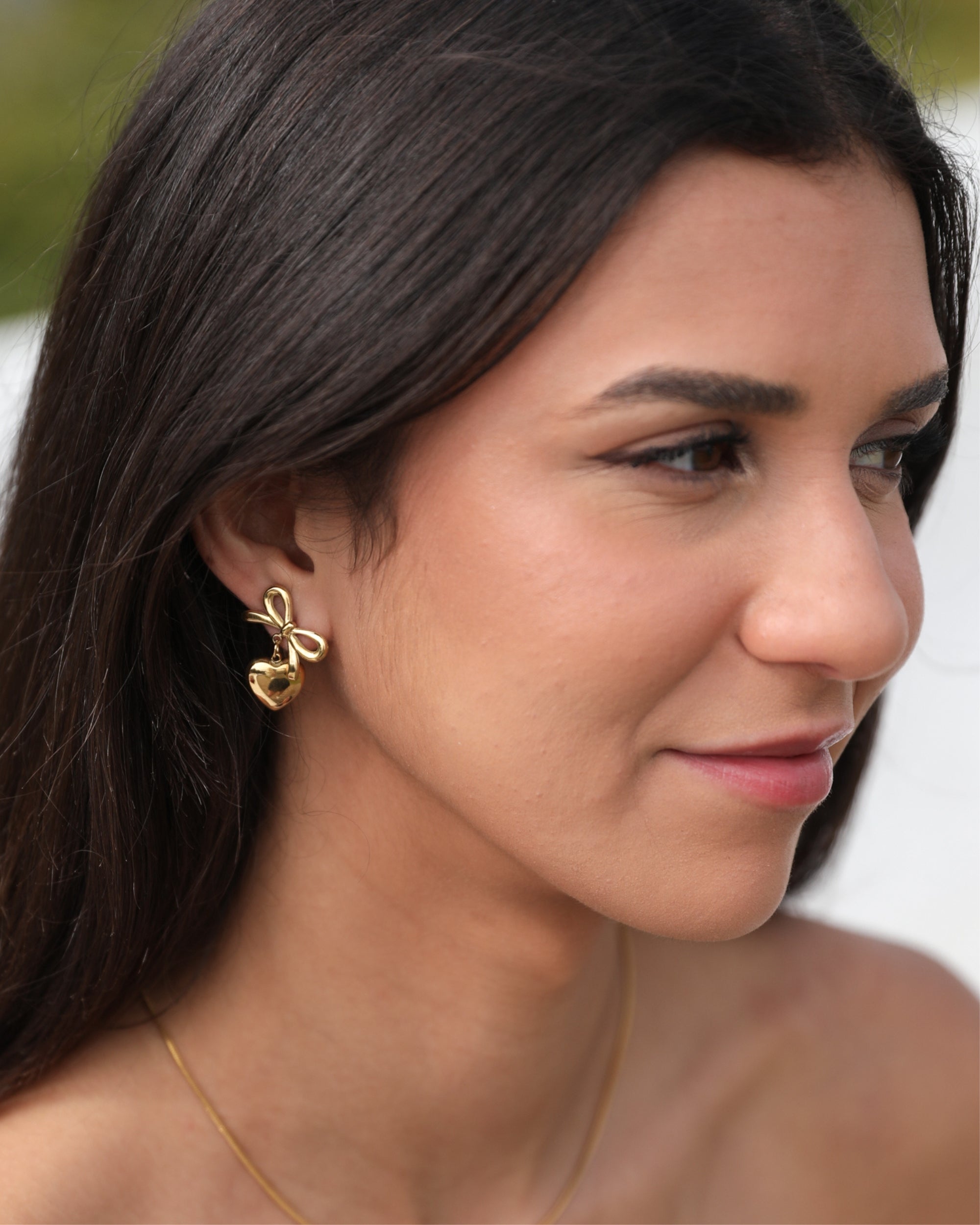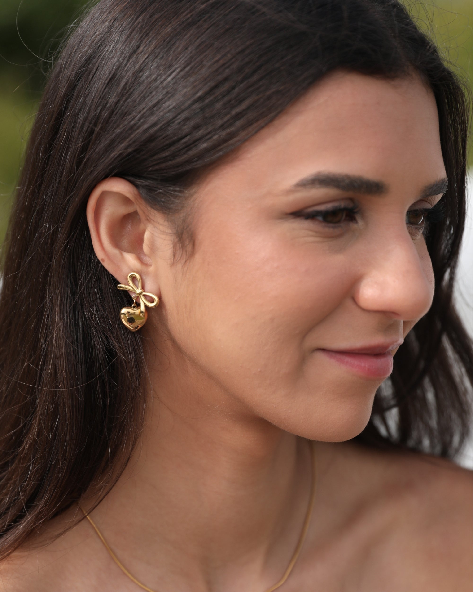 Our Eilonwy Earrings come in a gold colour. Combining romantic symbolism with refined artistry, this pair is designed with a ribbon and heart. Style with a floaty dress and soft curls!