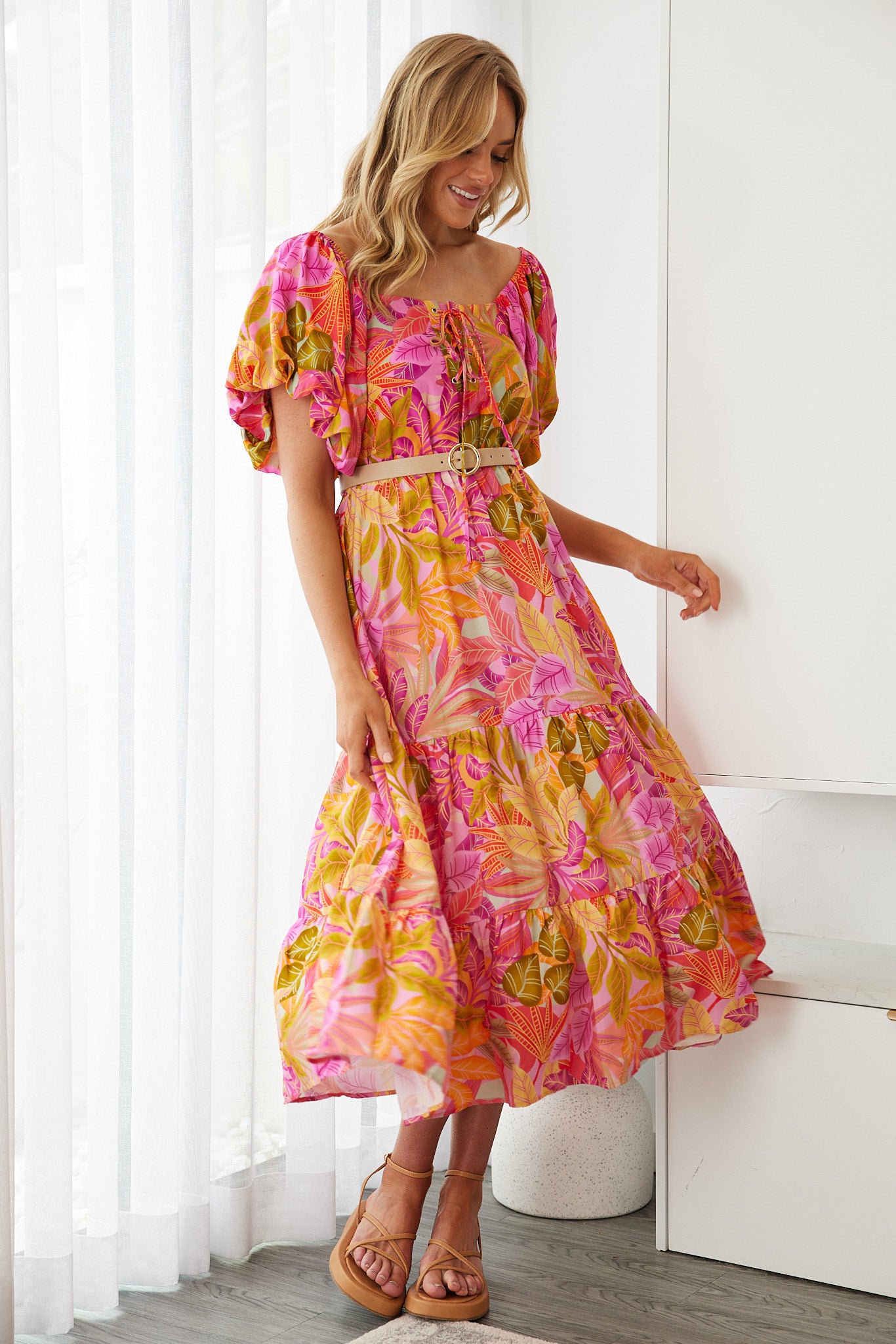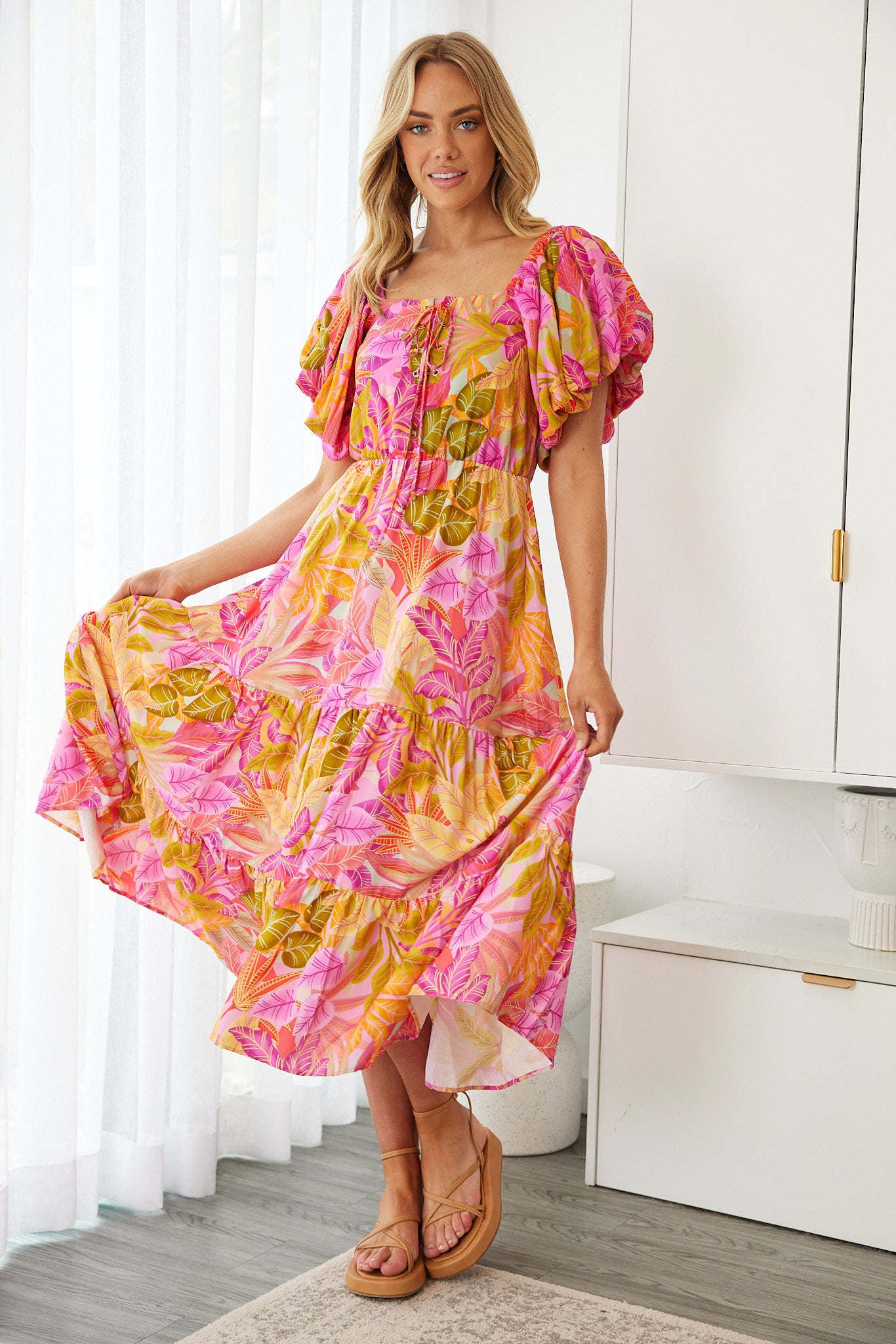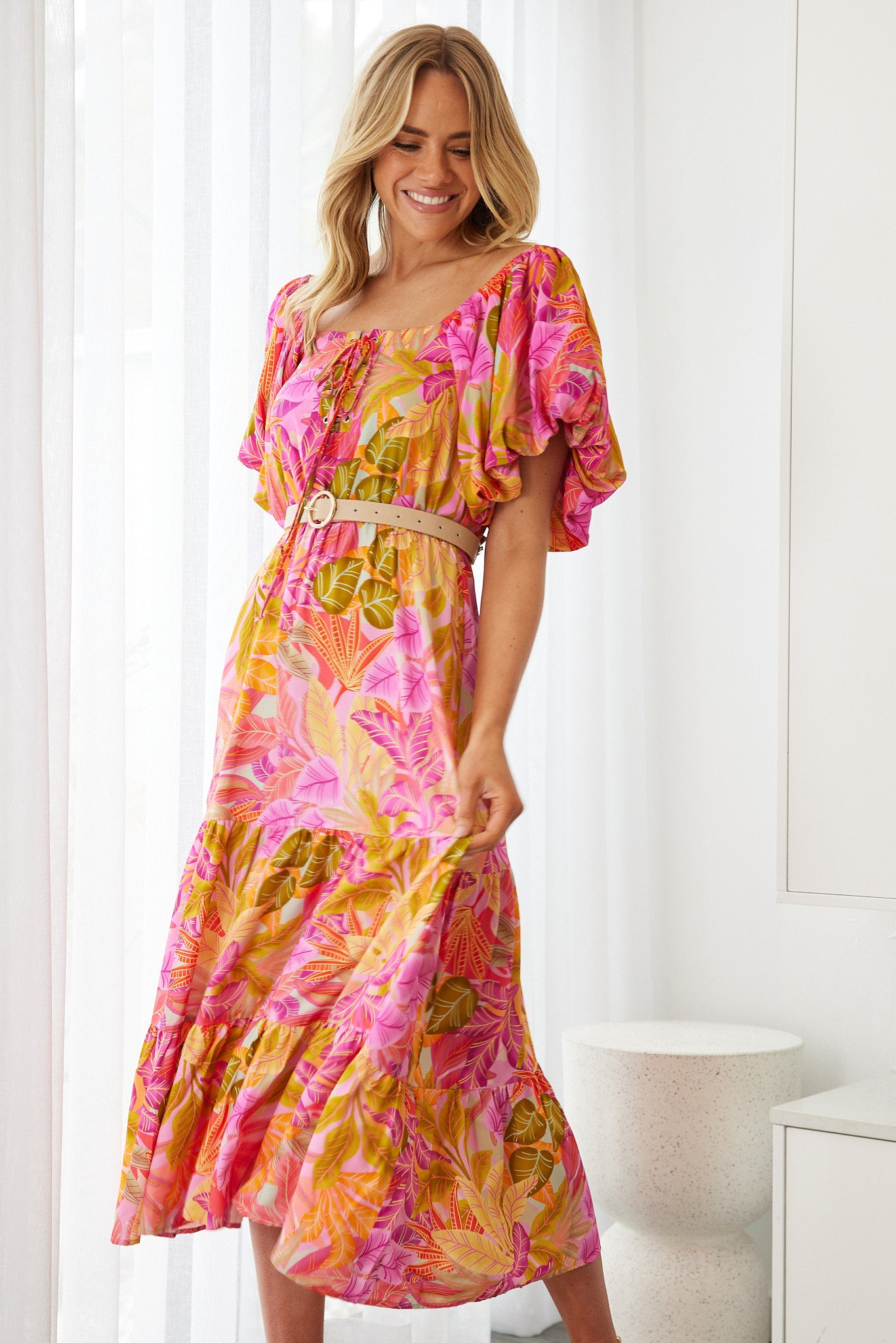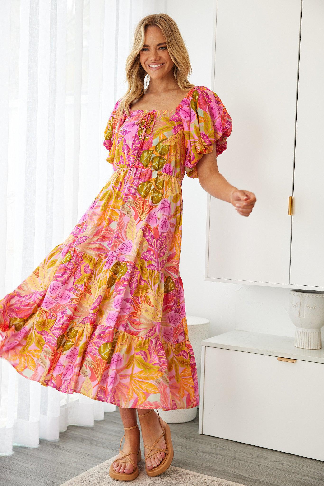 Our Axelle Dress comes in a sunset print. A visual interest that will take over your favourites, this midi is designed with square neckline, tie on front, short puff sleeves and flowy a-line skirt. Match with a sunhat and beaded accessories!