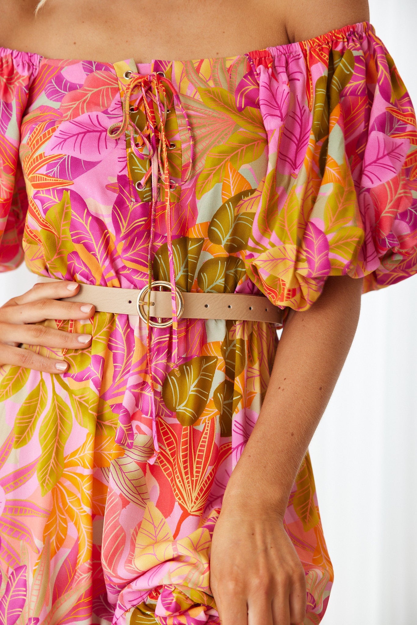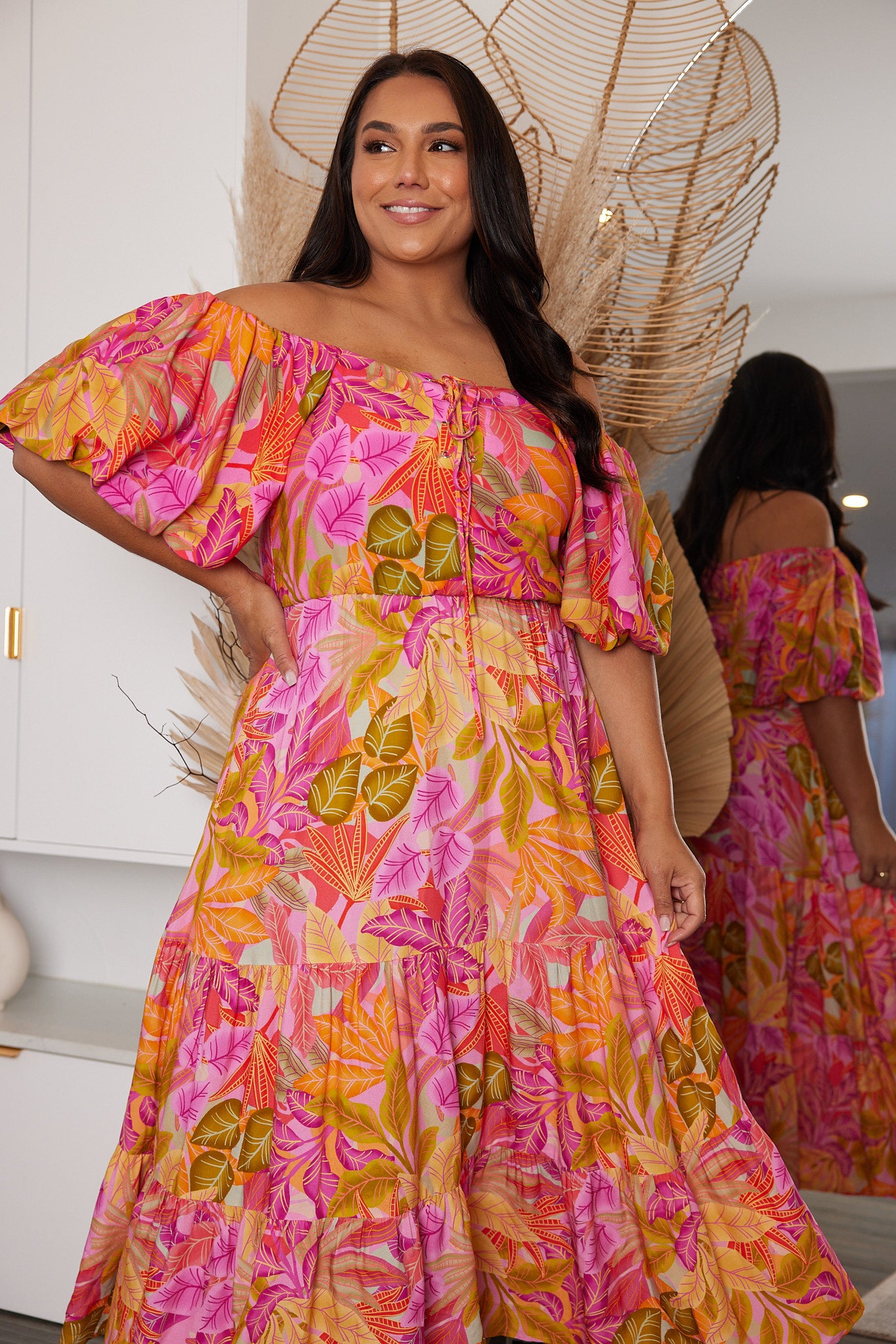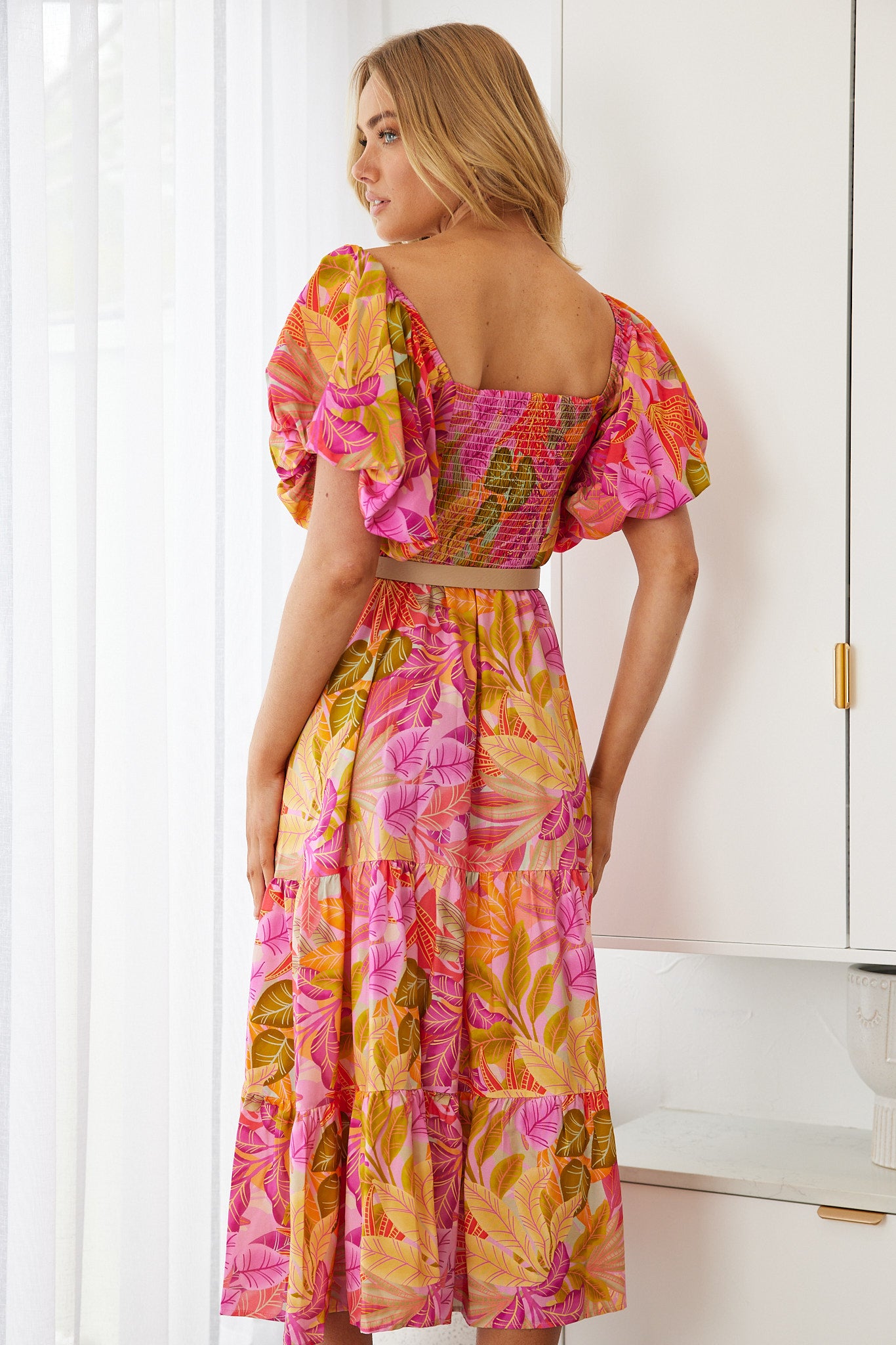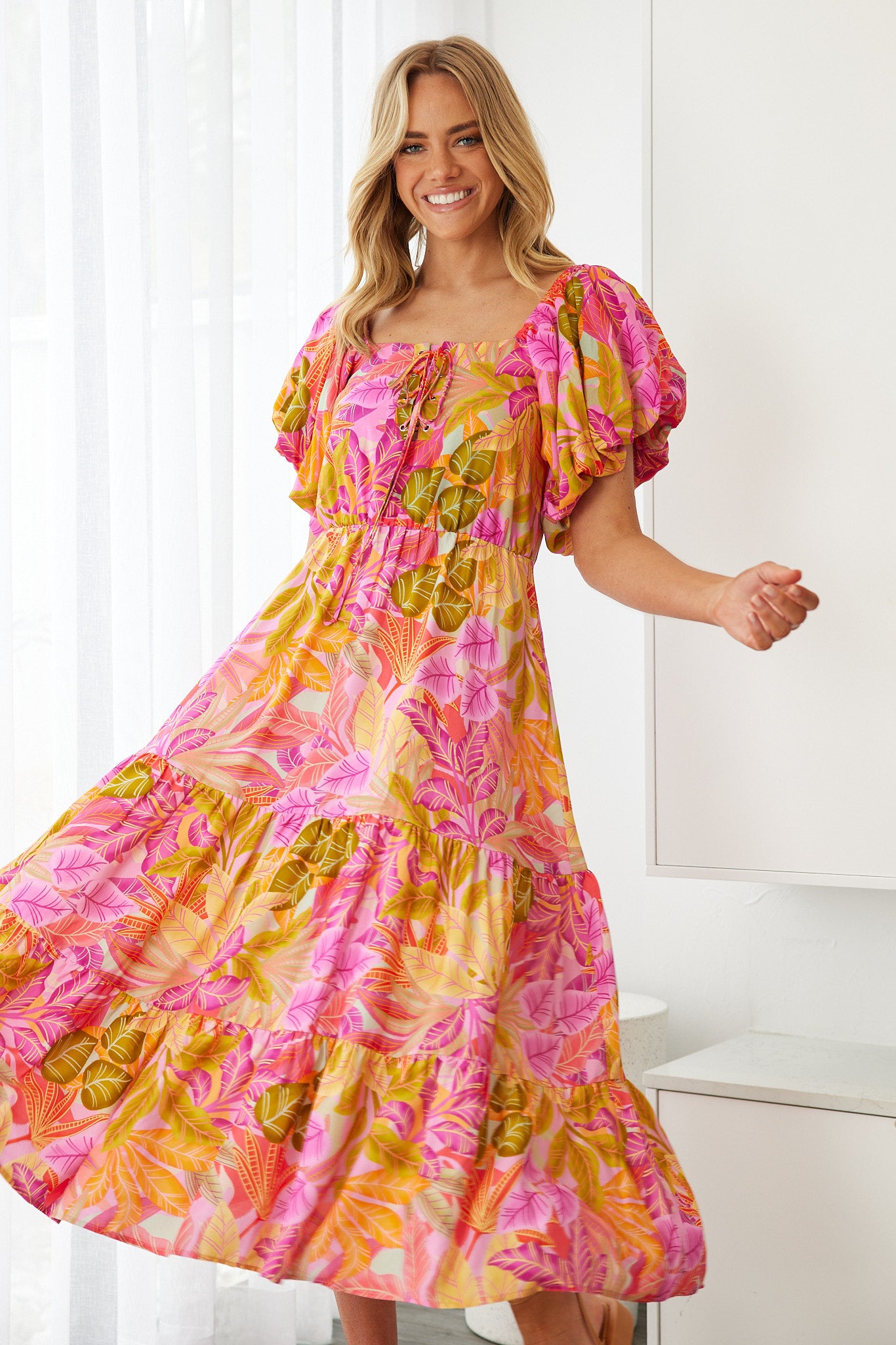 Our Axelle Dress comes in a sunset print. A visual interest that will take over your favourites, this midi is designed with square neckline, tie on front, short puff sleeves and flowy a-line skirt. Match with a sunhat and beaded accessories!