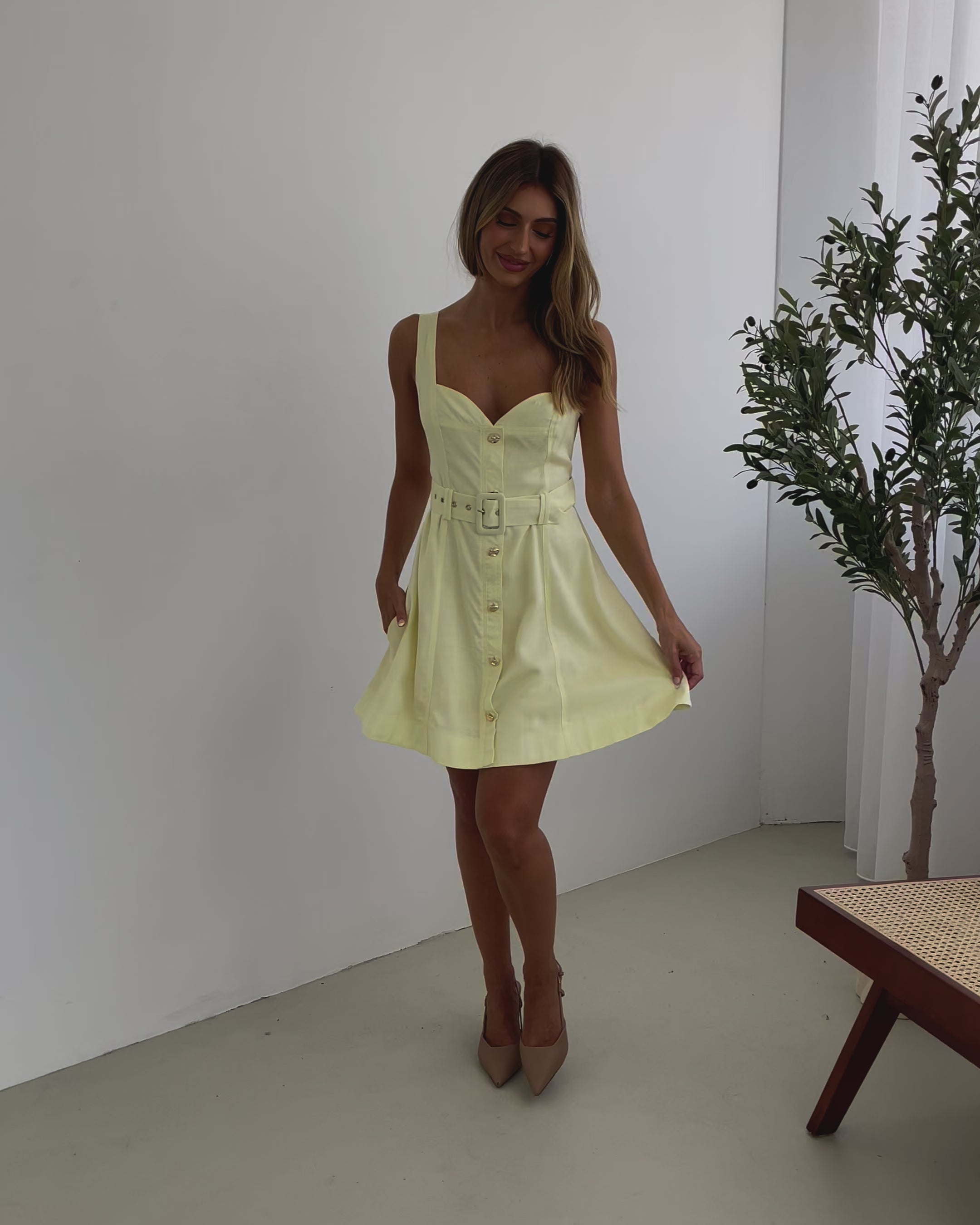 Our Kyveli Dress comes in a yellow tone. Like a ray of sunshine wrapped in casual elegance, this piece is designed with wide straps, sweetheart neckline, centre-front buttons, waist belt, a-line skirt and mini length hem. Add gold statement earrings for a touch of glamour!