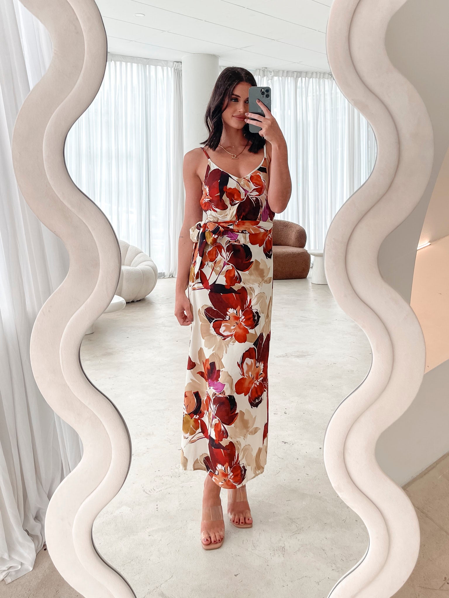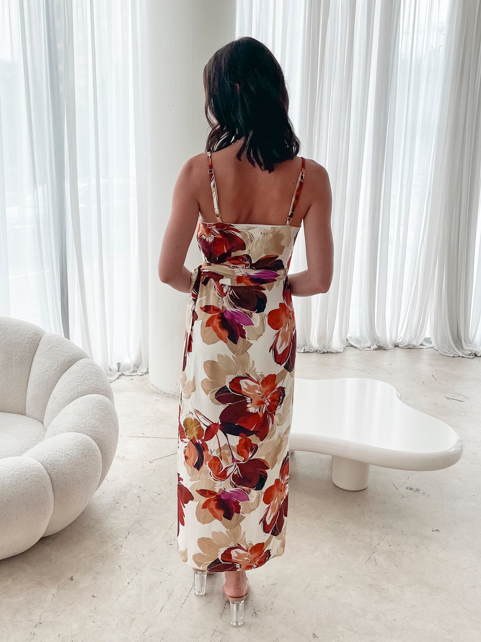 Our Laguna Dress is a gorgeous fawn floral in a light weight non-stretch fabric. This stunning midi features a soft V neckline & side splits that allow for easy strolling. The adjustable straps are customisable to comfort. The slip style dress features a side tie detail (on wearer's left) that you're sure to love.