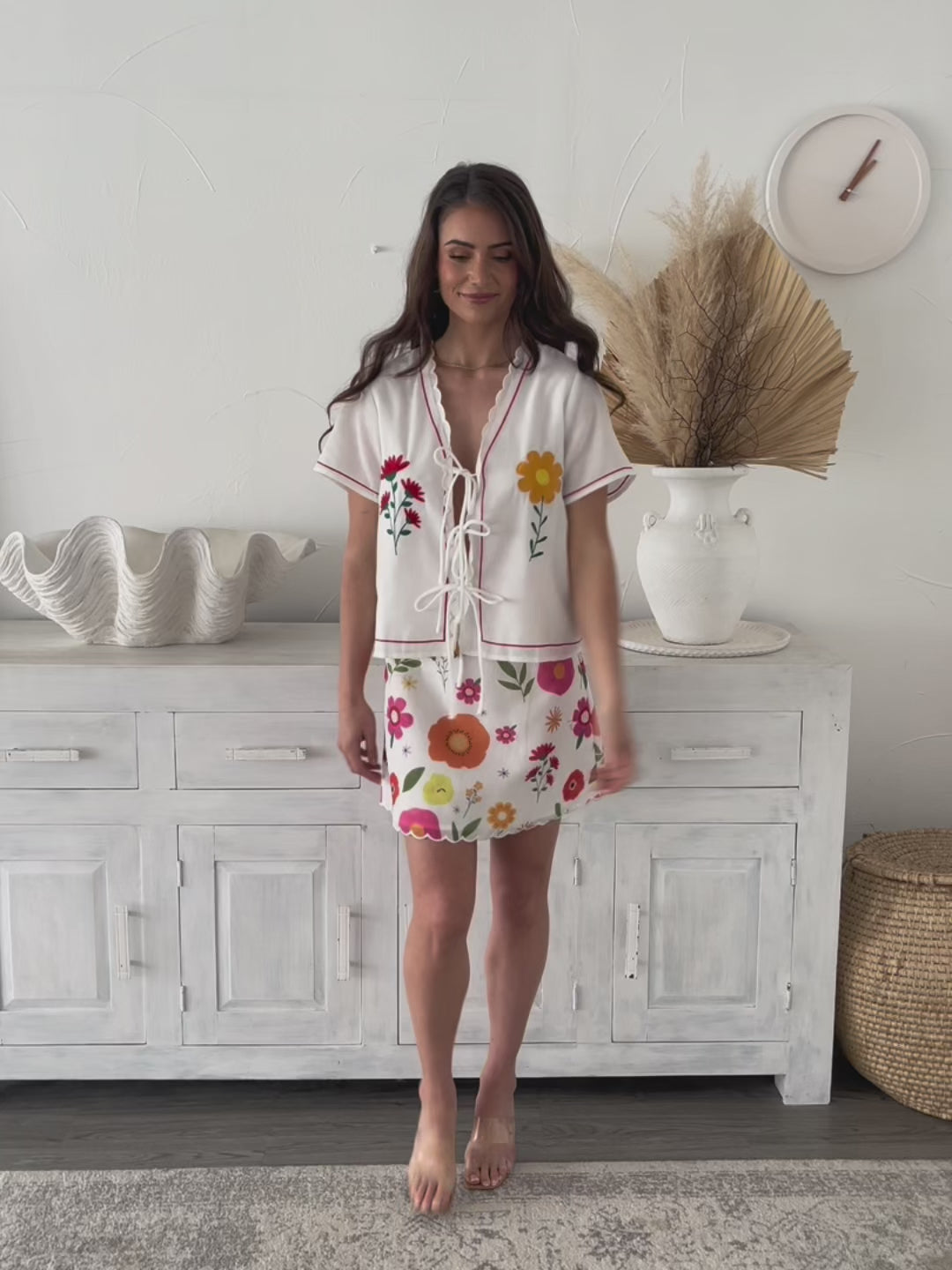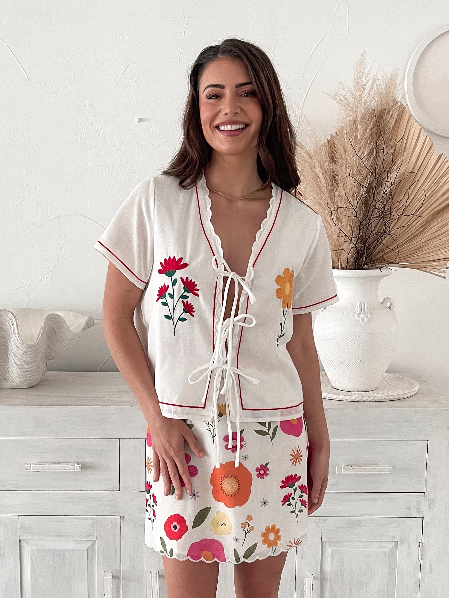 Our Paulette Set comes in a white base with multicoloured floral patterns. Designed to bring a touch of romance to any occasion these create a look that’s as charming as it is versatile—perfect for everything from casual days out to special occasions. Wear them together for an effortlessly chic ensemble or mix and match for endless styling possibilities.
