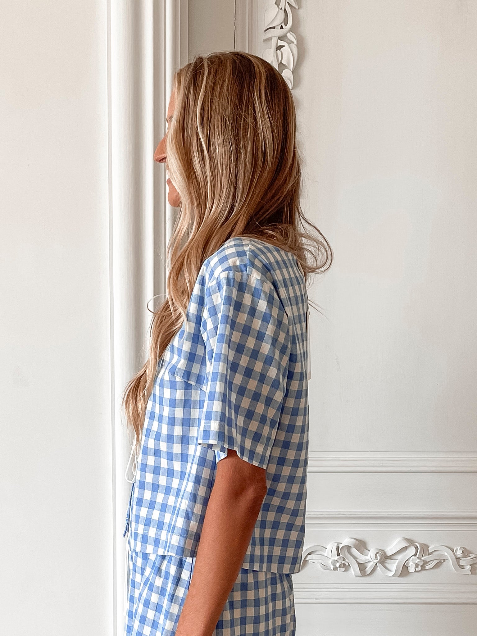 Our Revan Set comes in blue and white tones. Merging vintage inspiration with contemporary, this set features a top and skirt ensemble perfect for leisurely days that still demand a polished appearance.