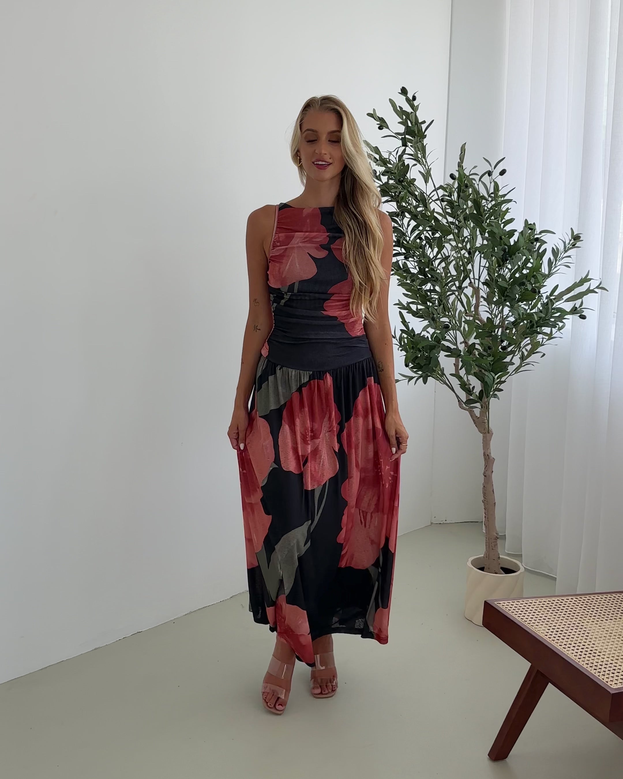 - Key Features: Lined. Boat neckline. Ruched detailing. Flowy skirt. Maxi length hem