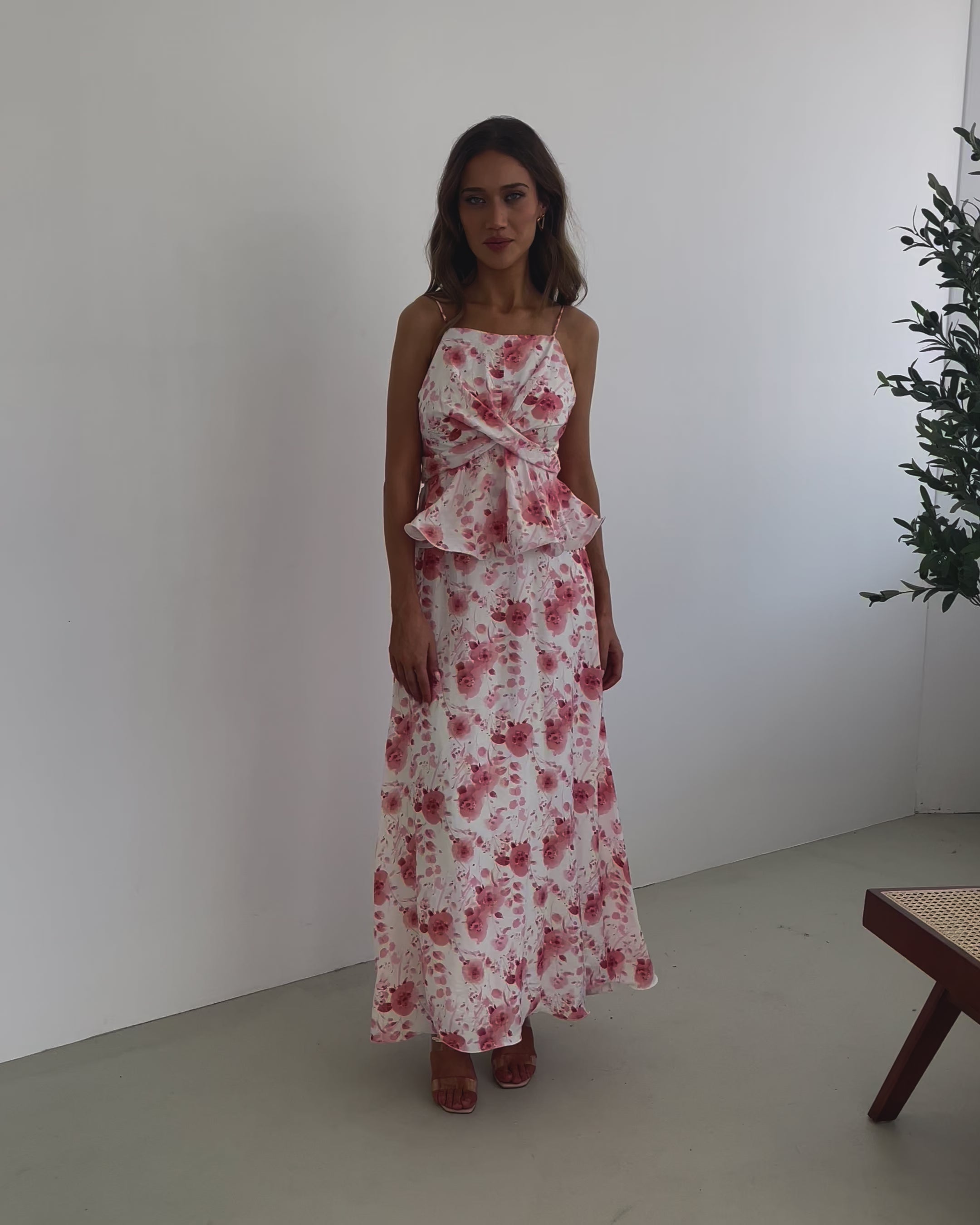 - Key Features: Spaghetti straps. Square neckline. Layered flowy bodice. A-line skirt. Maxi length hem.