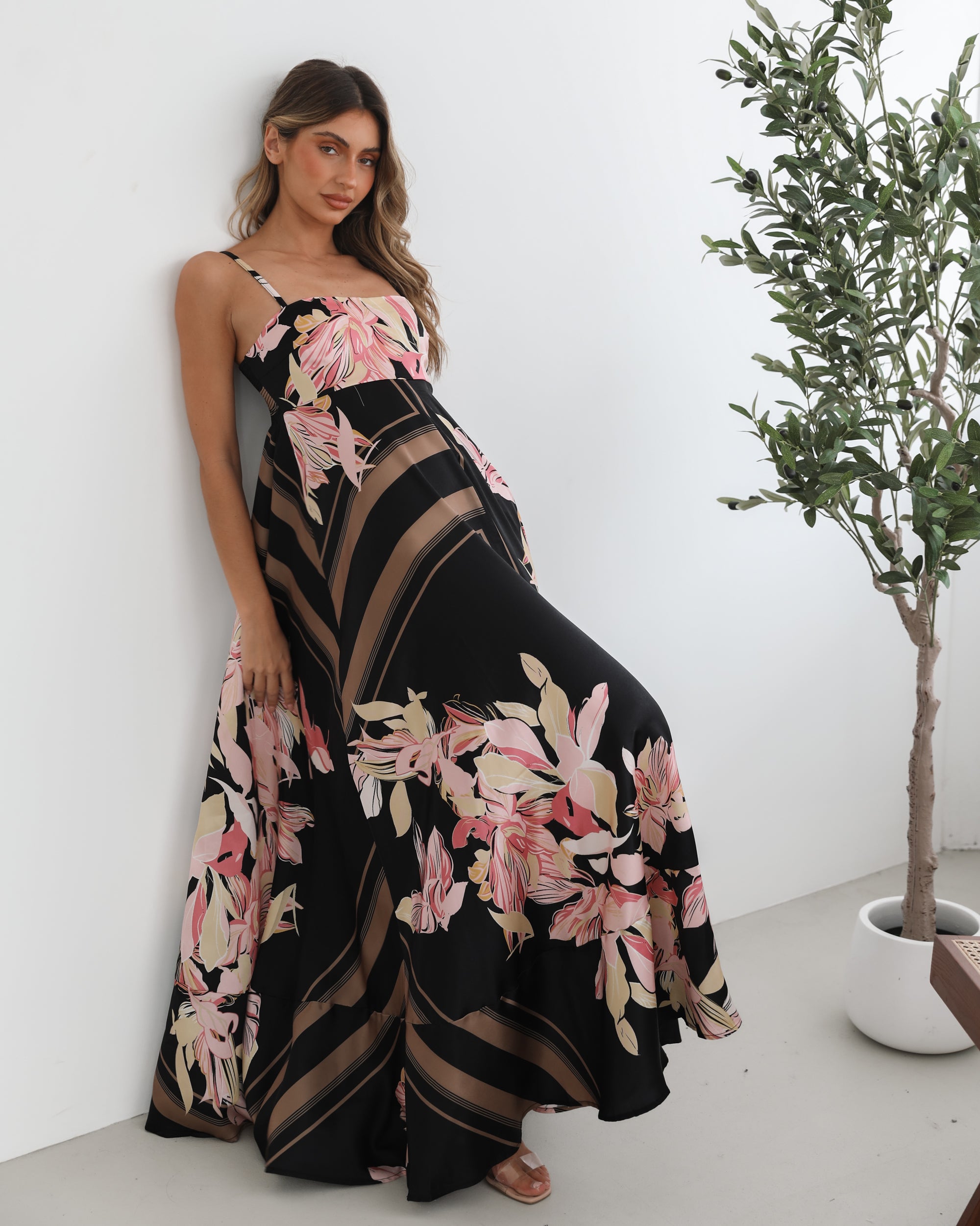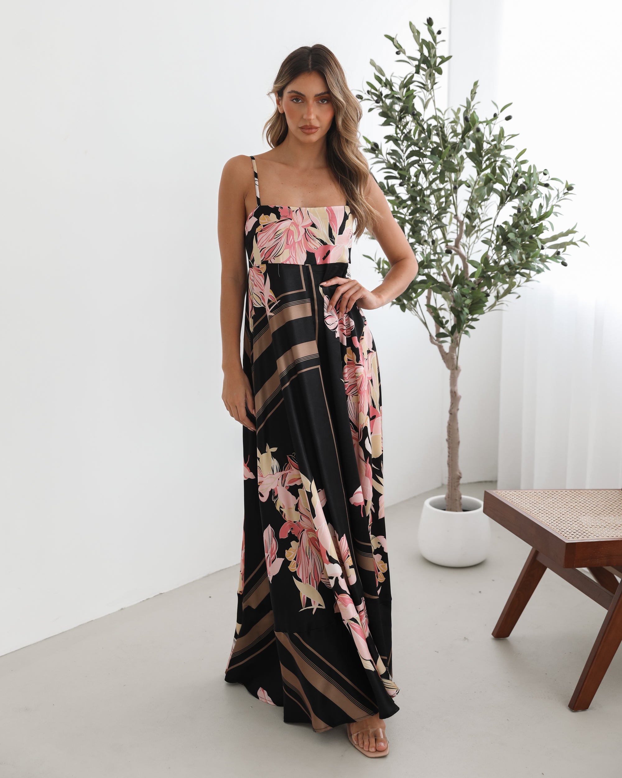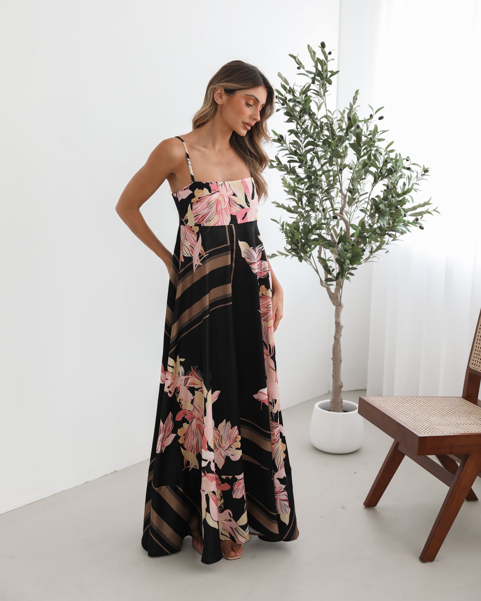Our Deyah Dress comes in a black base with multi-toned floral prints. For a day out in town or a last minute outing, let this maxi take you everywhere with its spaghetti straps, square neckline and long flowy skirt. Pair with espradille sandals and a tote bag!