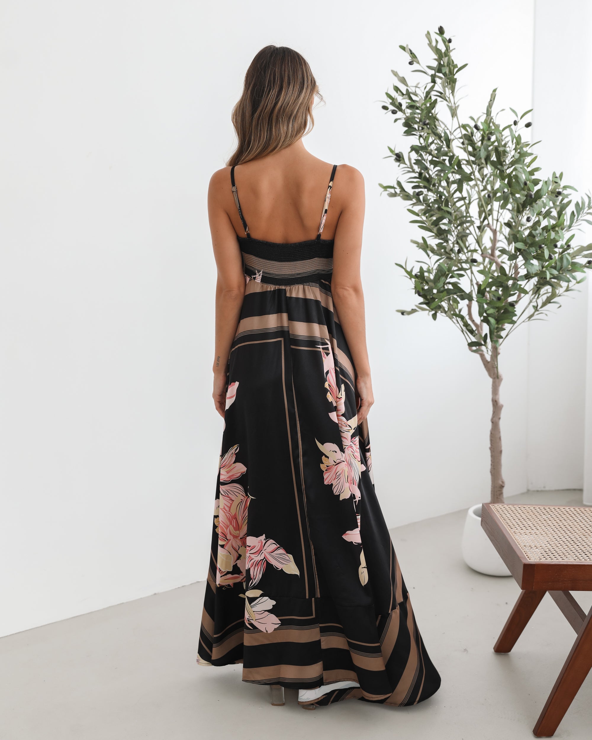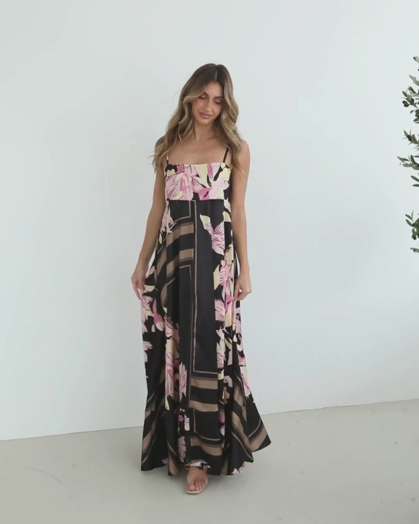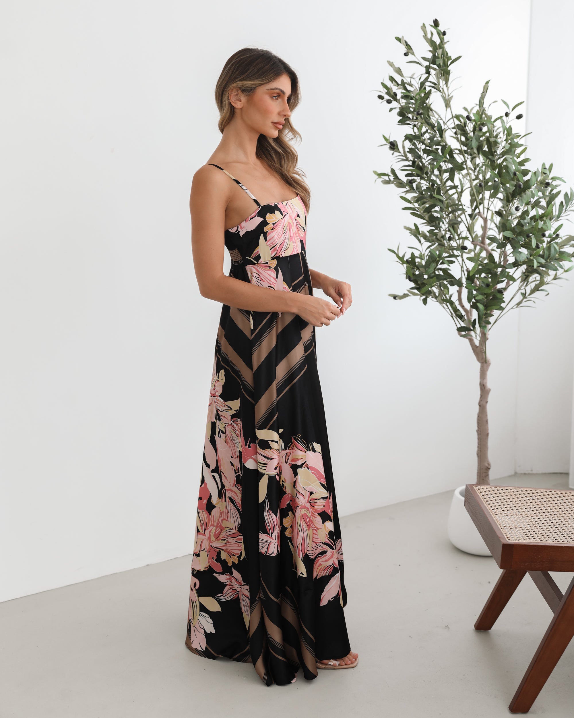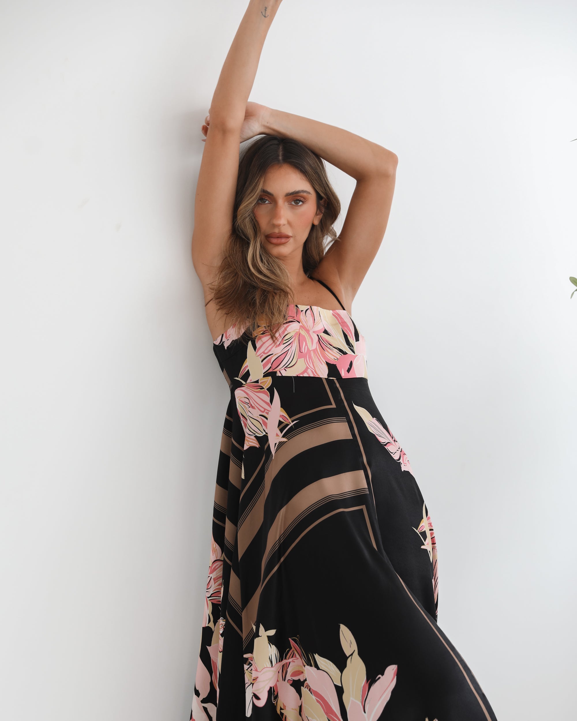 Our Deyah Dress comes in a black base with multi-toned floral prints. For a day out in town or a last minute outing, let this maxi take you everywhere with its spaghetti straps, square neckline and long flowy skirt. Pair with espradille sandals and a tote bag!