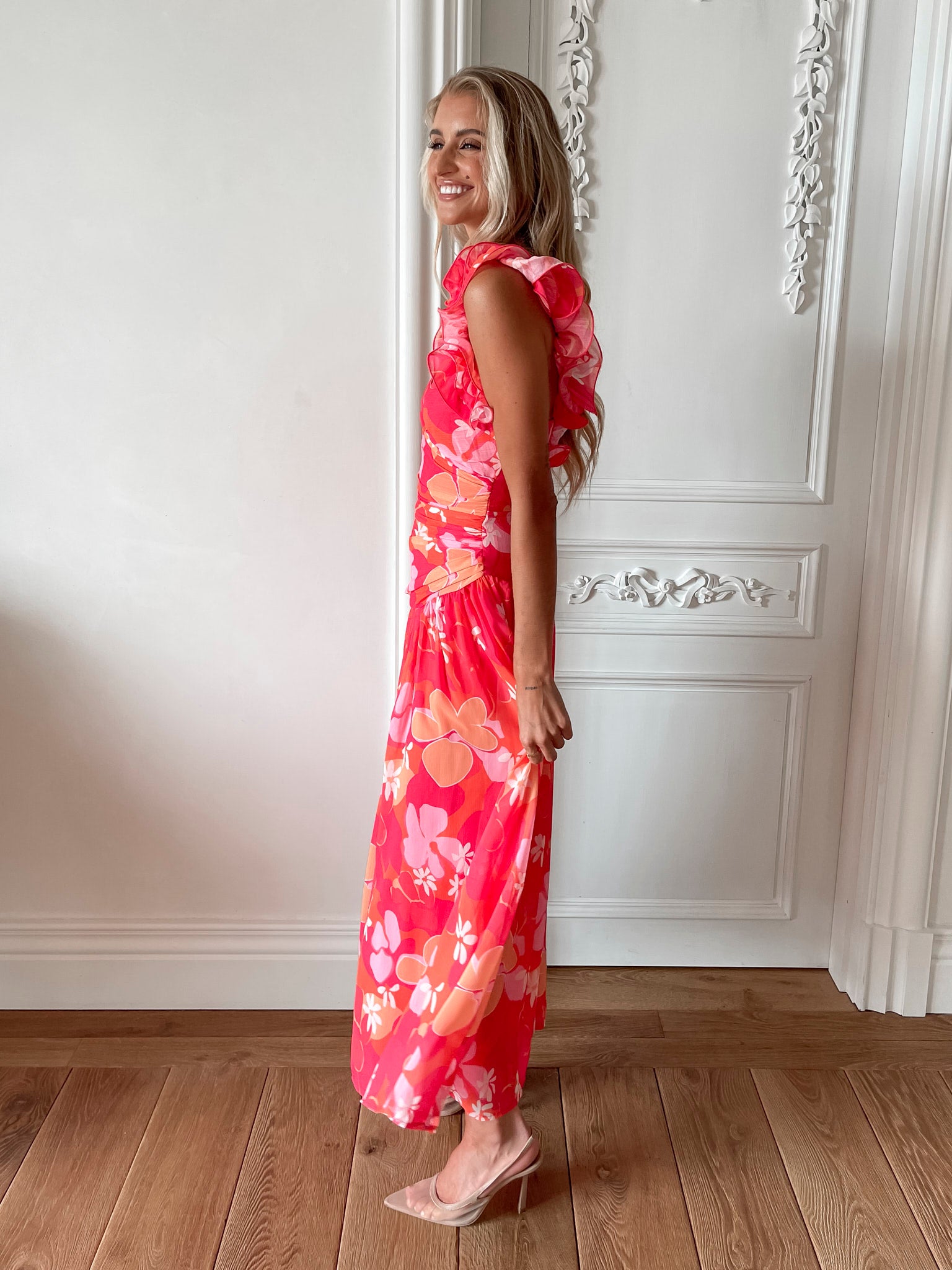 Our Emmaline Dress comes in an orange base with multicoloured floral prints. Look striking in this number that is a celebration of bold blooms and lively hues, this piece is designed with a frill on the shoulder, low v-neckline, overlap on bodice, ruching on waist, flowy light skirt and maxi length hem. Match it with dangling earrings and all eyes will be on you!