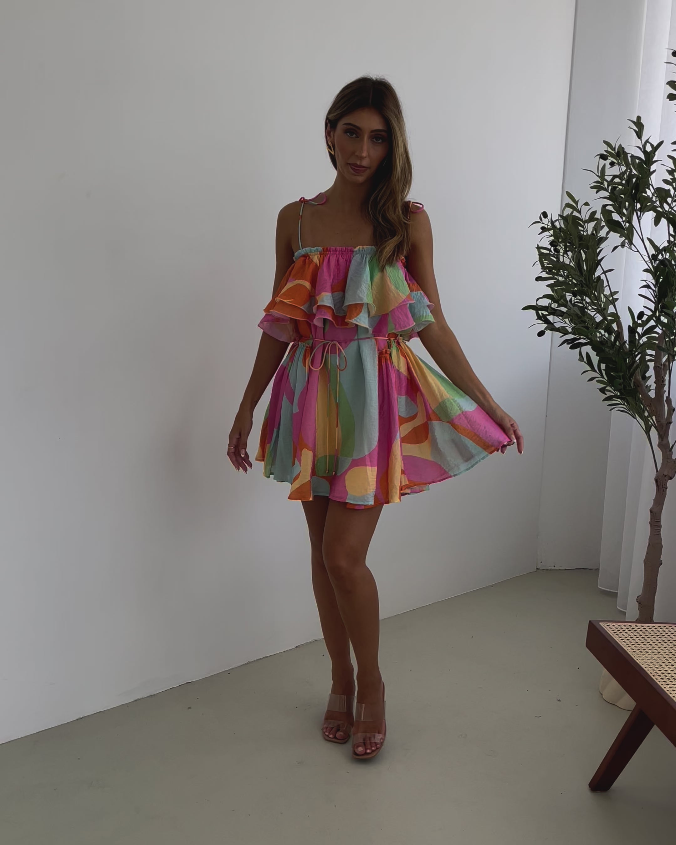 - Key Features: Self tie straps. Square neckline. Layered bodice. Waist string. Flowy skirt. Mini length hem.