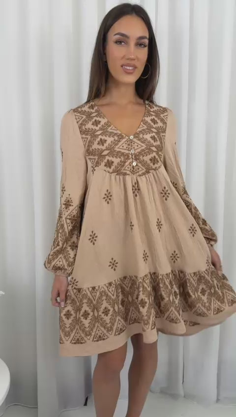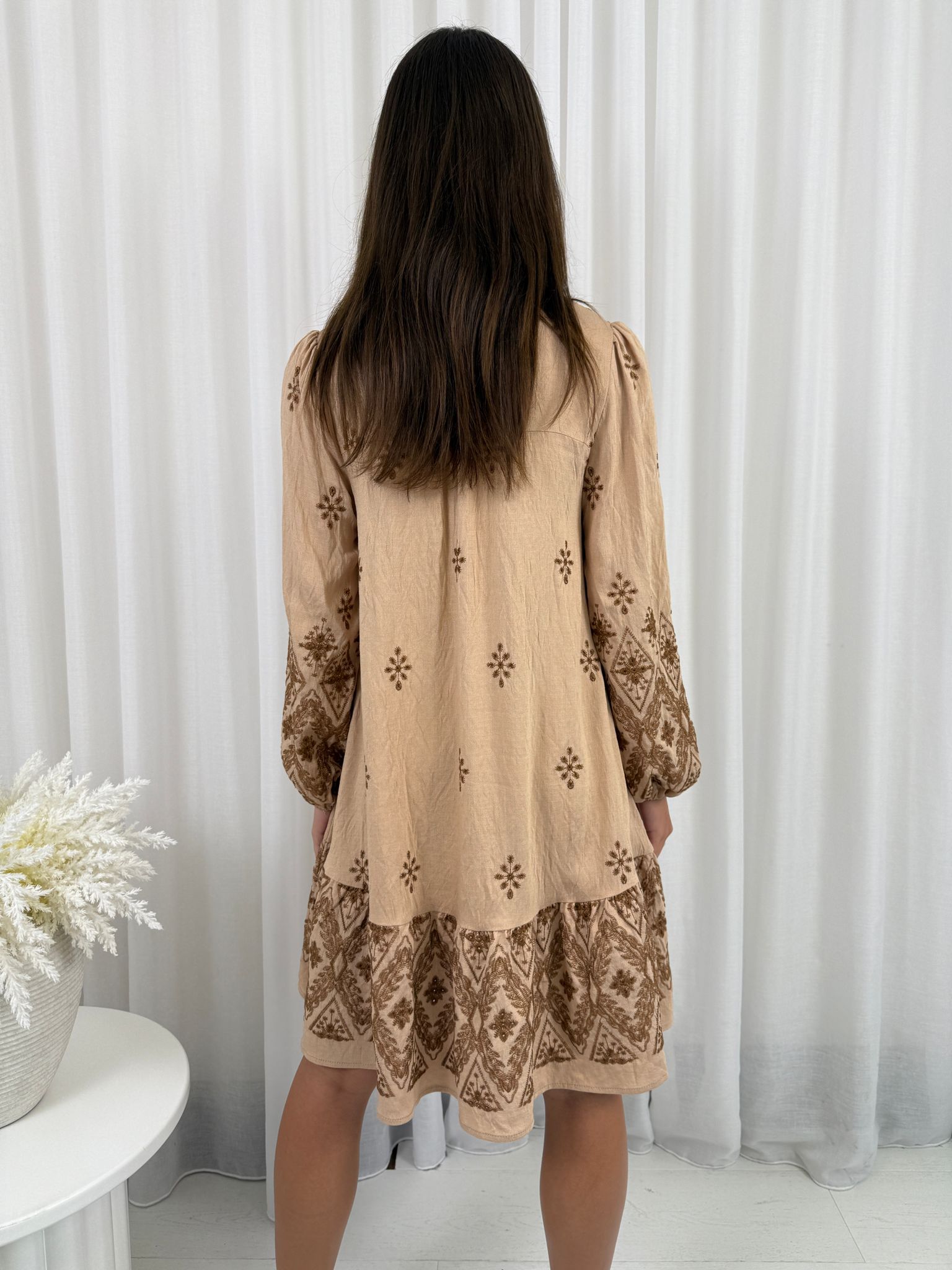 Our Jenayah Dress comes in a tan brown colour. For sun-chasing afternoons, this number features a v-neckline with buttons, long bishop sleeves, relaxed fit and knee length hem. Style it with sandals and a woven bag for an effortlessly bohemian vibe!