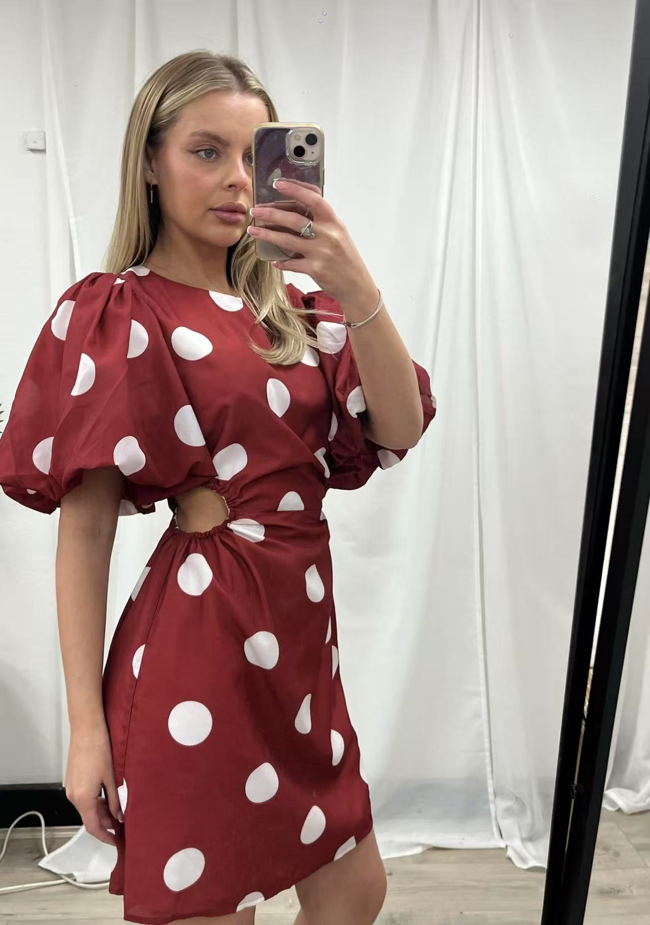 Our Shahnaz Dress comes in elegant wine and white tones, blending vintage charm with modern flair. Featuring bold puff sleeves and classic white polka dots, this mini dress offers a playful yet feminine silhouette. Style it with strappy heels or ankle boots and a structured handbag for an effortlessly chic look!