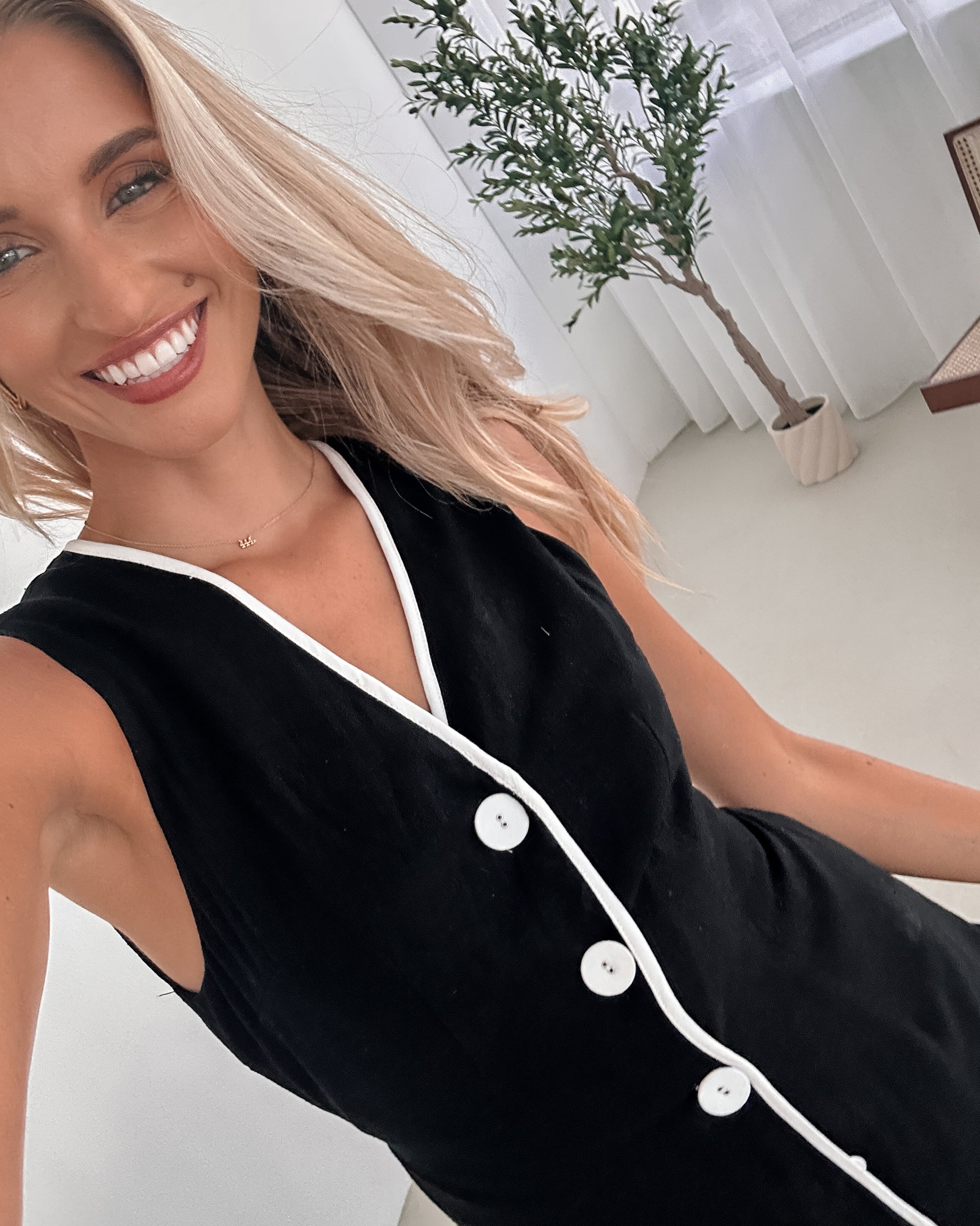 Our Shaleena Dress comes in a black base with white prints. Adding a touch of understated drama to your summer wardrobe, this number is designed with a v-neckline, centre-front buttons, relaxed fit and mini length hem. Sip latte in a cafe while looking all gorgeous with slip on flats and a silver jewellery!