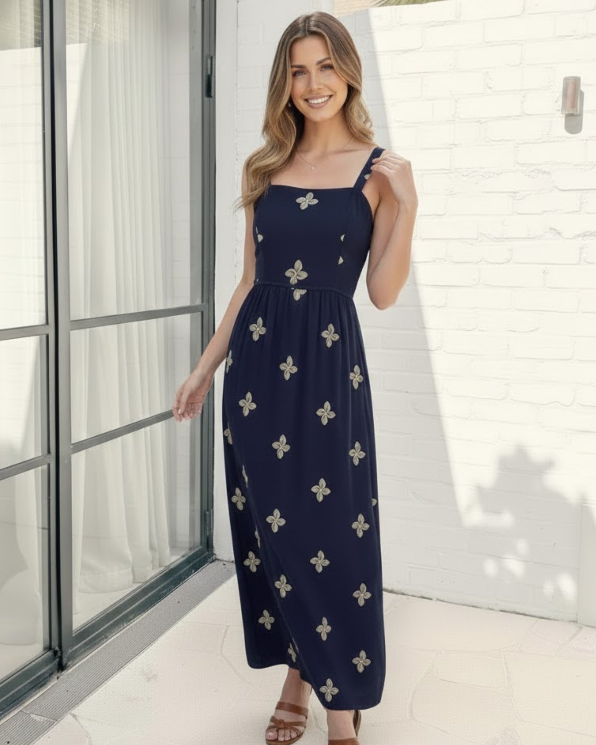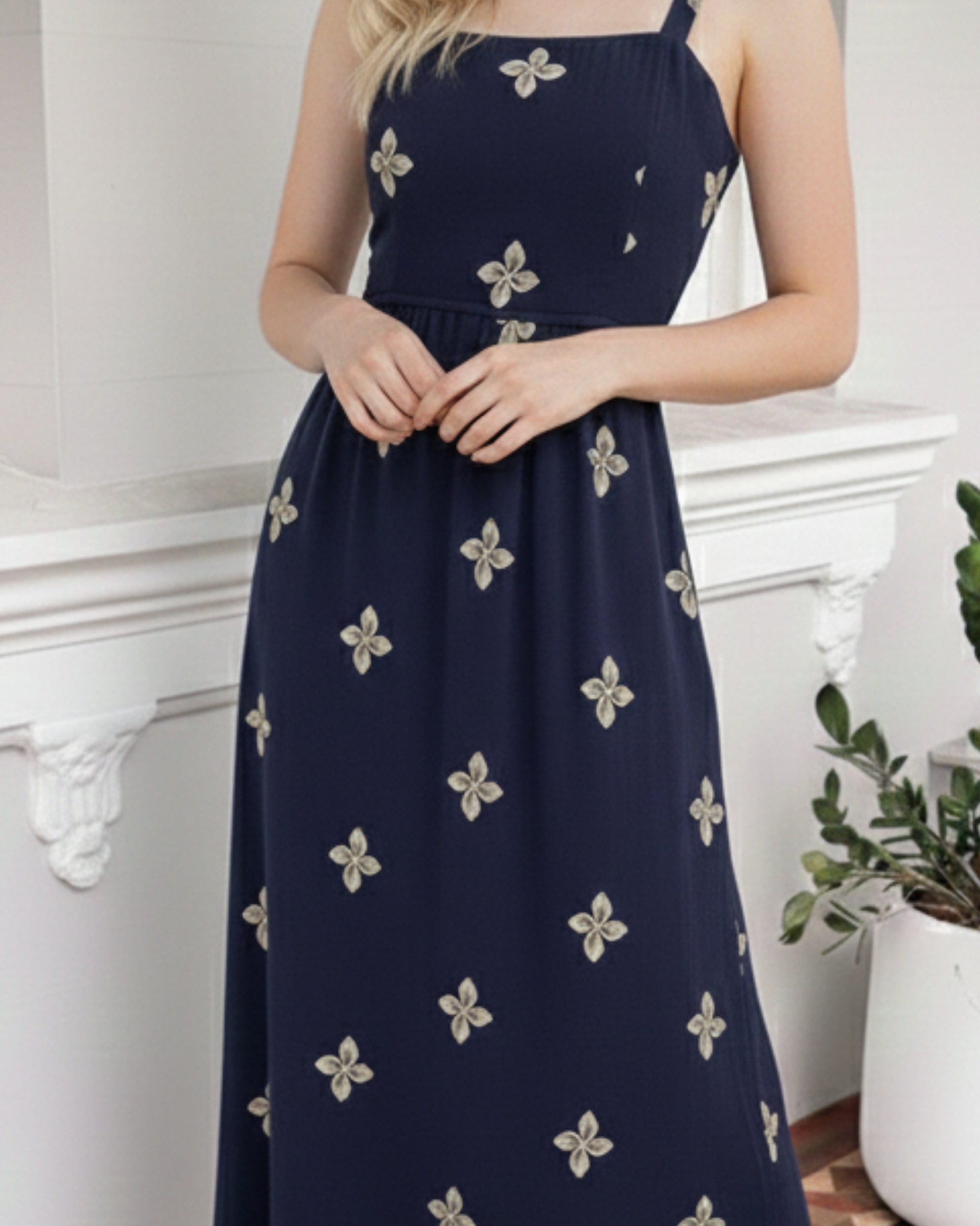 - Key Features: Crafted from a lightweight, breathable fabric, the Atasha Dress features a deep navy hue adorned with delicate, cream-colored floral embroidery that adds a soft, feminine texture. The square neckline and wide straps offer a timeless silhouette, while the structured bodice flows into a relaxed, tiered skirt that moves beautifully with every step.