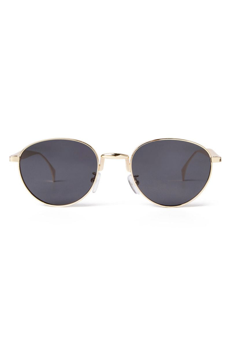 The Avon | Black sunglasses offer a classic and minimalist appeal. They feature a sleek gold-tone metal frame with perfectly round, dark black/grey-tinted lenses. These stylish shades combine timeless design with subtle sophistication, ideal for adding a chic touch to any look while providing eye protection.