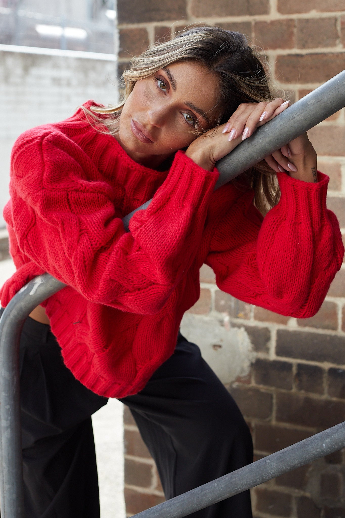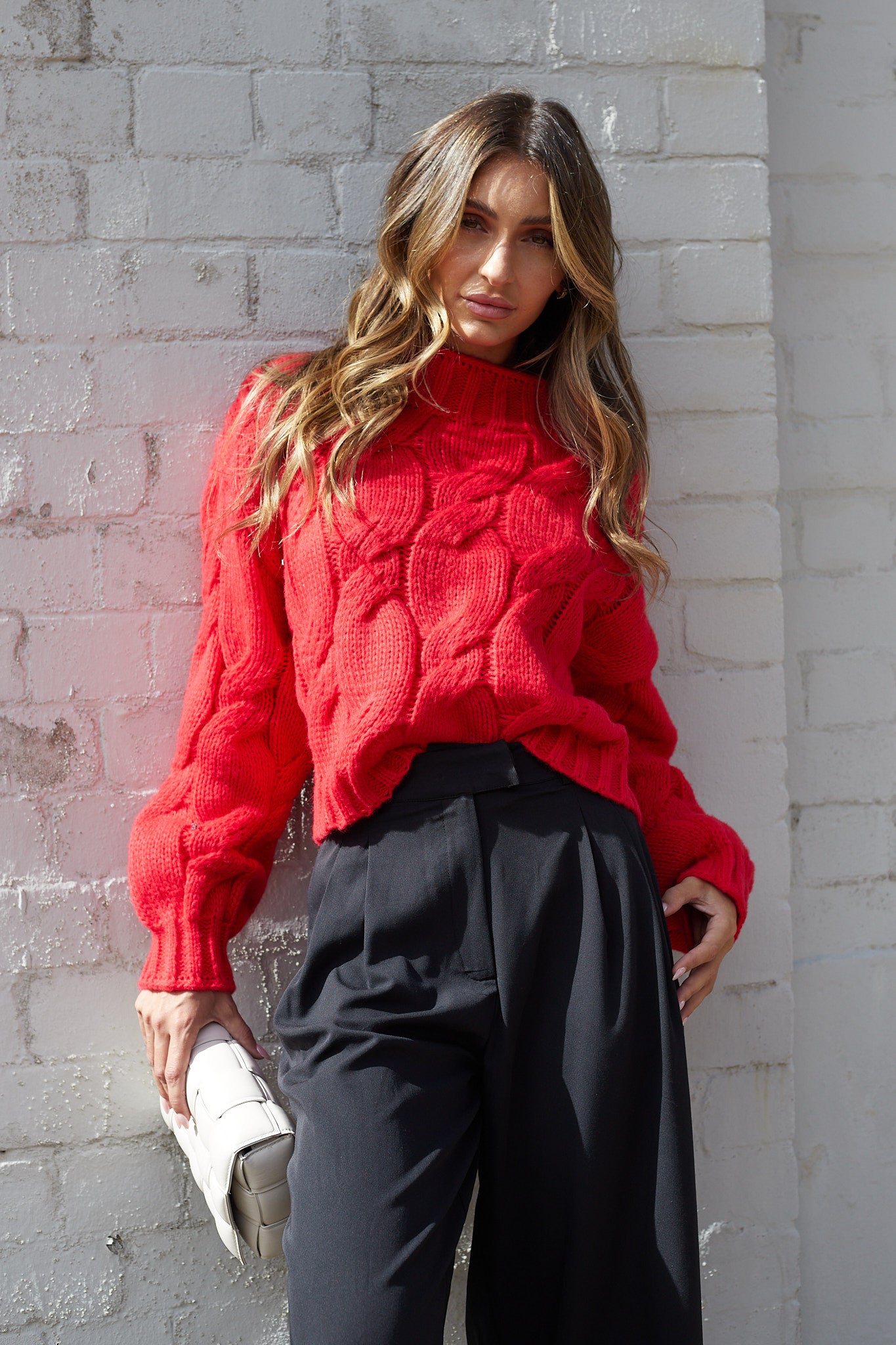 Our Hadi Knit comes in a rich red hue. Turn heads with this captivating knit, featuring a high round neckline, long extended sleeves, a relaxed fit, and textured fabric. Effortlessly chic and comfortable, it pairs perfectly with straight-leg jeans for an easy, casual look.